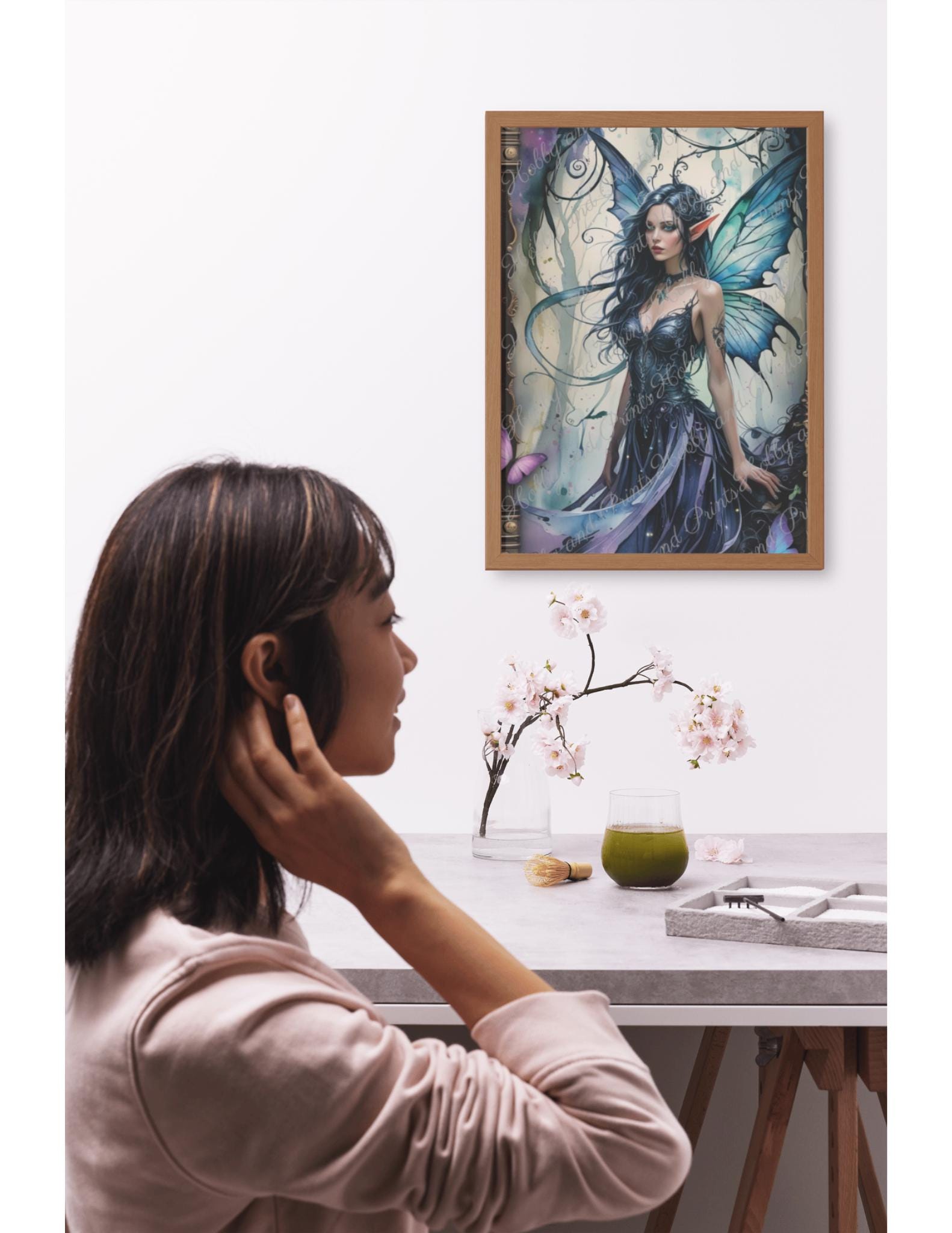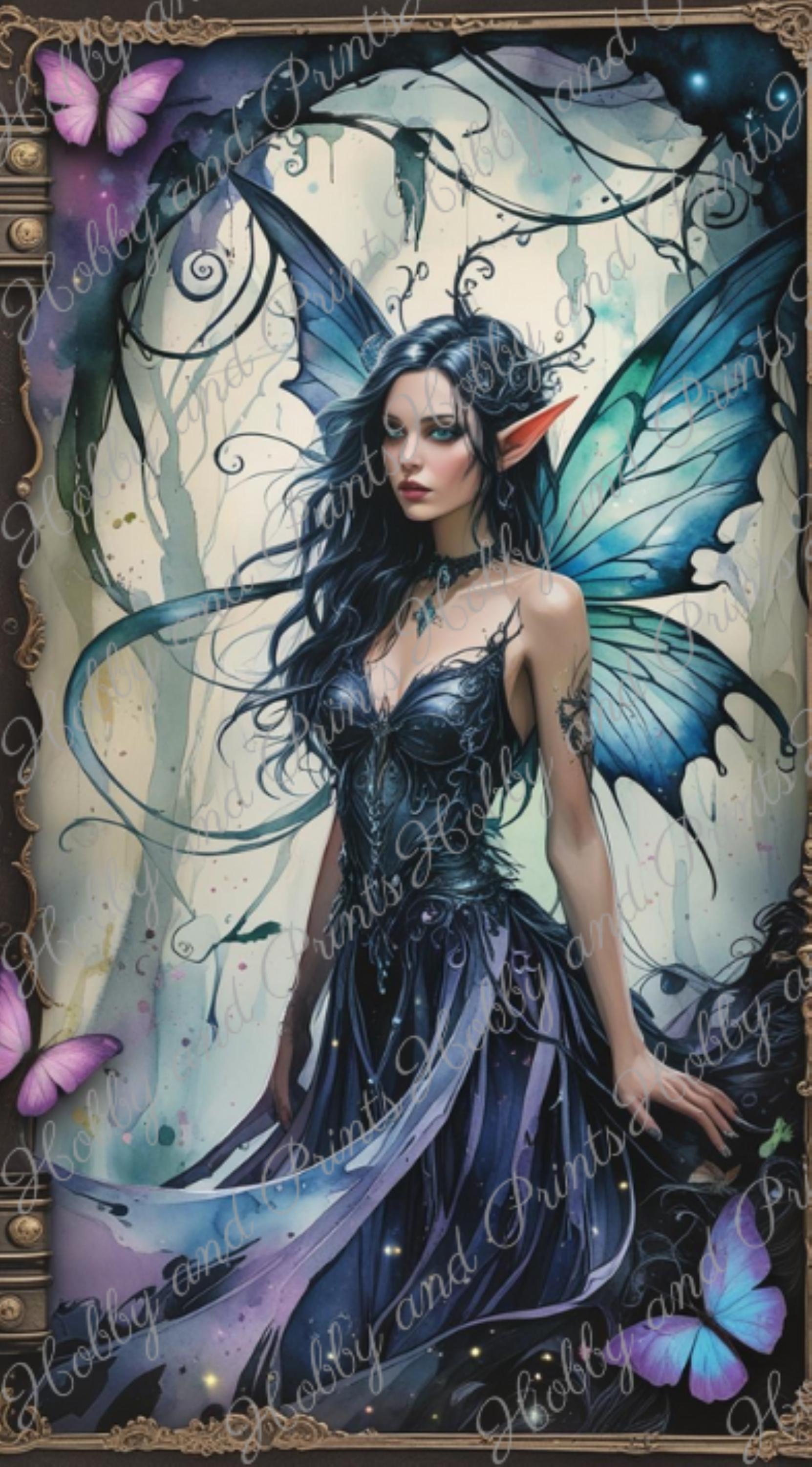 This stunning diamond painting depicts a mysterious elf woman with sparkling blue butterfly wings in a magical forest. Her elegant, dark dress and the vibrant butterflies surrounding her make this motif a true highlight for fantasy and art lovers.