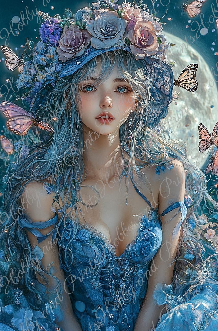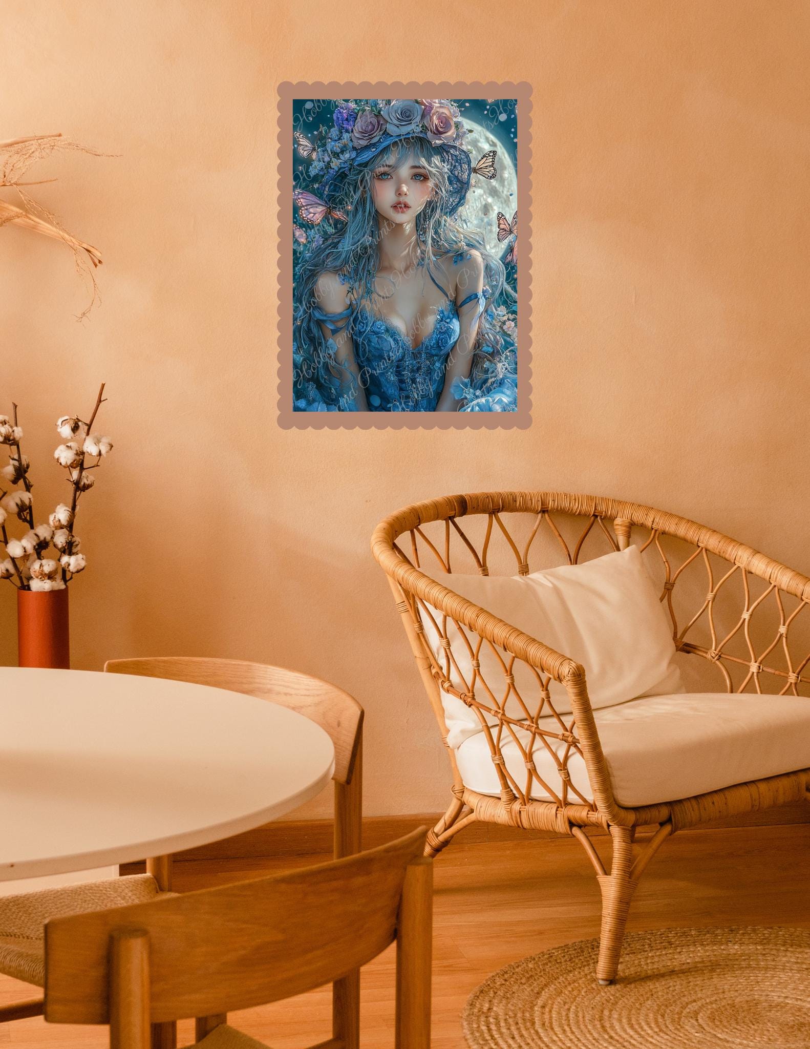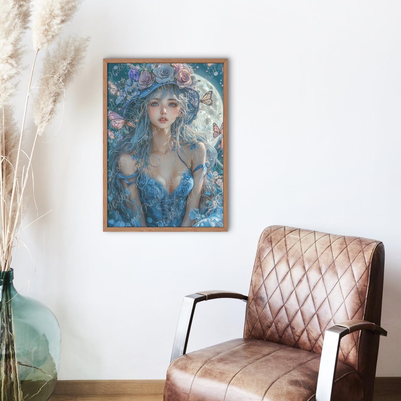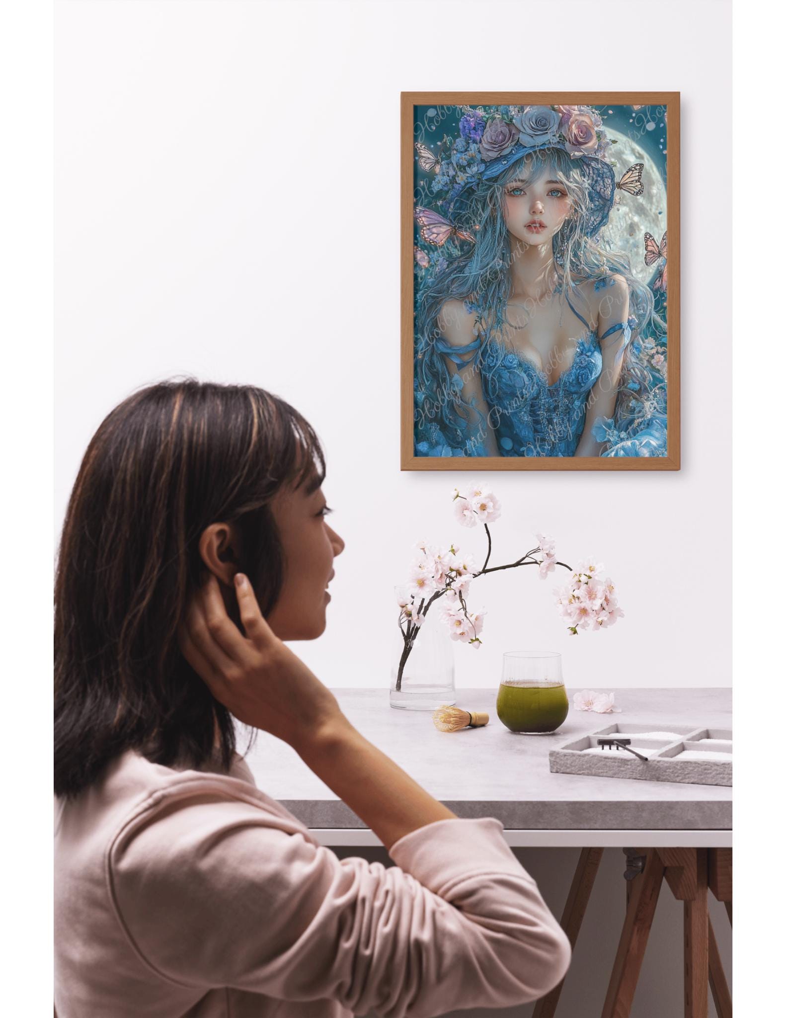 This captivating full size diamond painting depicts a stylish woman in a flowing blue dress, wearing an elegant hat, surrounded by delicate, flying butterflies – a work of art that exudes calm, elegance, and lightness. This full-size motif brings magic to your home and is perfect as a relaxing DIY project or creative gift.
