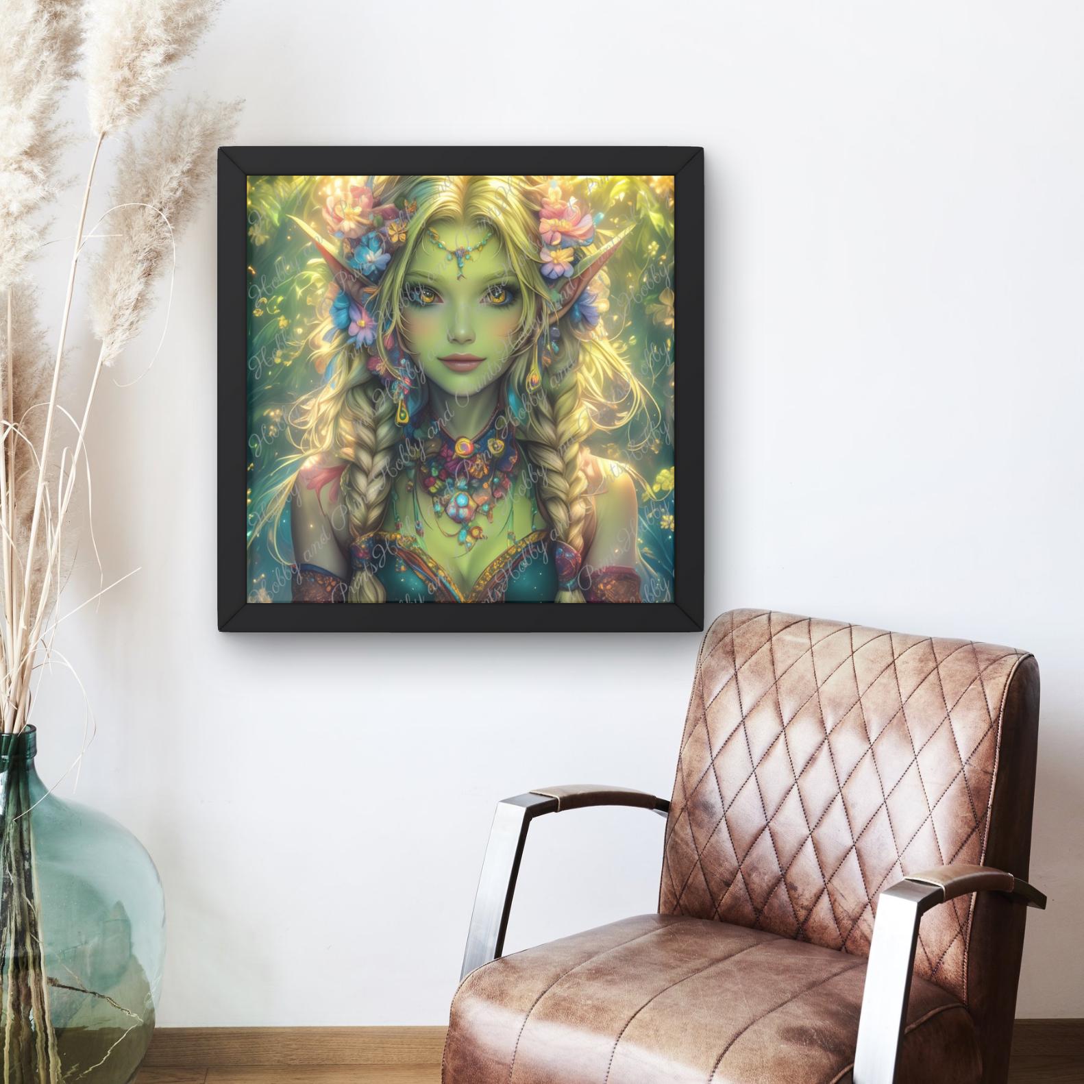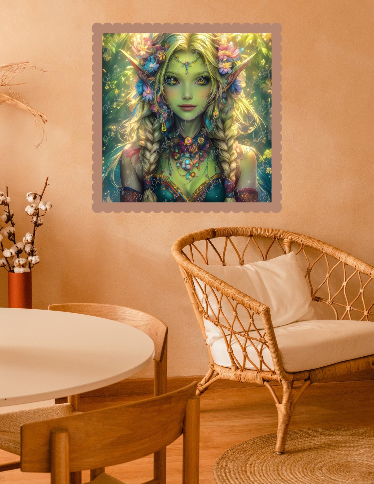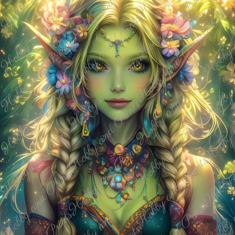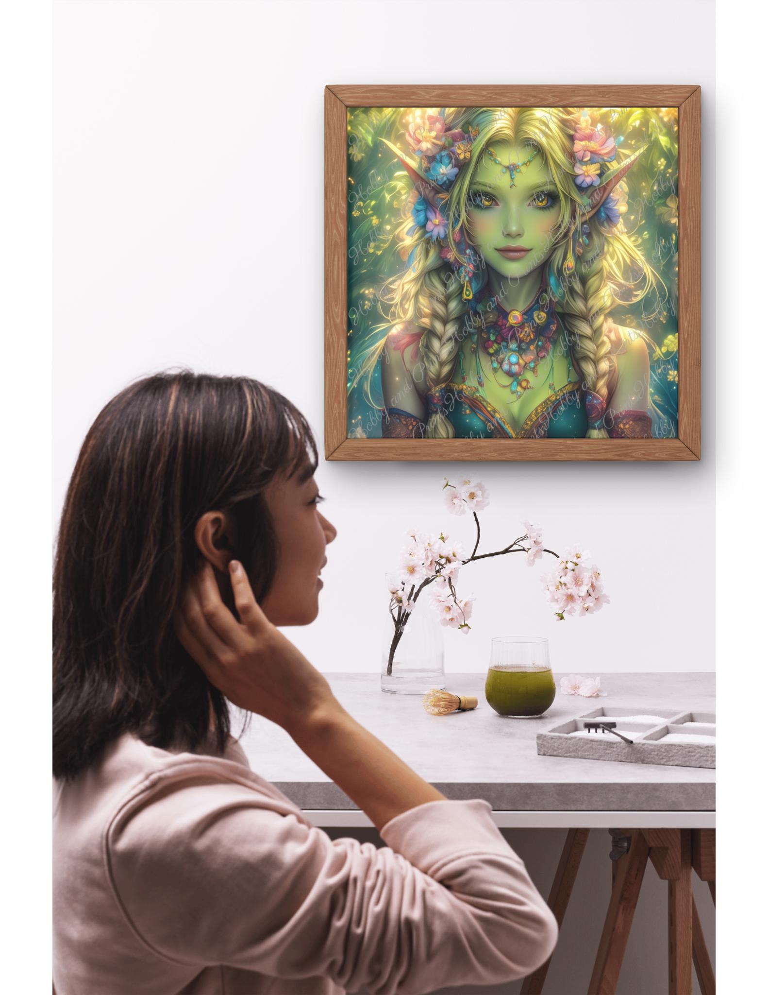 The motif depicts a young fairy with green skin, long, pointed ears, and bright yellow eyes, surrounded by a natural environment full of light and life. A special work of art for fantasy and anime lovers!