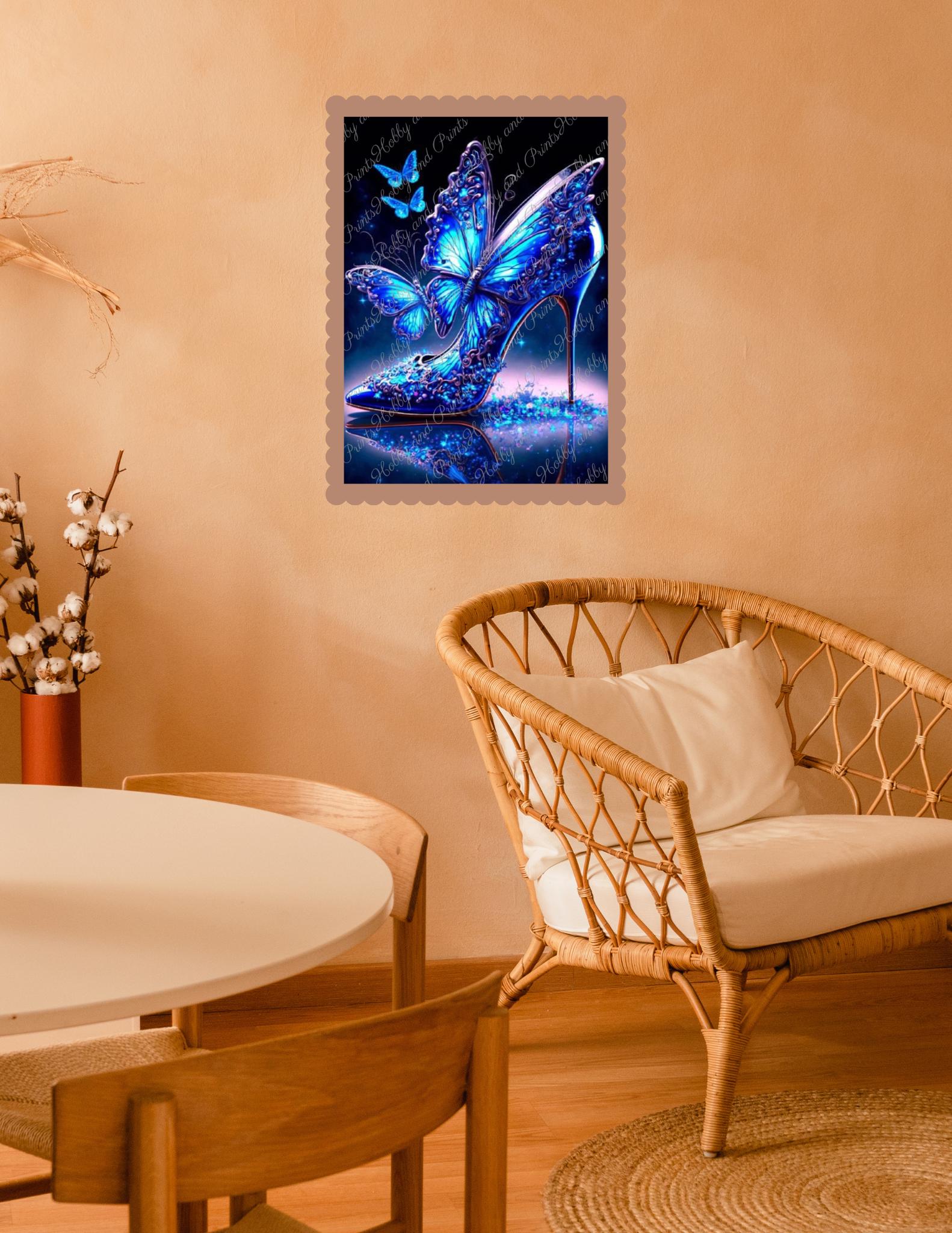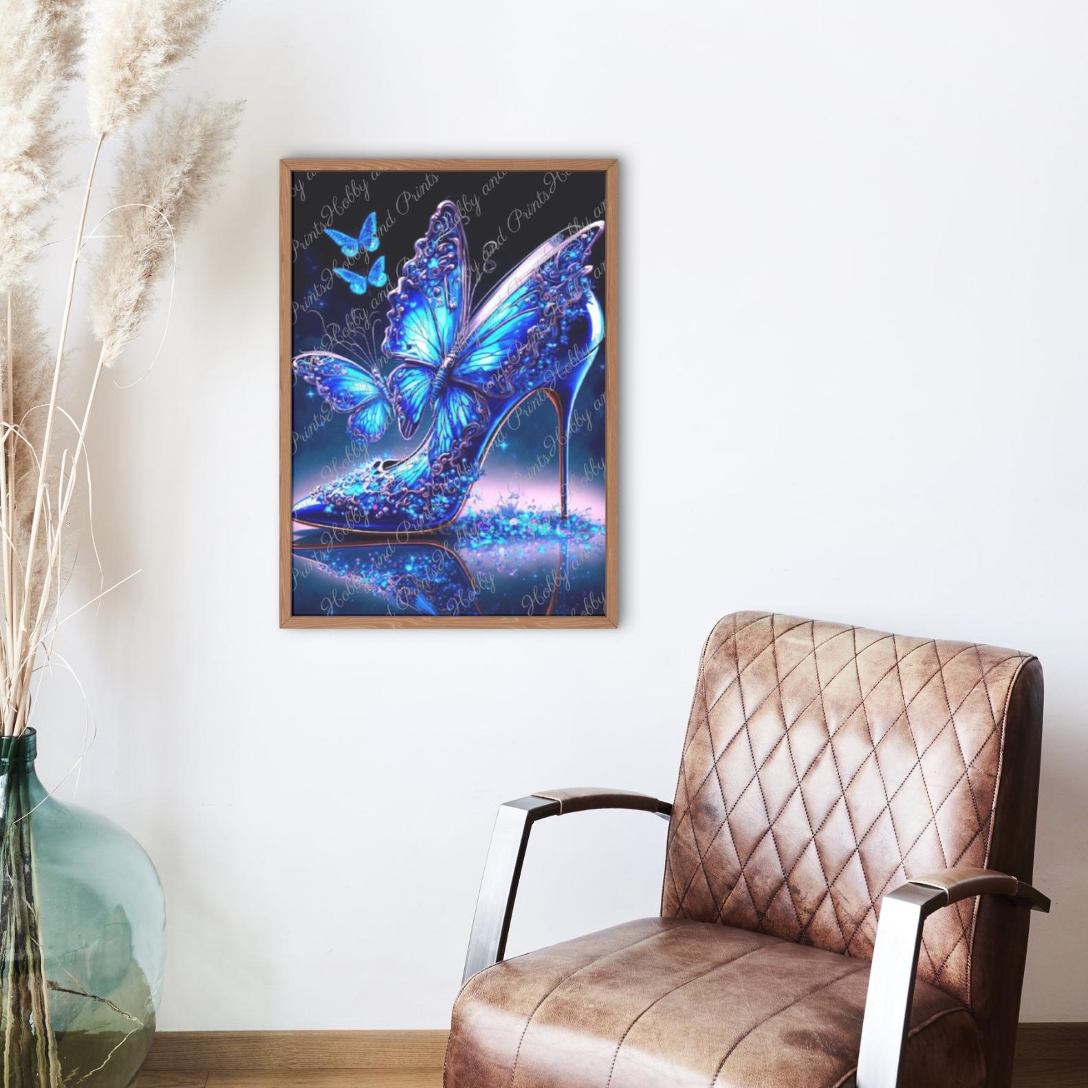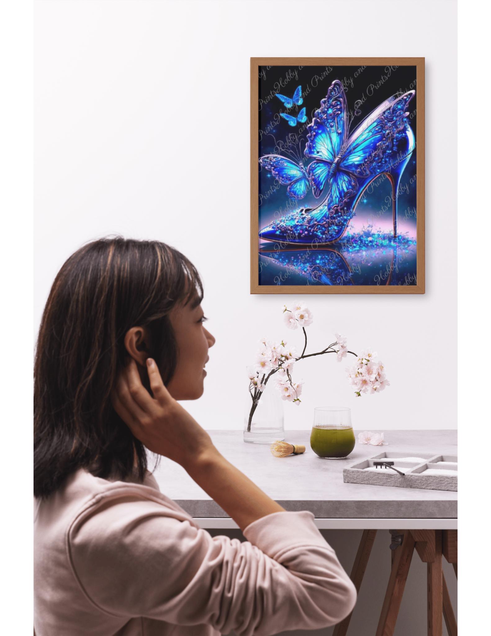 Verleihen Sie Ihrem Zuhause einen Hauch von Magie mit diesem atemberaubenden Diamantbild „Schmetterlingsschuh“. Das Motiv zeigt einen fantasievollen blauen High Heel, kunstvoll verziert mit leuchtenden Schmetterlingen und zarten Details. Ein echter Hingucker für alle, die Glitzer, Fantasie und Eleganz lieben.