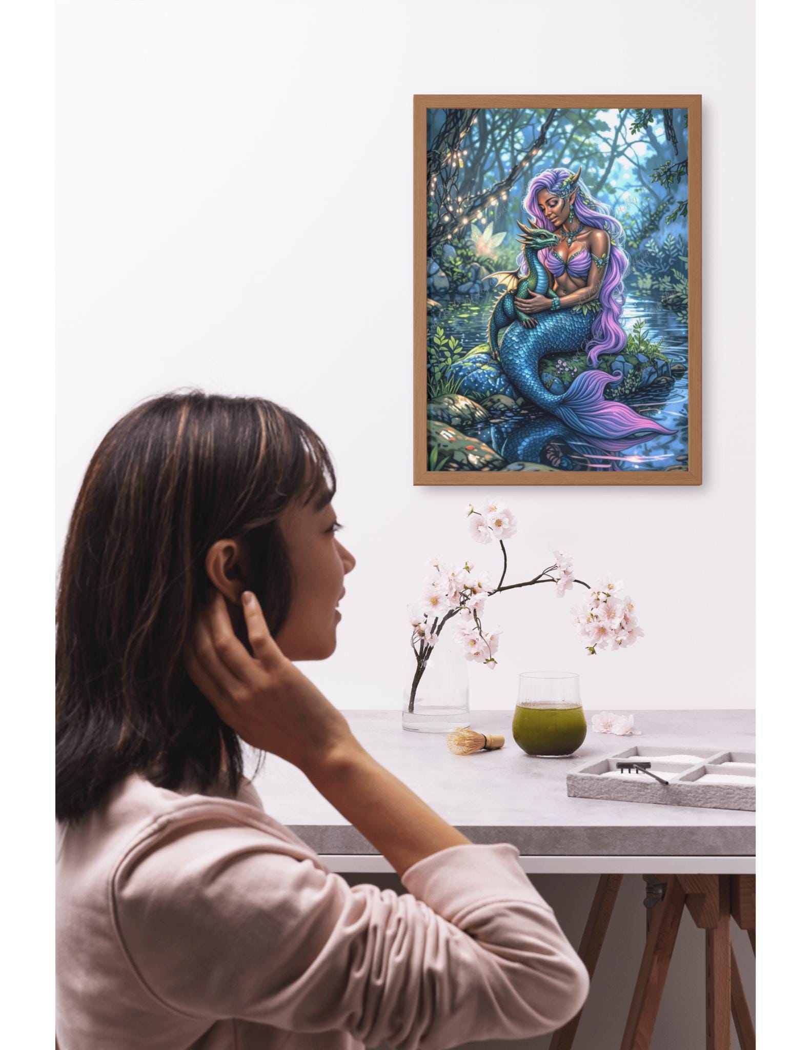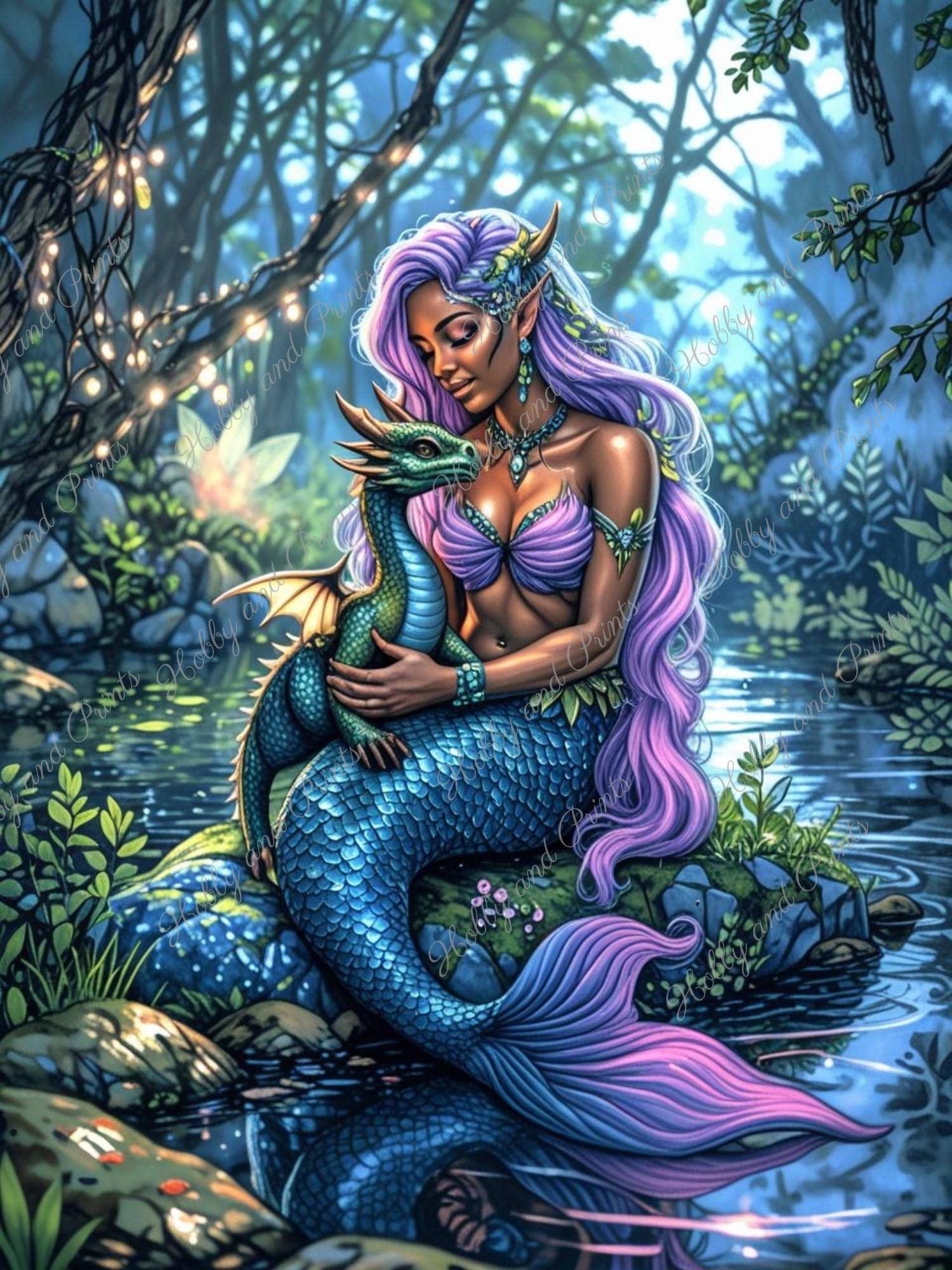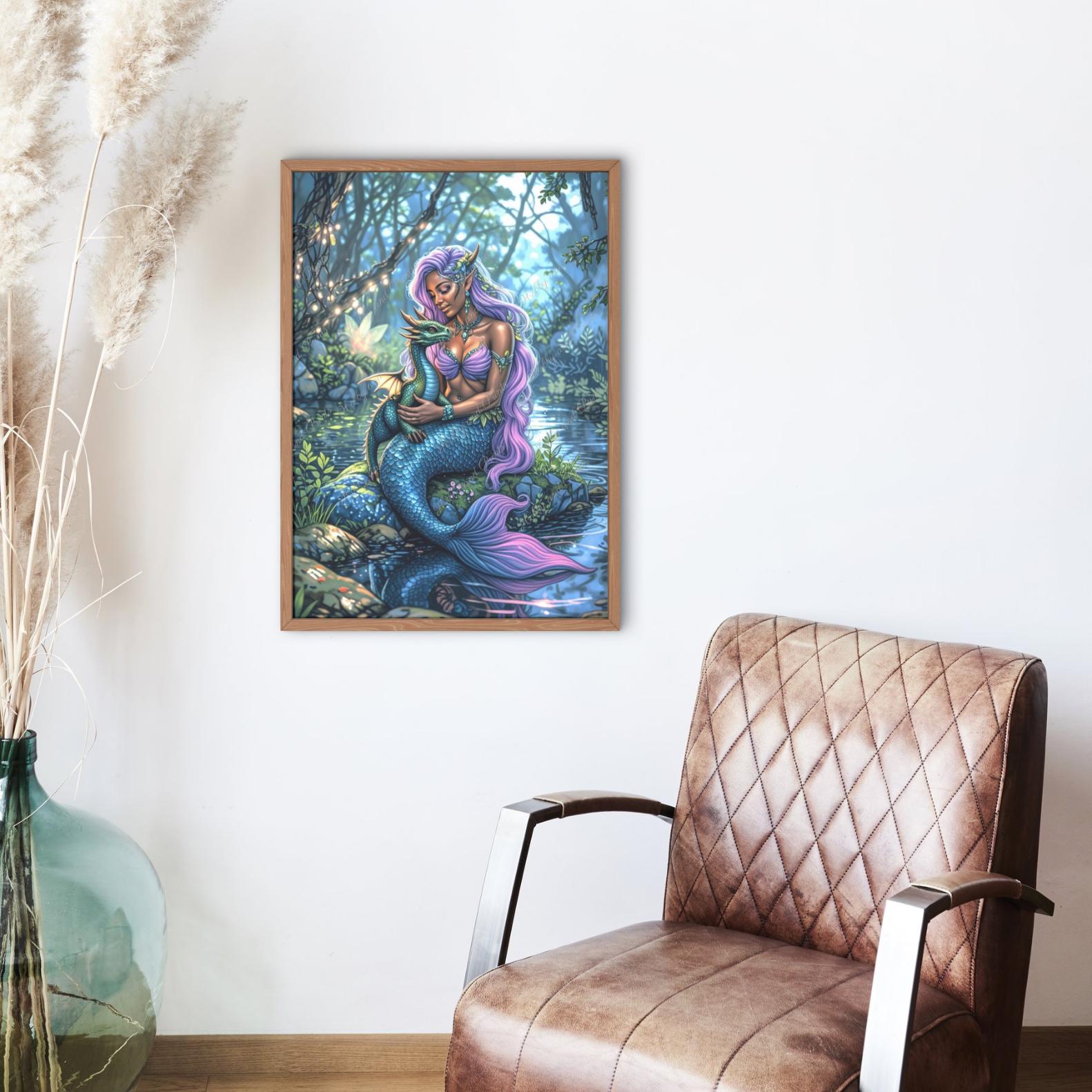 Tauchen Sie ein in eine magische Fantasiewelt! Dieses detailreiche Diamantgemälde zeigt eine wunderschöne Meerjungfrau mit langem, wallendem Haar, die liebevoll einen kleinen Drachen im Arm hält. Inmitten einer märchenhaften Waldlichtung am Wasser verzaubert die Szene mit leuchtenden Farben und einer mystischen Atmosphäre.