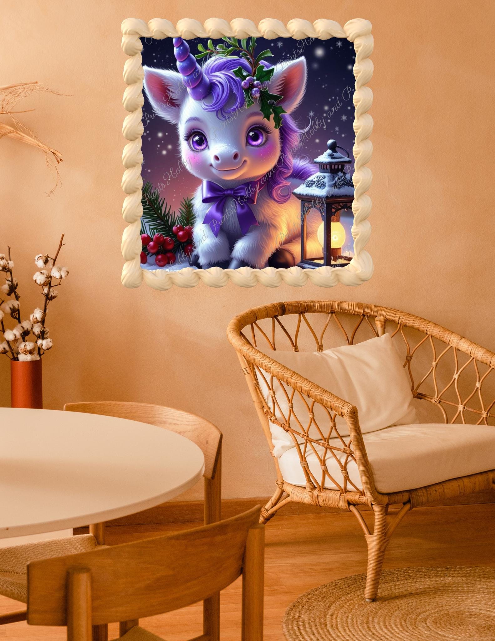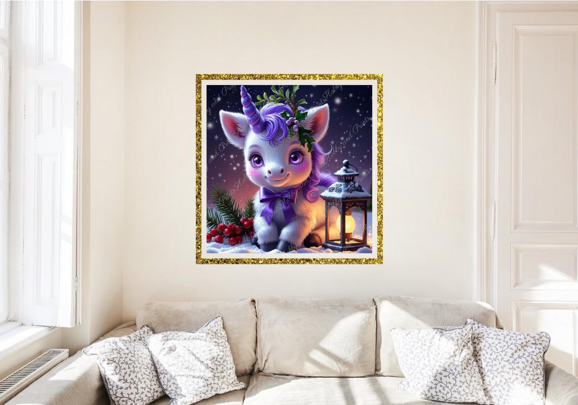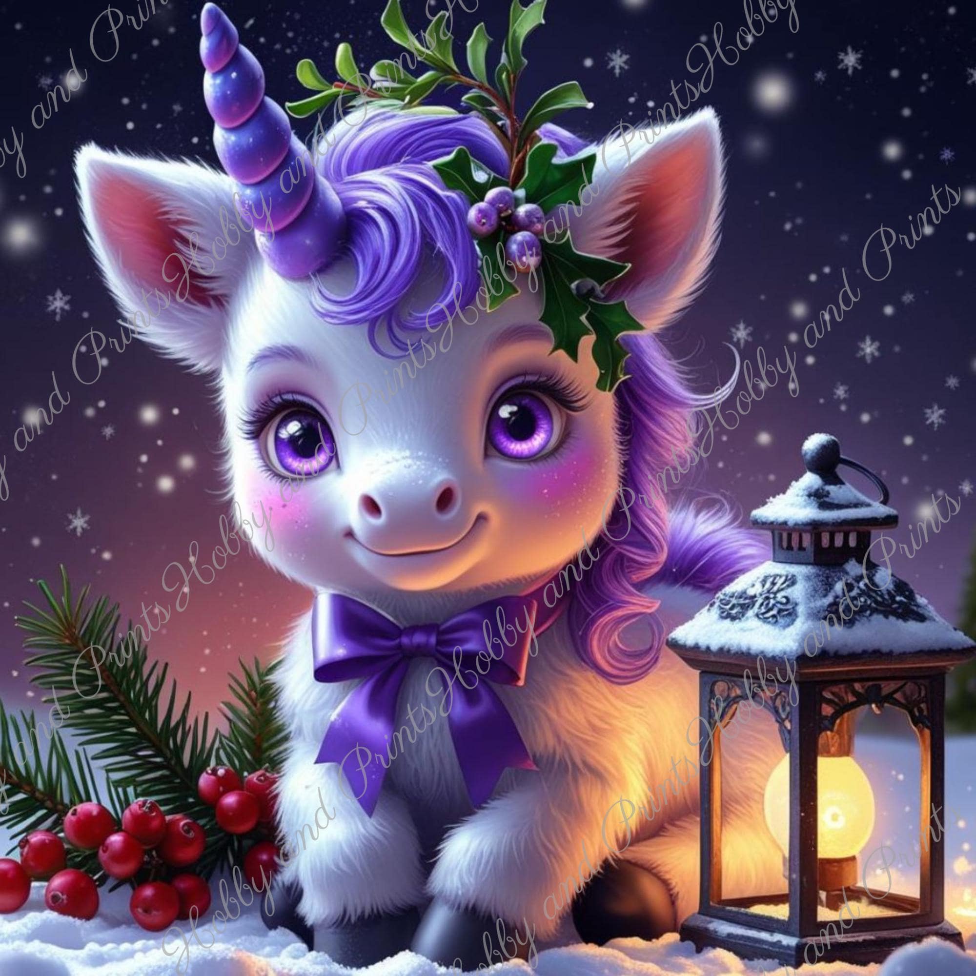 This enchanting unicorn with bright purple eyes, a purple bow, and festive decorations brings winter magic right into your home! With its charming gaze and atmospheric lantern, it's the perfect motif for your next 5D diamond painting project – to give as a gift or keep for yourself.