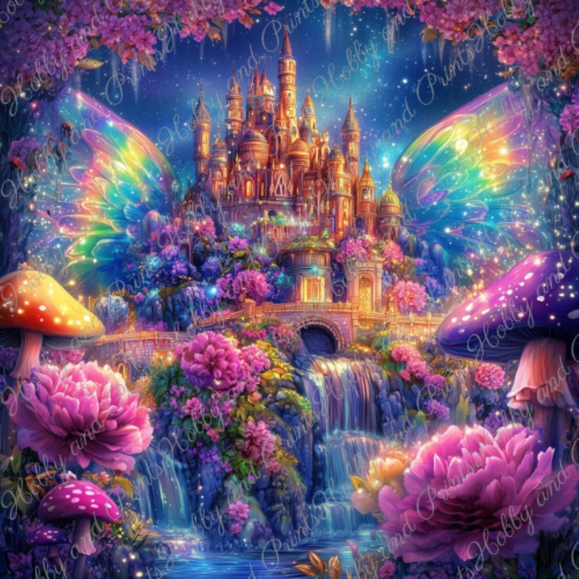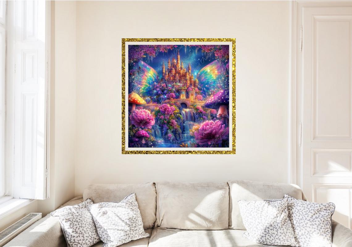 This picture combines delicate colors like white, purple, and pink with a touch of heaven and magic β perfect for creative souls and fantasy lovers. Discover a magical world with the "Fairytale Castle in the Enchanted Forest" diamond painting β a detailed work of art that will transport you to a vibrant fantasy world full of color and sparkle. At its center is a golden castle with sparkling towers, nestled in a dreamy landscape with waterfalls, oversized flowers, fairy wings, and shimmering mushrooms.
