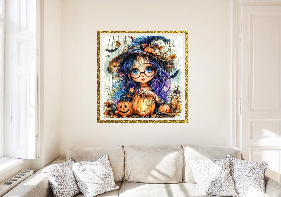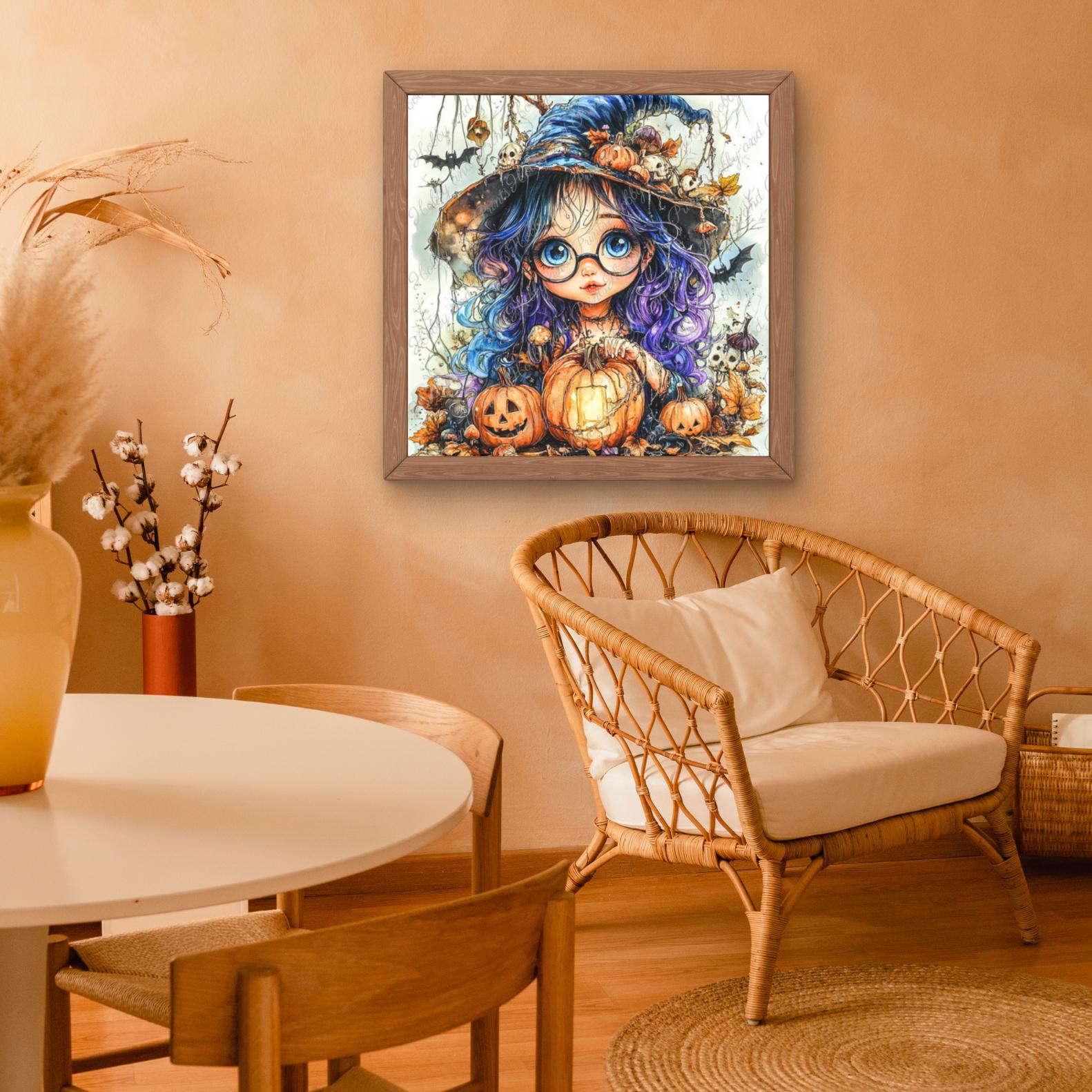 Experience the magic of Halloween with this enchanting "Little Witch with Pumpkin" diamond painting. The meticulously detailed scene depicts a sweet girl with huge blue eyes, a purple witch's hat, pumpkins, bats, and autumn leaves β a must-have for all fantasy and Halloween fans.
