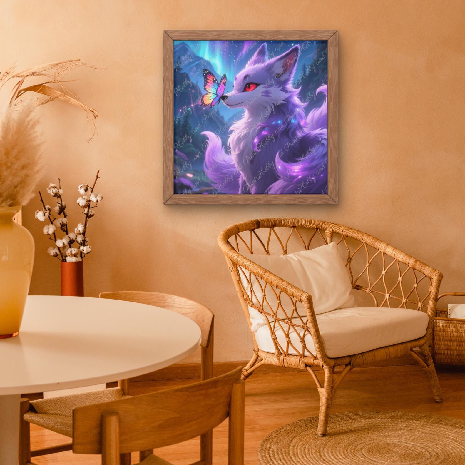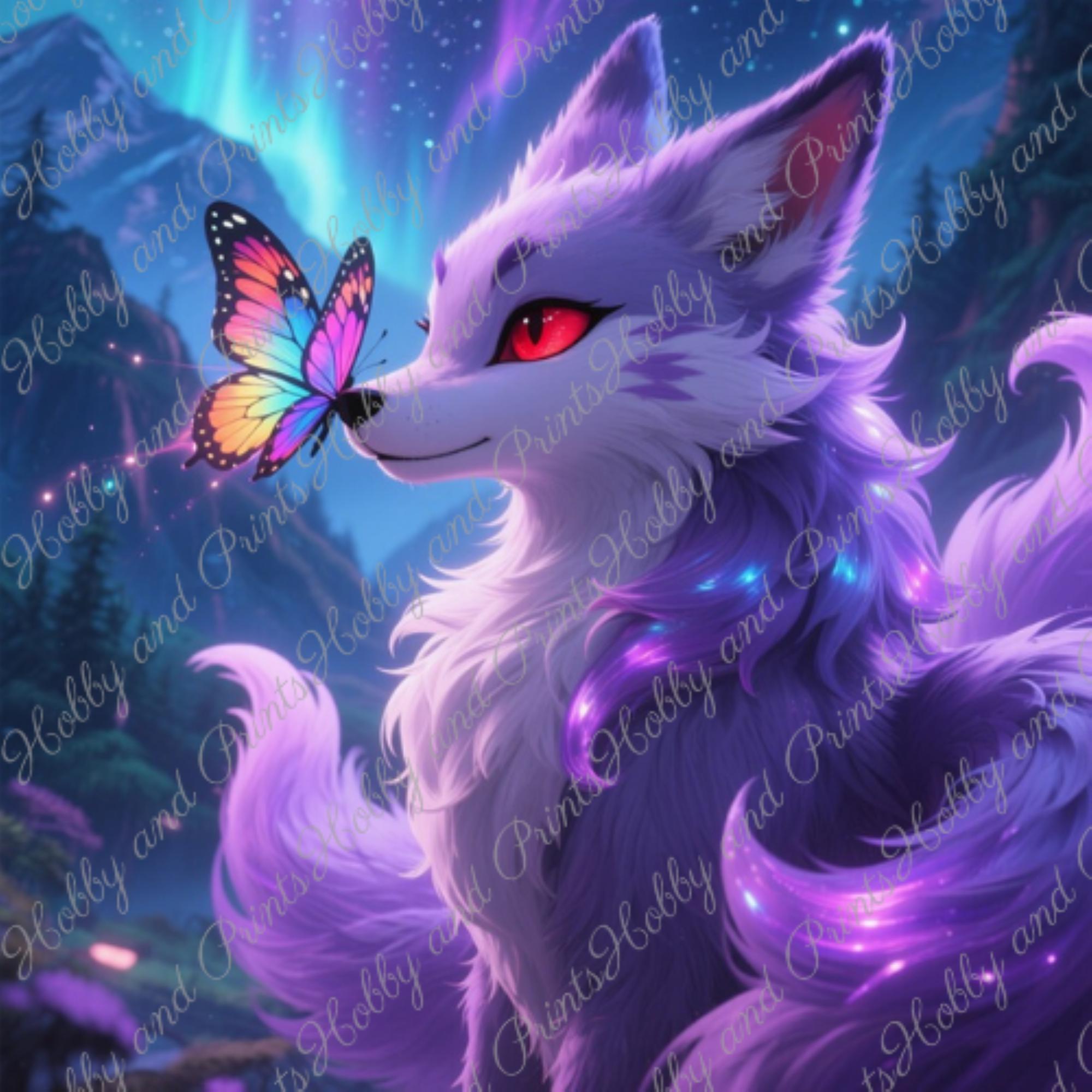 The motif depicts a mysterious purple fox with bright red eyes, sitting serenely in a mountain landscape at night. A delicate butterfly rests on its noseβa symbol of tranquility and transformation. Above, the northern lights dance gently in the sky, lending the image a mystical atmosphere.