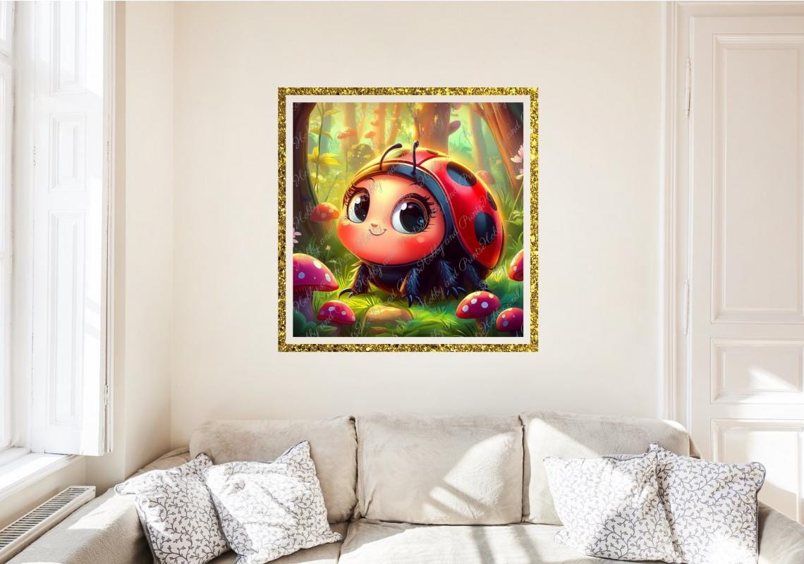 This lovingly designed motif features a cute ladybug with a friendly face, nestled in a lively forest scene β perfect for children's rooms, family projects, or as a gift for nature lovers of all ages.