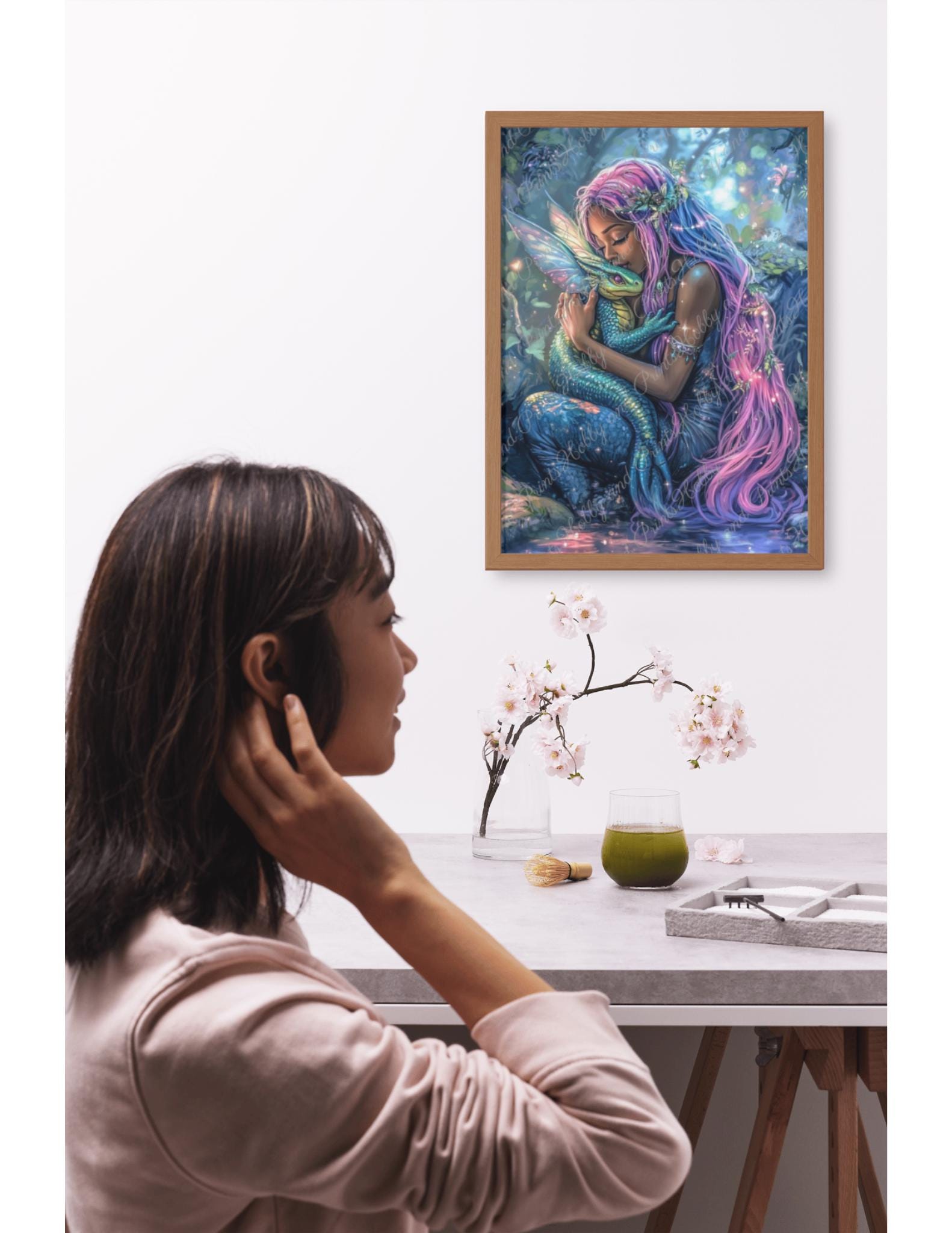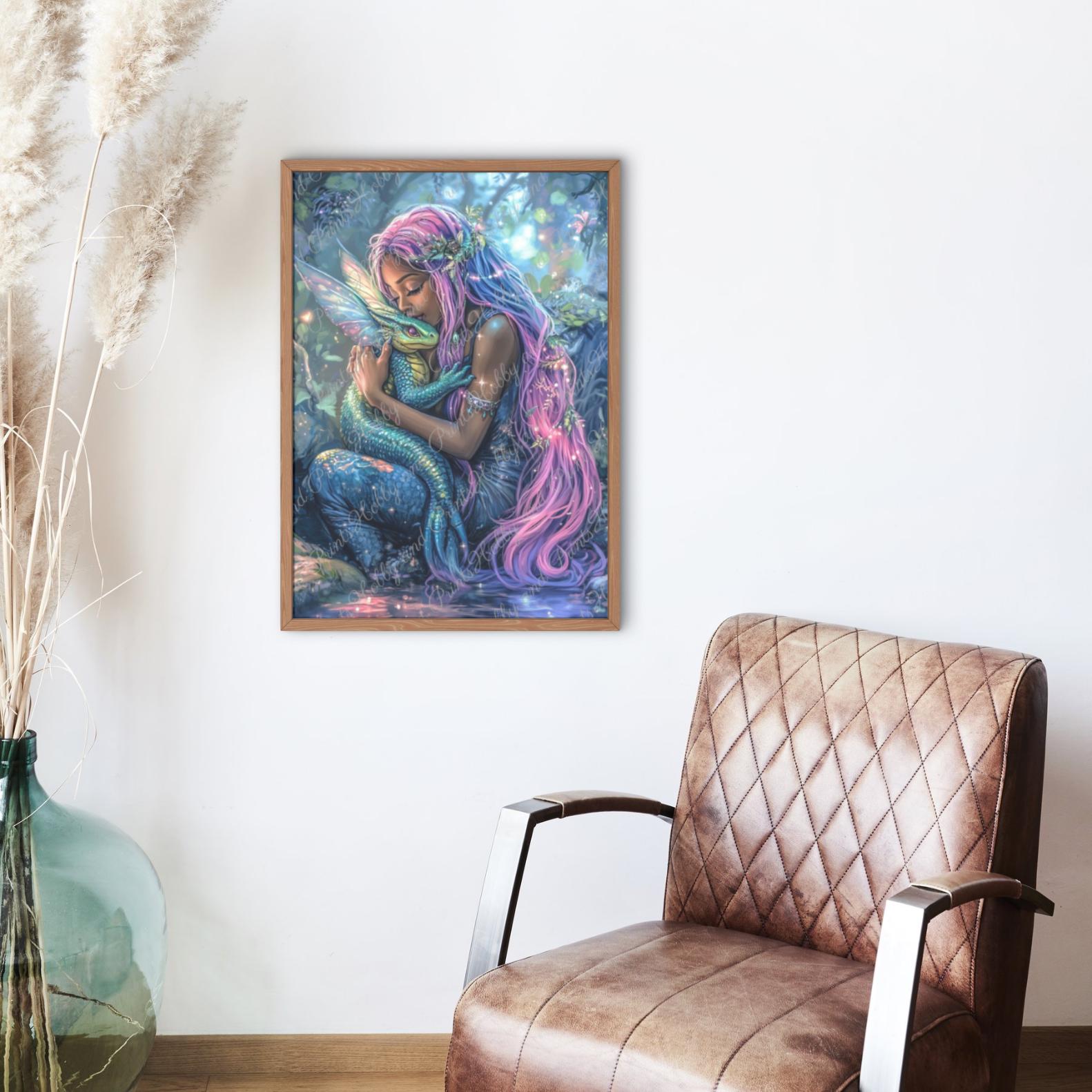 Bring magic and light into your home with the mystical diamond painting "Mermaid with Water Dragon"!
