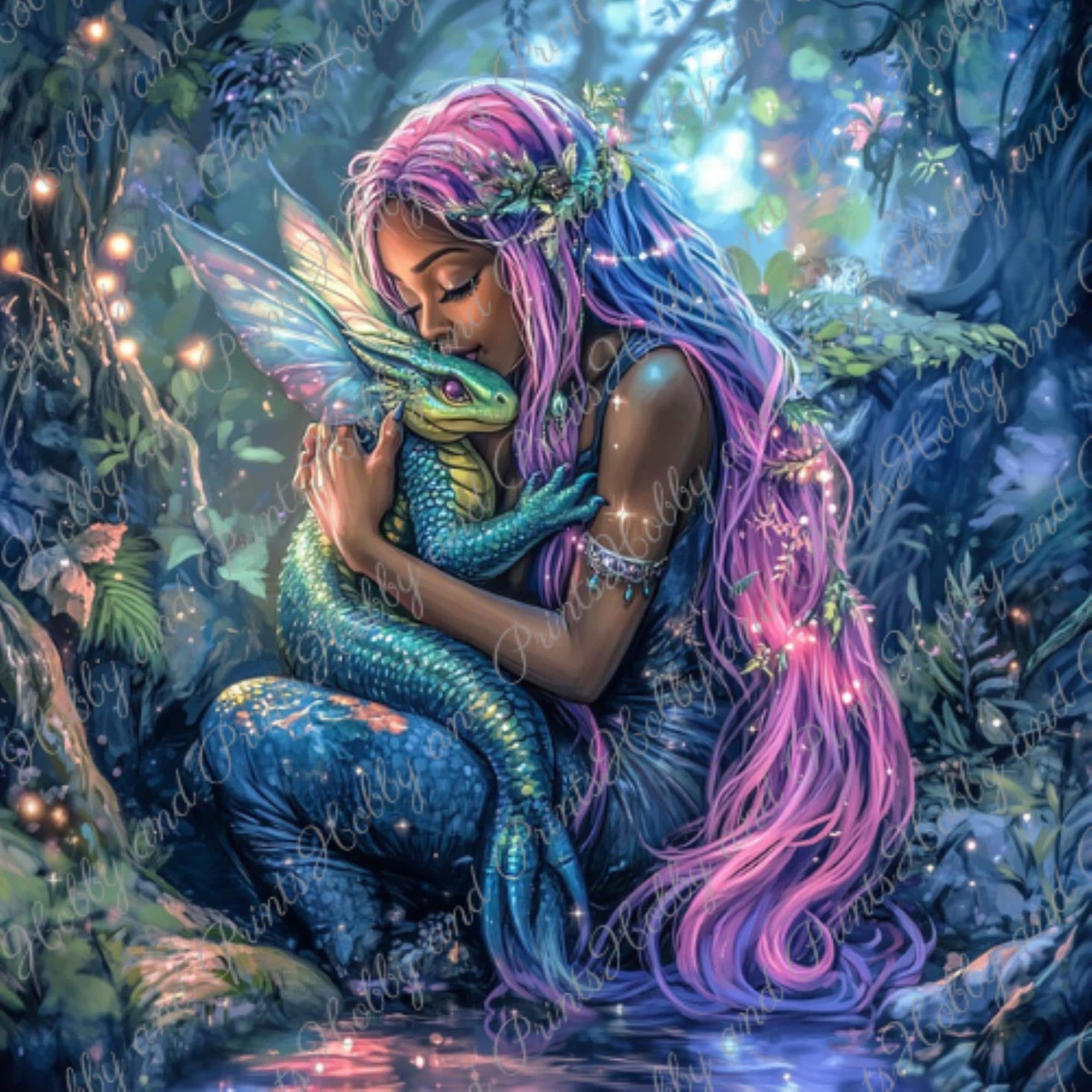 This unique motif depicts a beautiful mermaid with bright purple hair, lovingly holding a gentle water dragon in a mysterious nighttime forest.