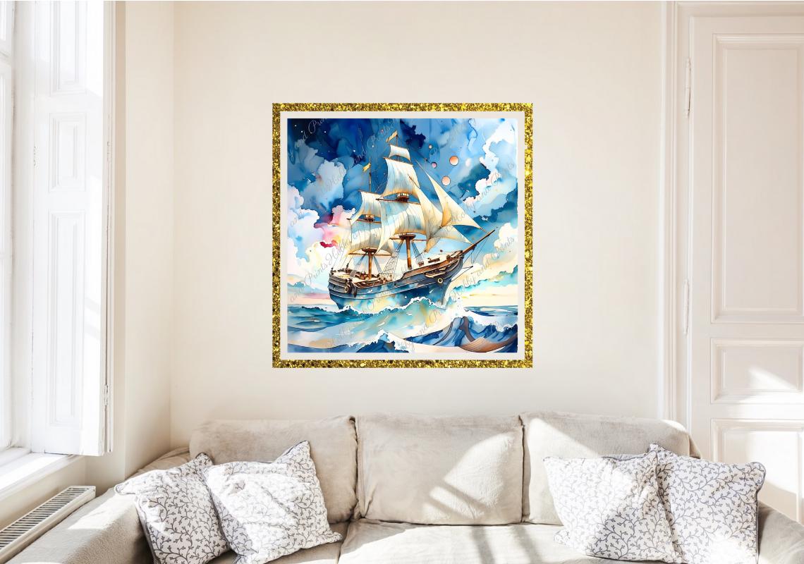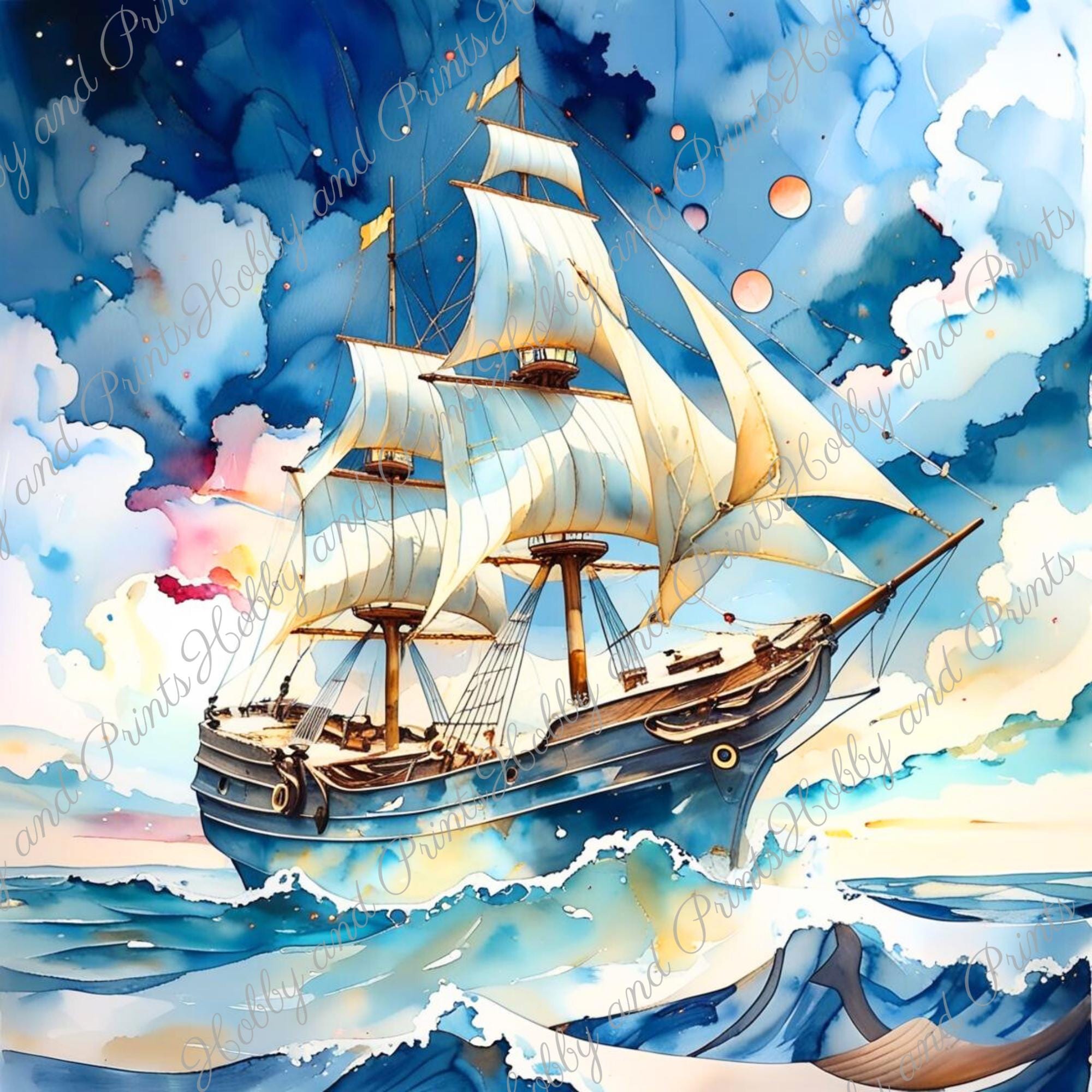 Experience the fascination of the oceans with this impressive diamond painting! The motif depicts a proud sailing ship with white sails billowing in the wind, powerfully sailing through the waves. The dramatic sky and dynamic sea make this picture a maritime work of art full of energy and a sense of adventure.
