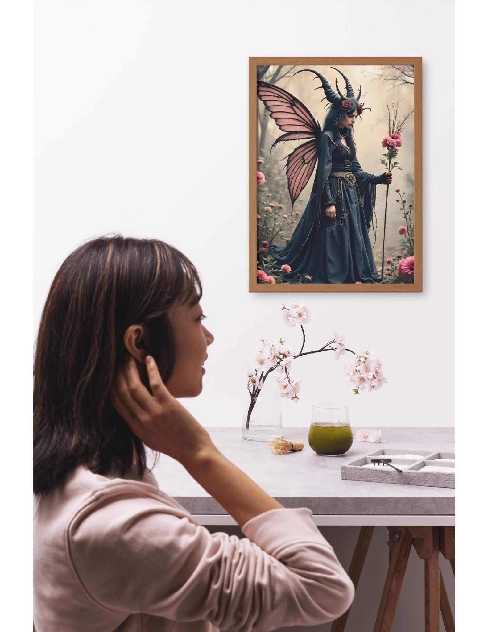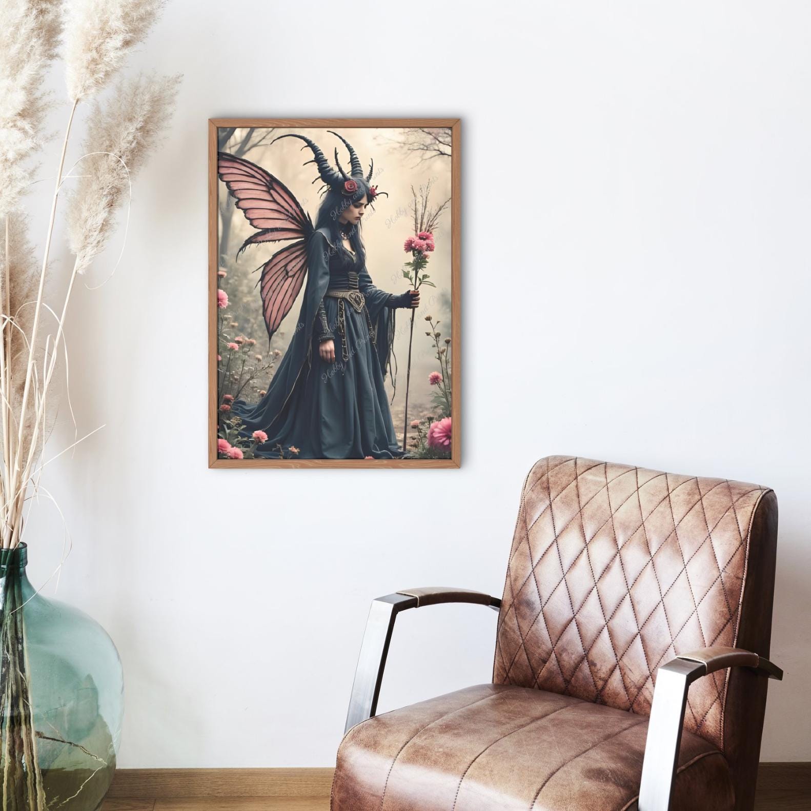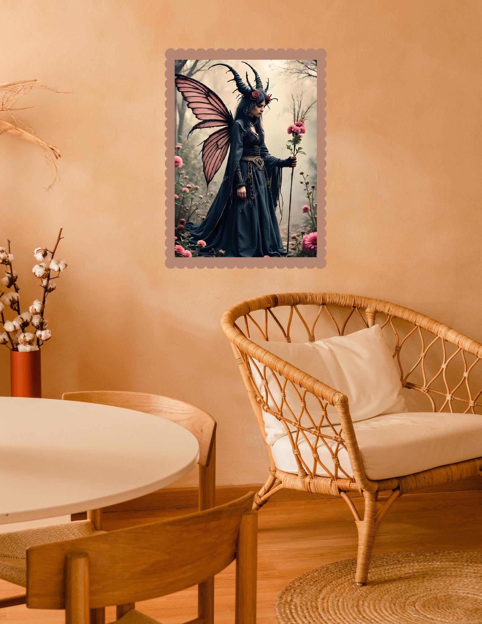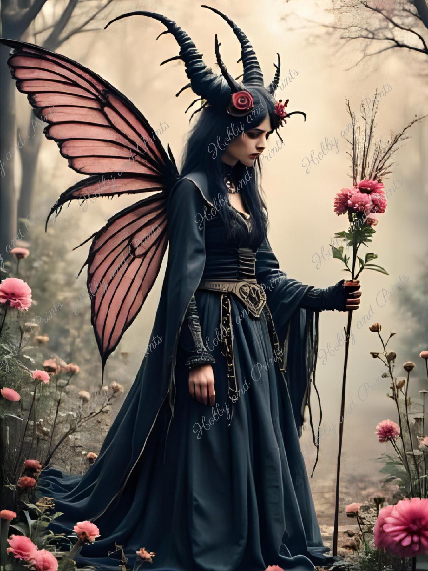 Tauchen Sie mit dieser hochwertigen Diamantmalerei „Dunkle Fee“ in die geheimnisvolle Welt der Fantasie ein. Das fesselnde Motiv zeigt eine mystische Frau mit Hörnern, rosa Feenflügeln und einem langen, eleganten Kleid – umgeben von einer geheimnisvollen Waldszene.