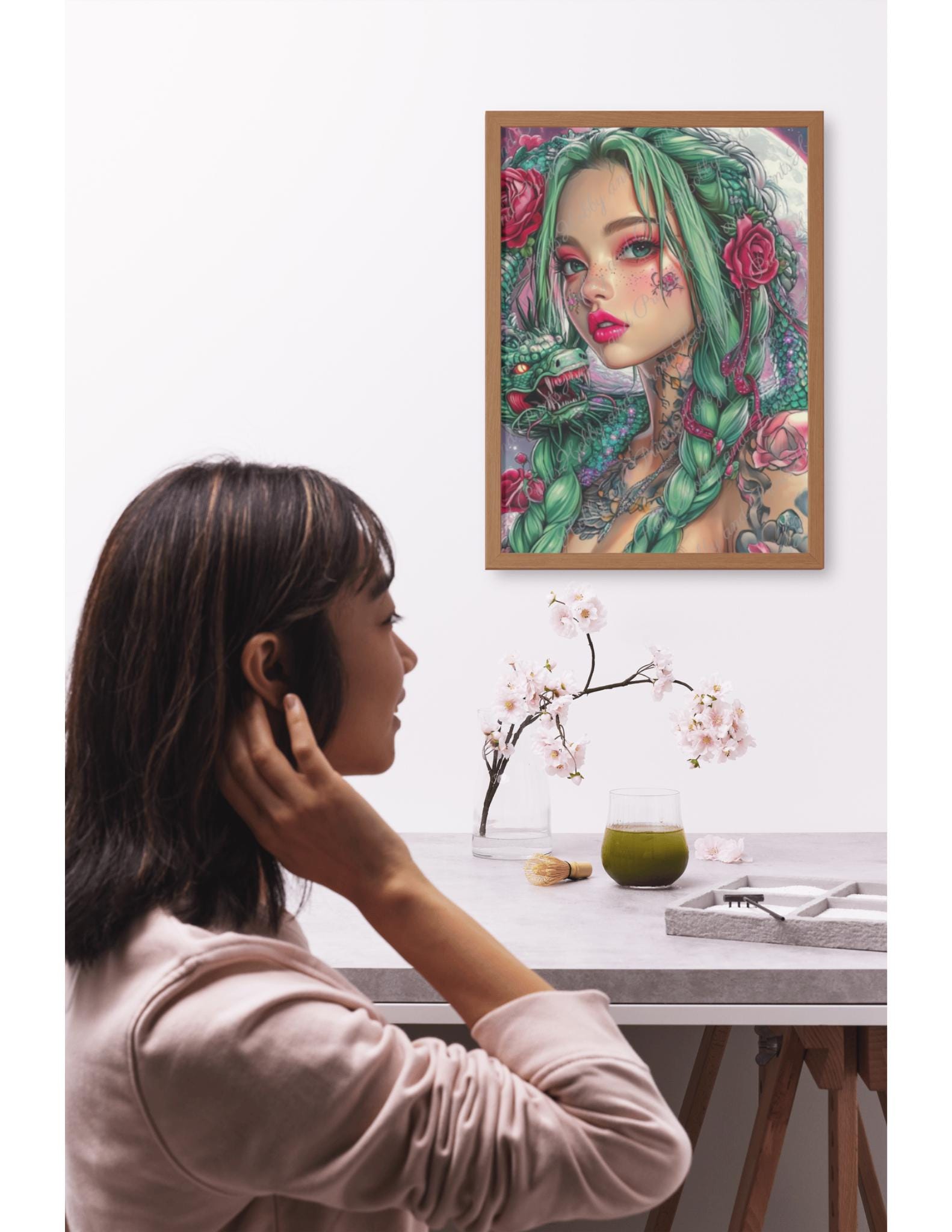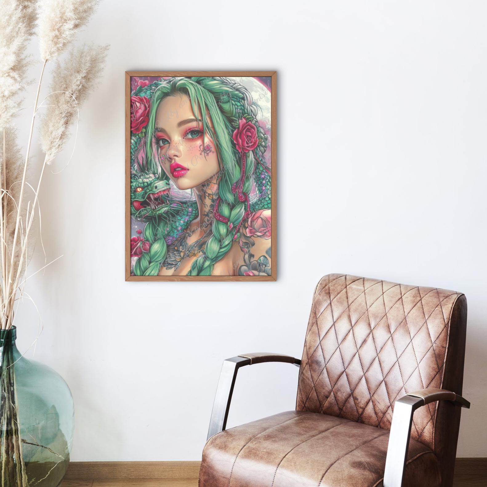 Immerse yourself in a fascinating work of art full of expression, power, and sensuality: Our high-quality diamond painting depicts a tattooed woman with green hair, a dragon, and roses β a motif that combines modern design with imagination and depth. The image is enhanced by AB stones, which add special luster with their shimmering rainbow effect.