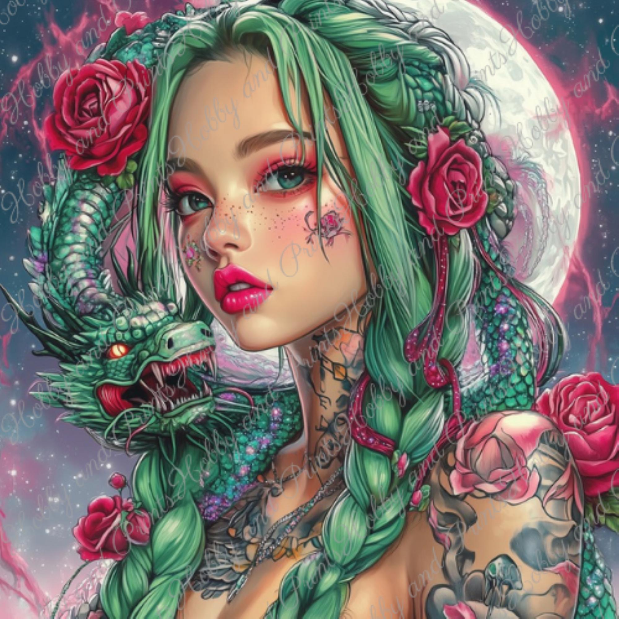 Diamond Painting: Tattooed Woman with Dragon & Roses | Green Hair | Special Stones | Square or Round Stones | Canvas Options