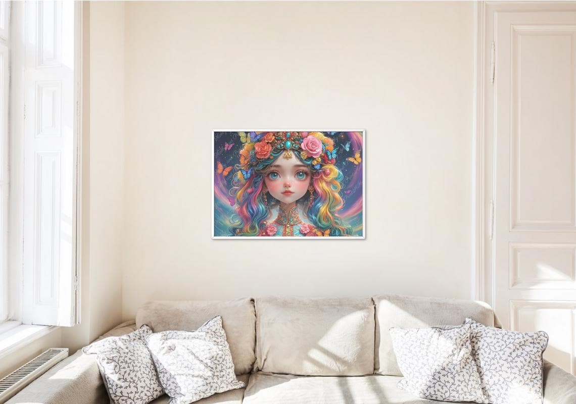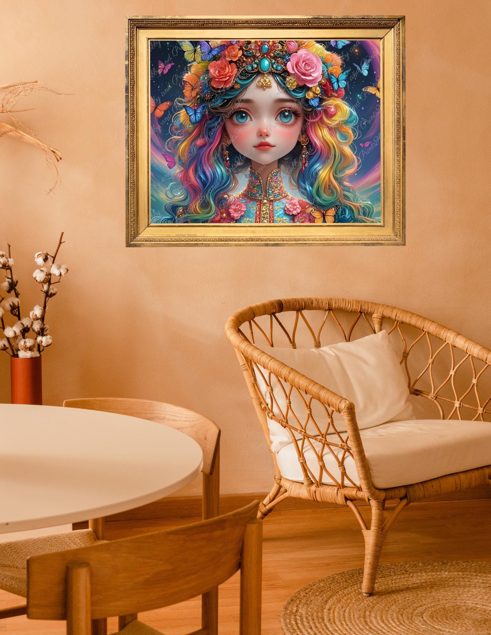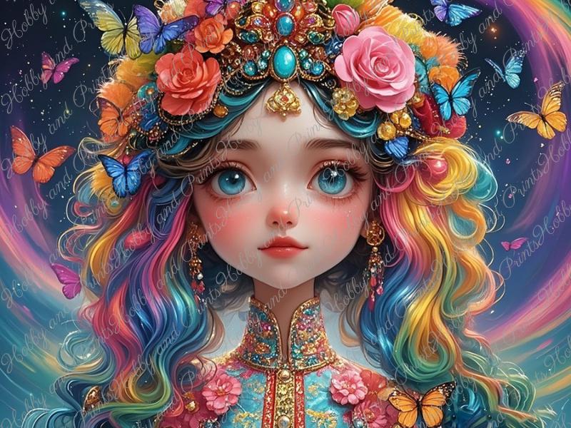 Dieses farbenfrohe Kunstwerk zeigt ein wunderschönes, fantasievolles Mädchen mit leuchtend regenbogenfarbenem Haar, geschmückt mit einer majestätischen, detailreichen Blumenkrone – umgeben von bunten Schmetterlingen und einem verträumten Sternenhimmel.