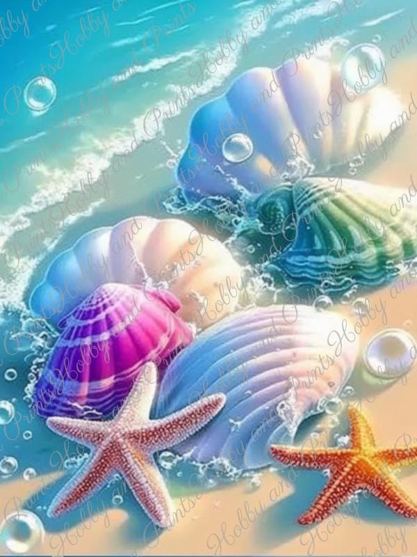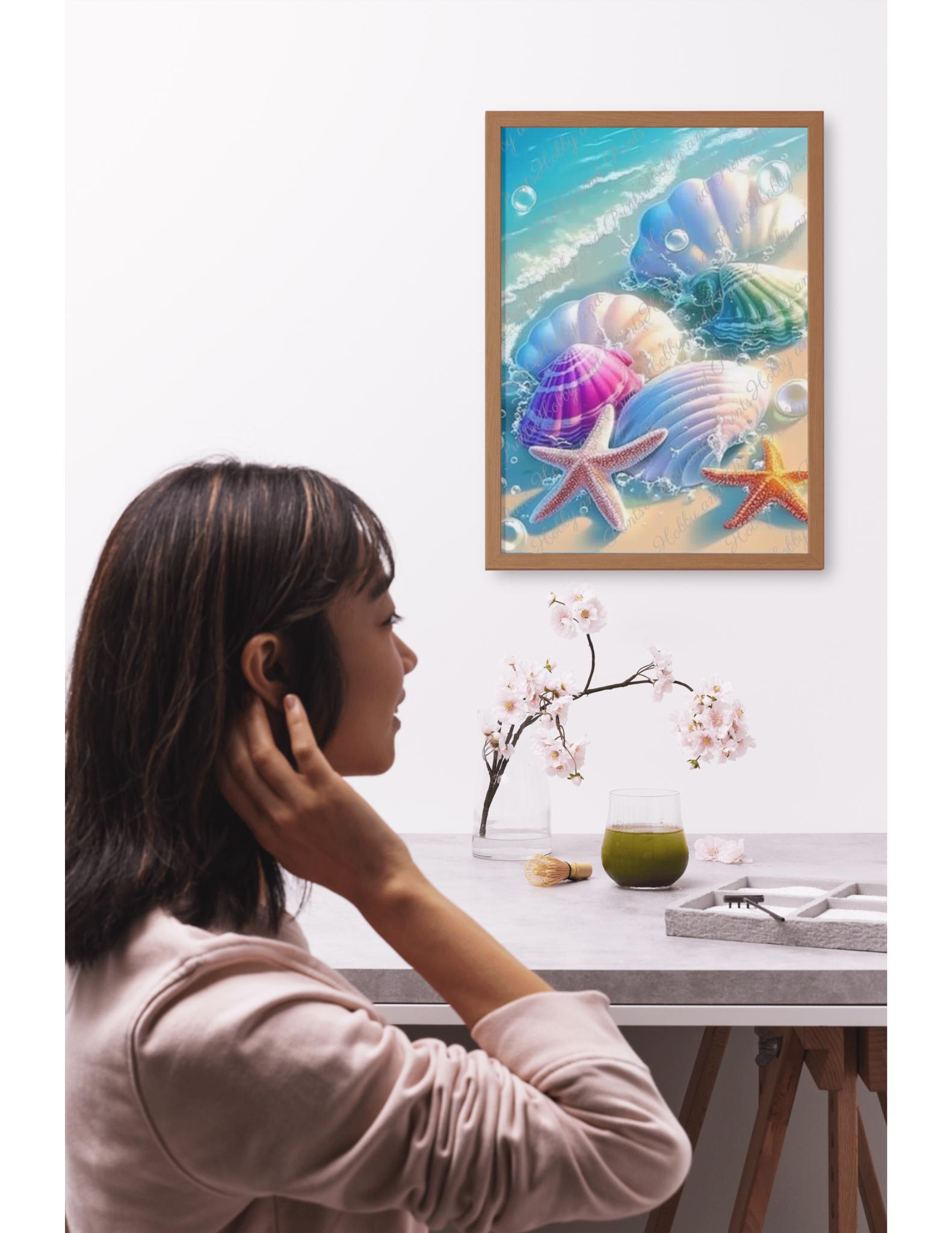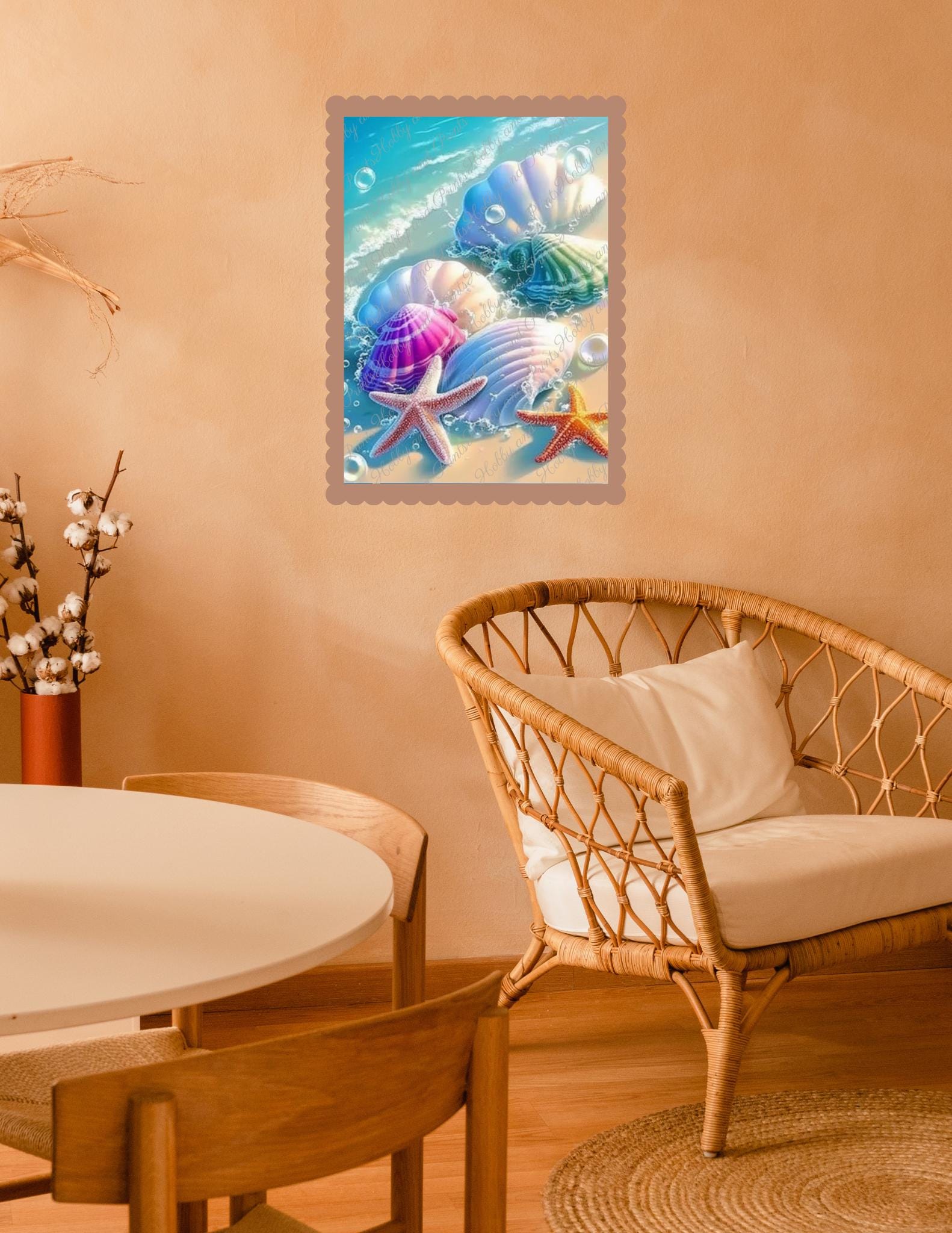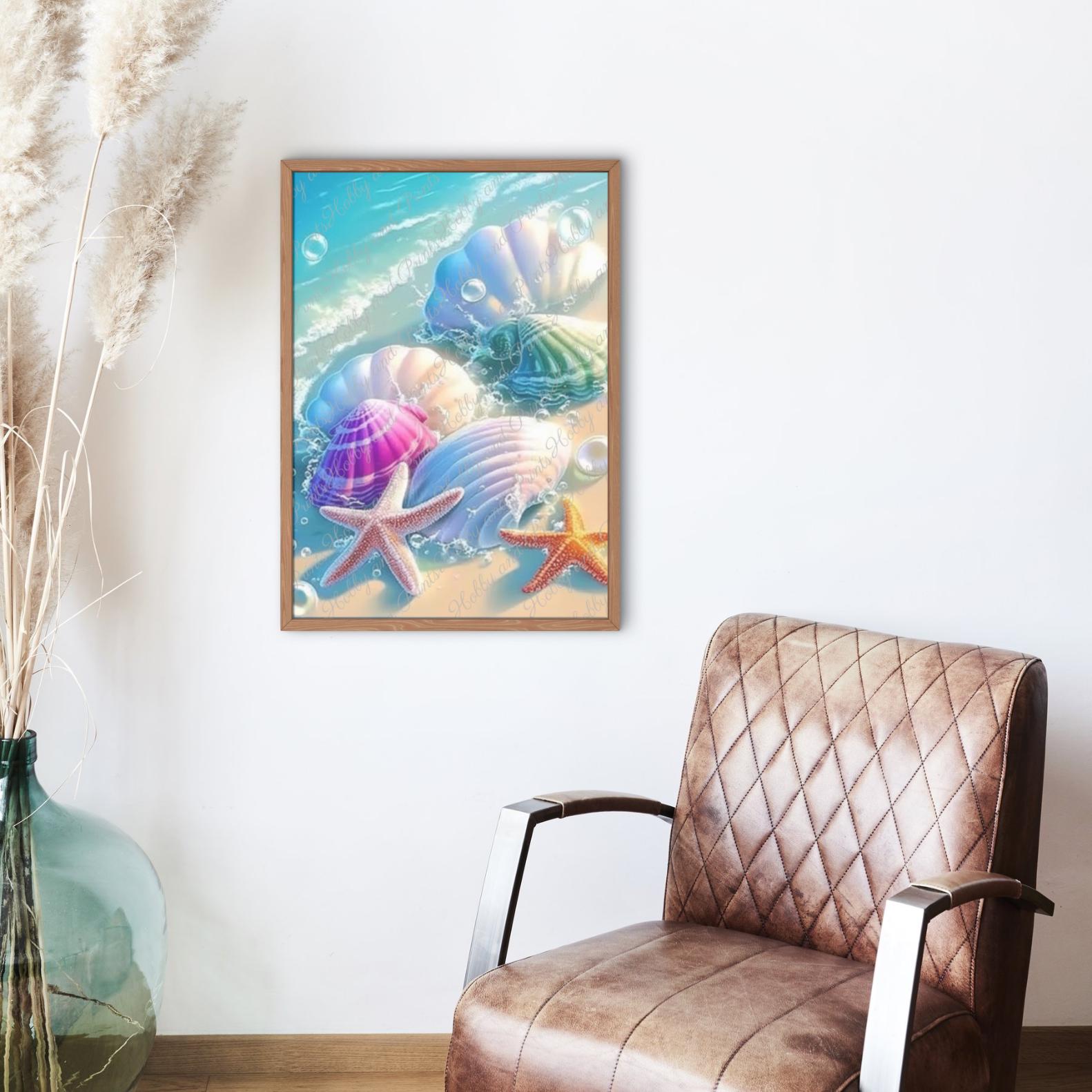 Ideal für alle, die Farbe, Fantasie und Kreativität lieben! Holen Sie sich das Sommerurlaubsgefühl nach Hause mit dem bezaubernden Diamantbild „Muscheln am Strand“.