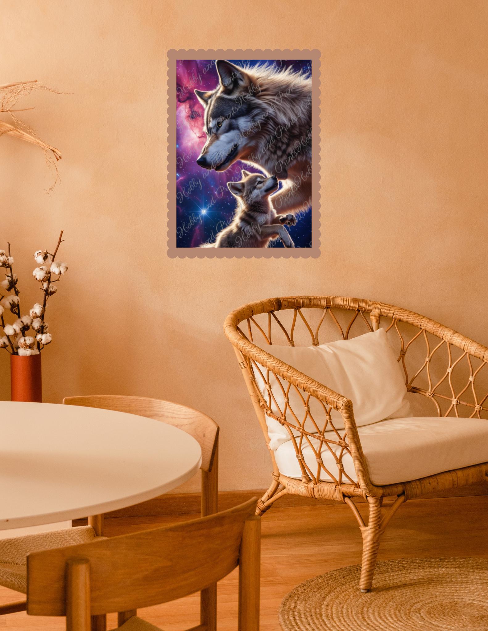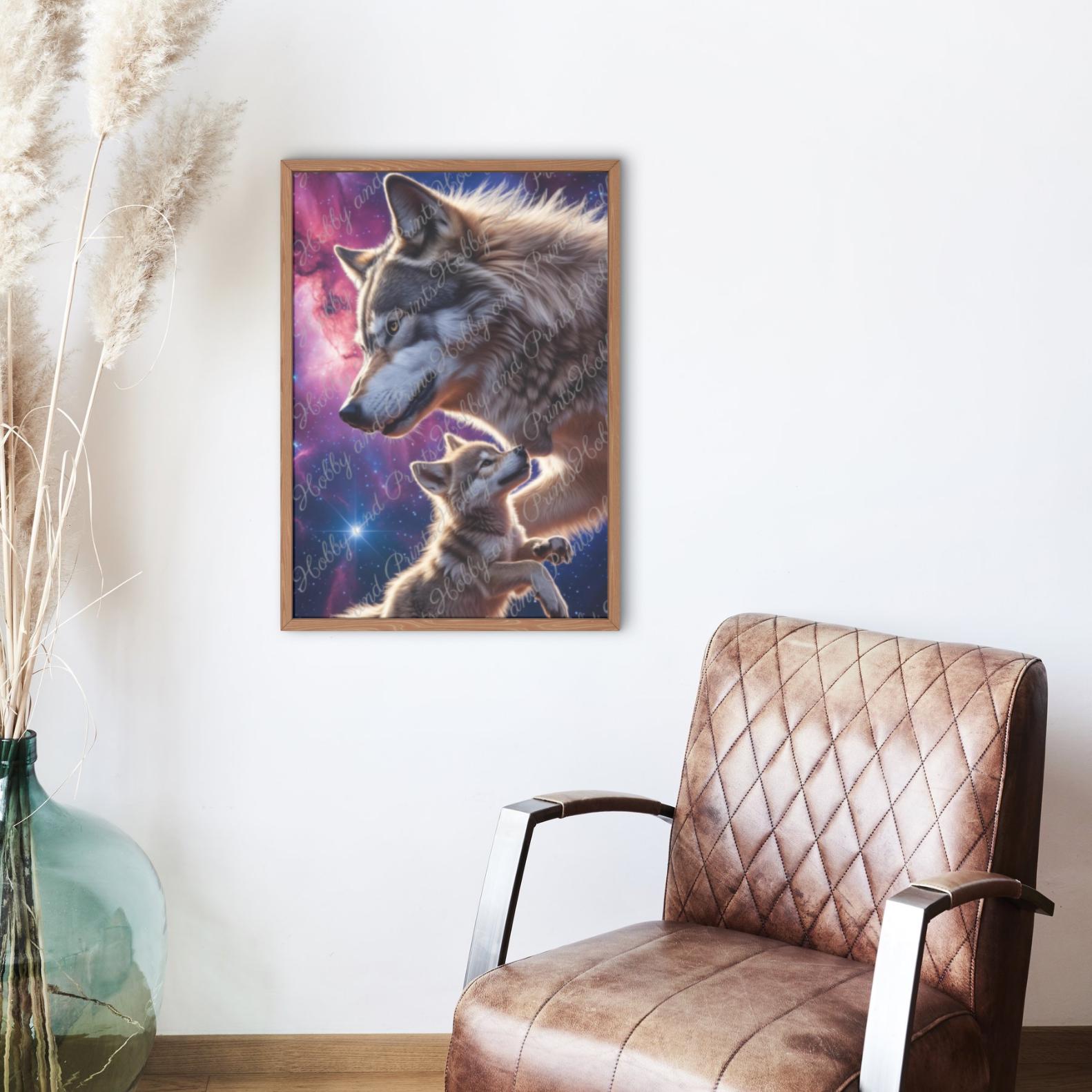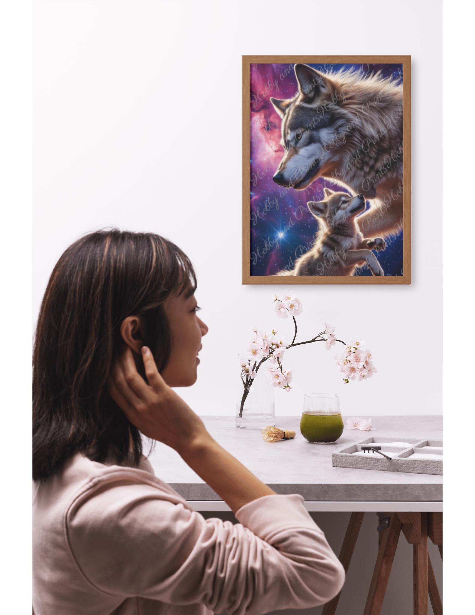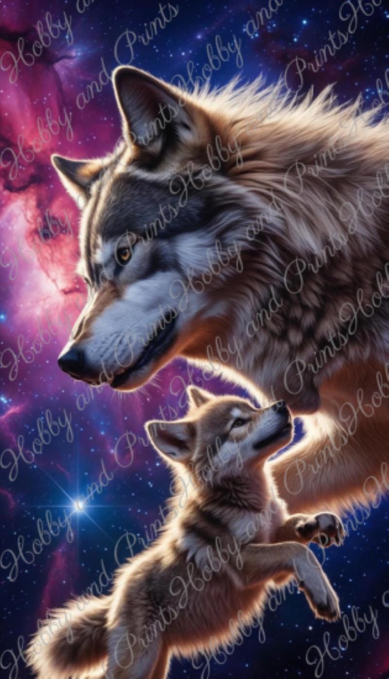 Experience the emotional power of nature with this high-quality "Wolf Father & Son" diamond painting. The touching motif depicts a majestic wolf gazing lovingly at its cub β against a colorful galaxy backdrop with a deep blue starry sky and violet nebulae.