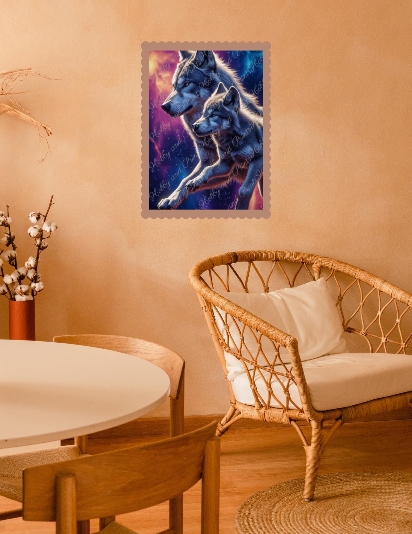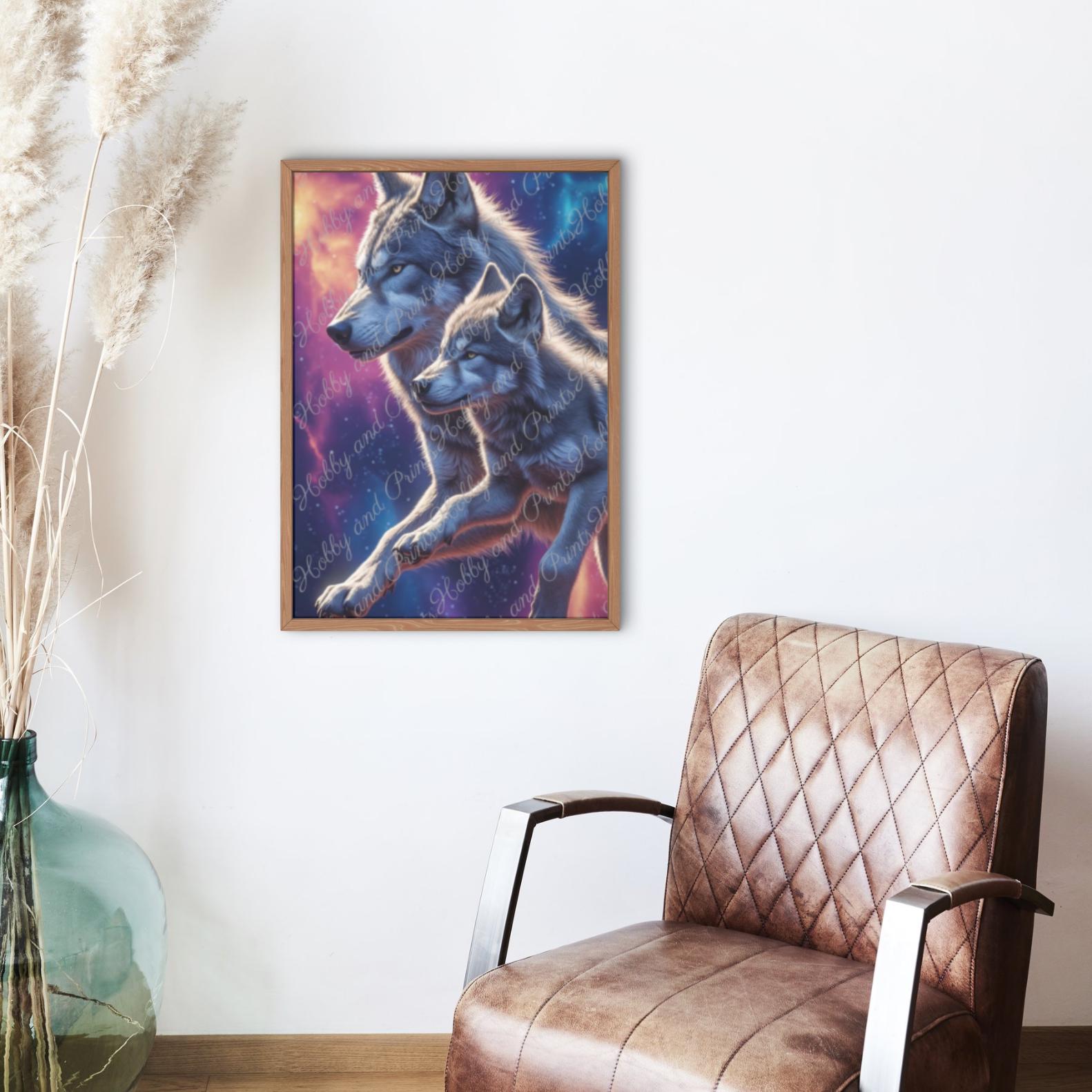 Experience the emotional power of nature with this high-quality diamond painting "Wolf Father & Cub." The touching motif depicts a majestic wolf traveling through space with its cub β against a colorful galaxy backdrop with colorful starry skies and nebulae.