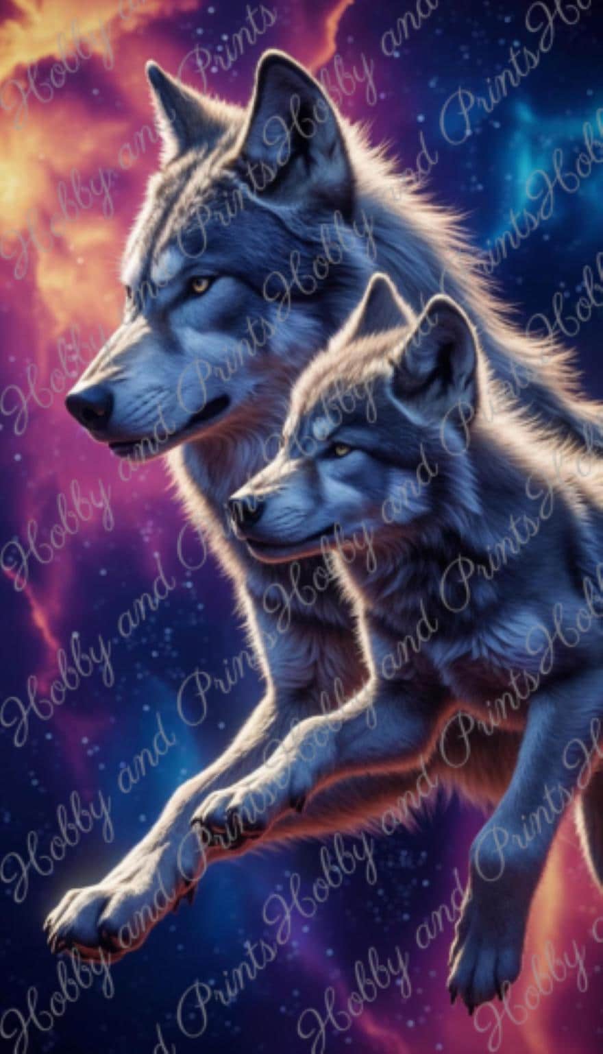 Experience the emotional power of nature with this high-quality diamond painting "Wolf Father & Cub." The touching motif depicts a majestic wolf traveling through space with its cub β against a colorful galaxy backdrop with colorful starry skies and nebulae.