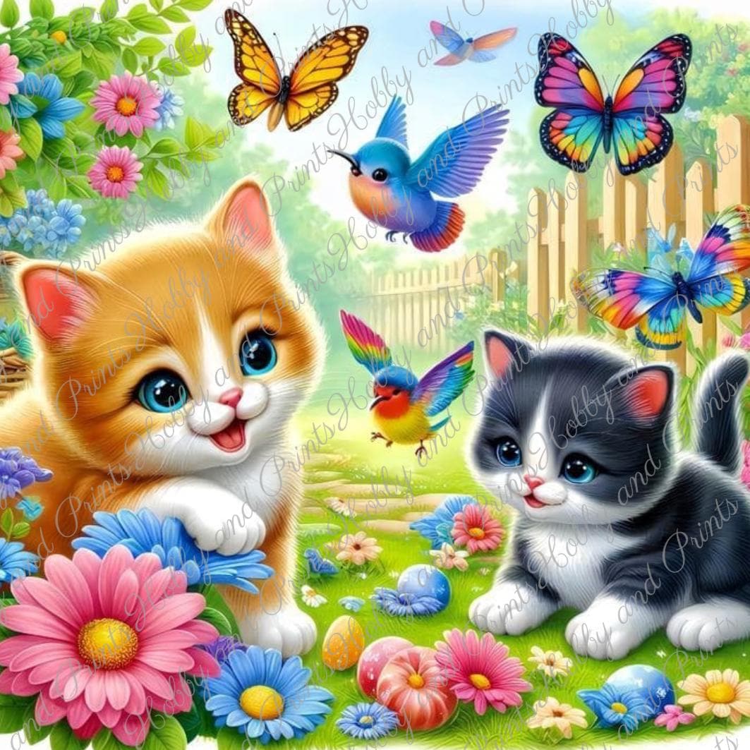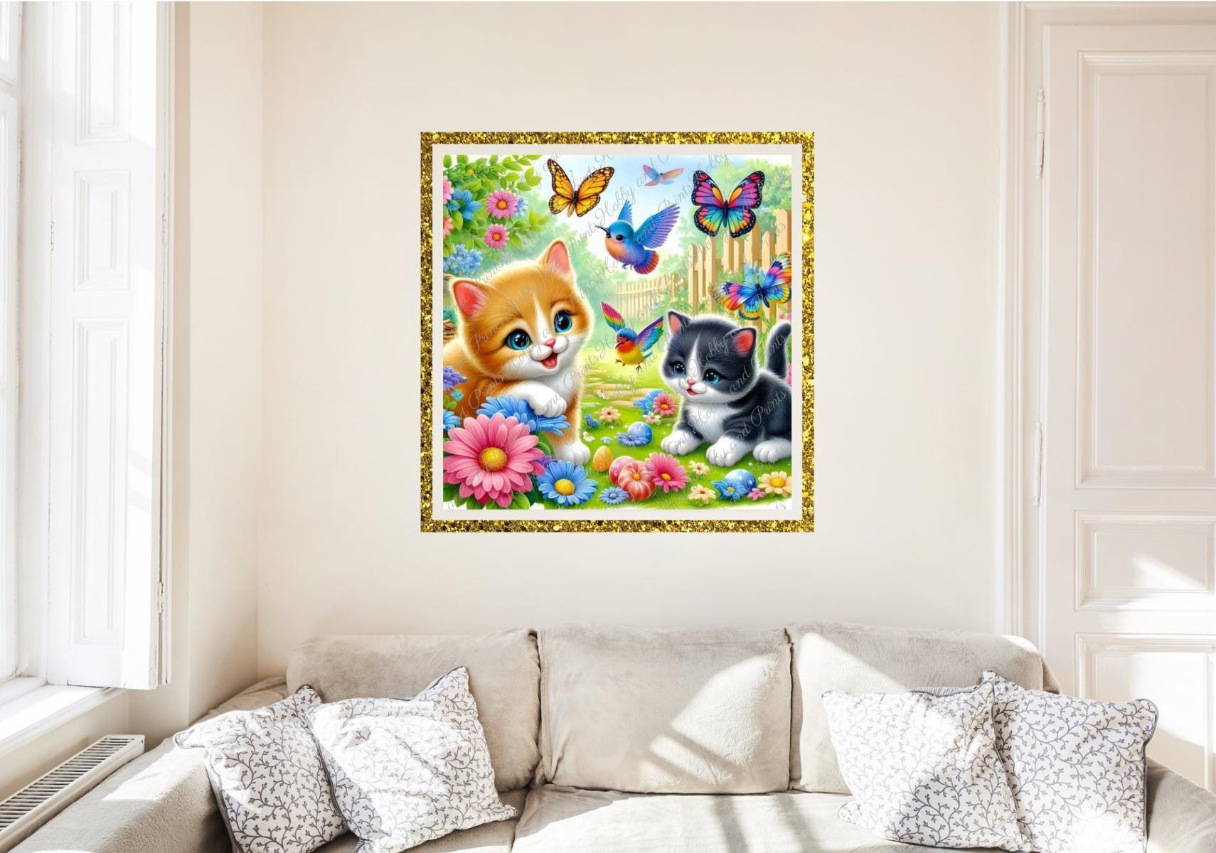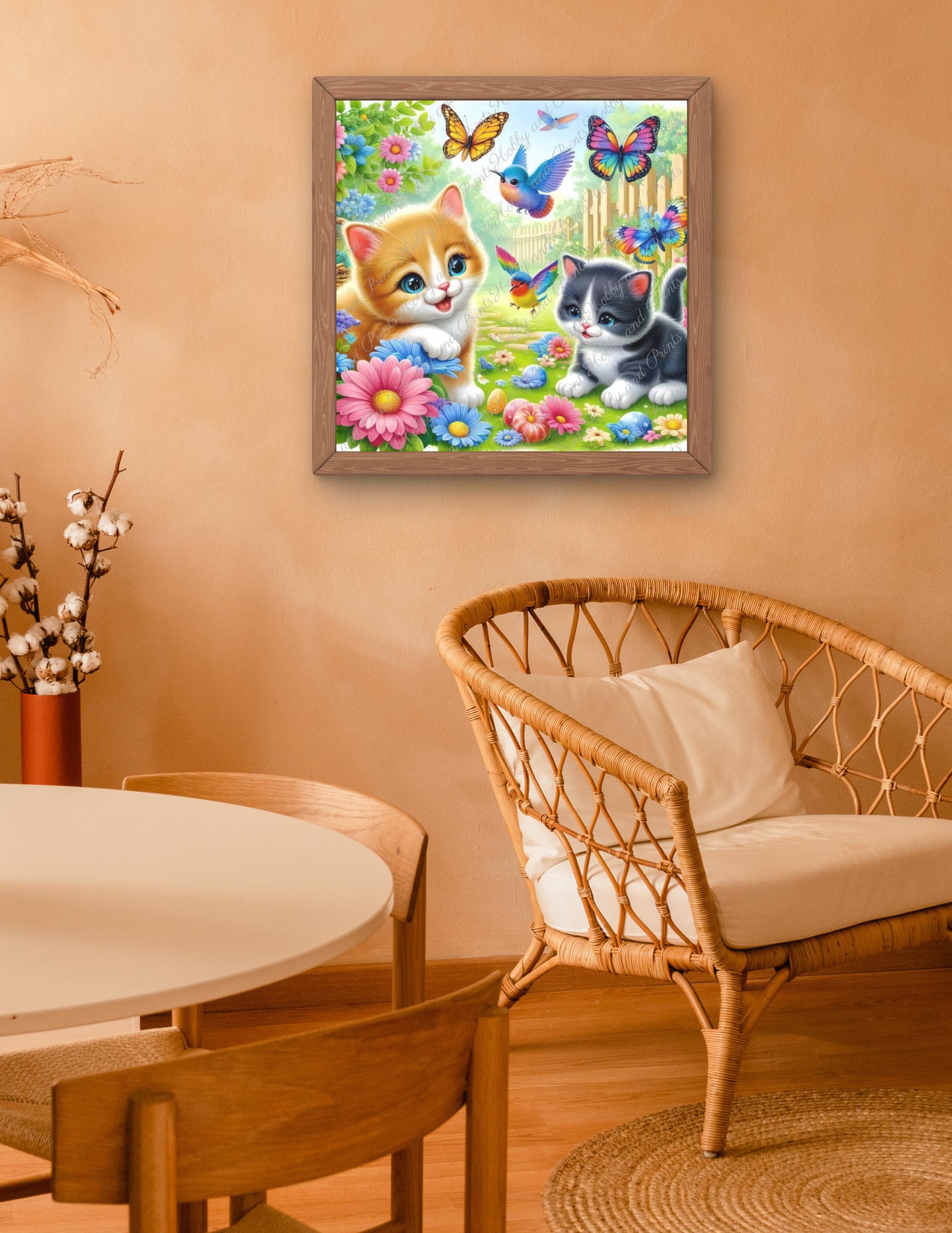 Bring this enchanting garden moment to life! Our high-quality diamond painting featuring two cute kittens amidst a colorful garden full of flowers, butterflies, and birds brings joy, warmth, and sparkle to any home.