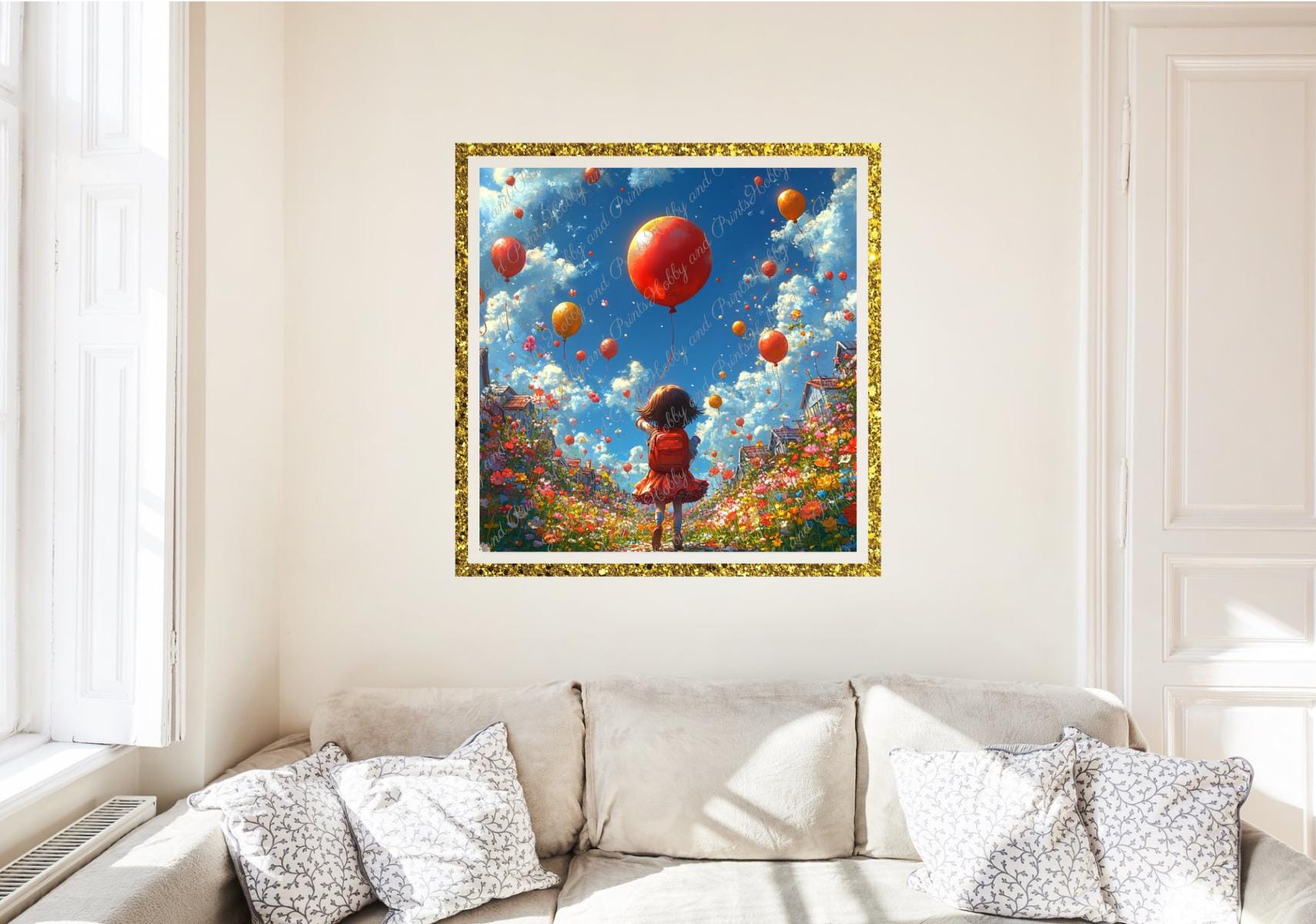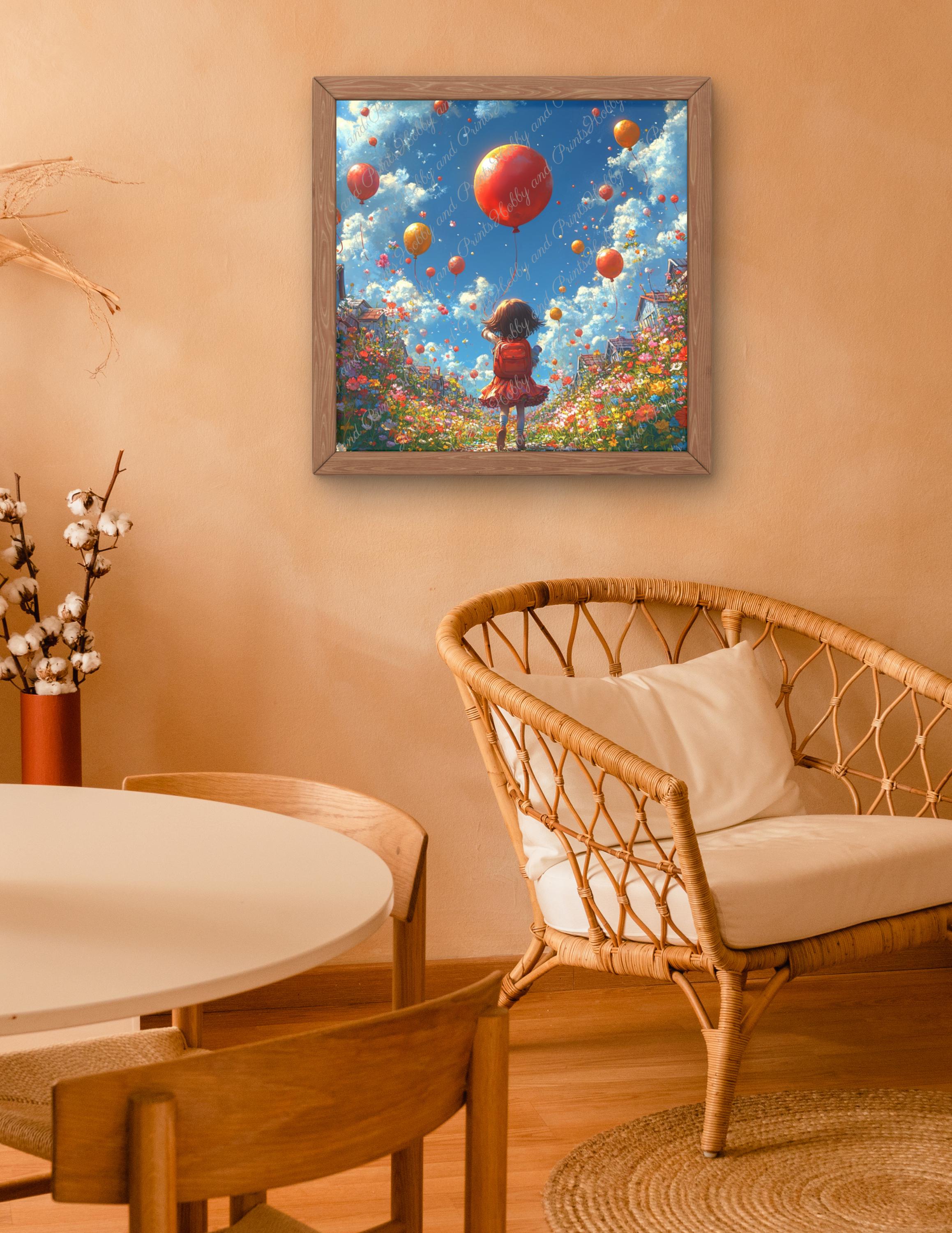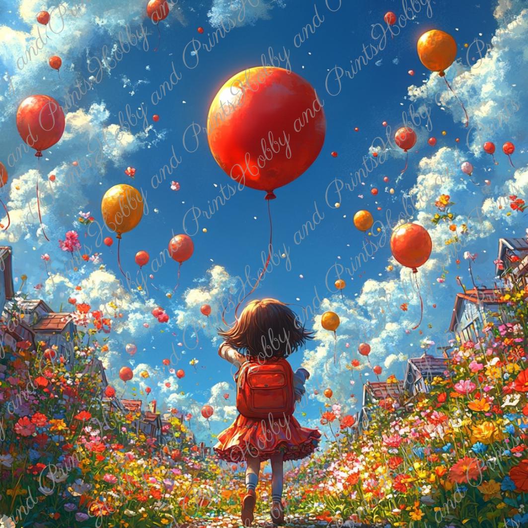 Immerse yourself in a dreamy scene full of lightness and joy! This high-quality diamond painting "Girl with Balloons" depicts a little girl with a red backpack running through a sea of ββflowers while bright red and orange balloons rise into the bright blue sky.