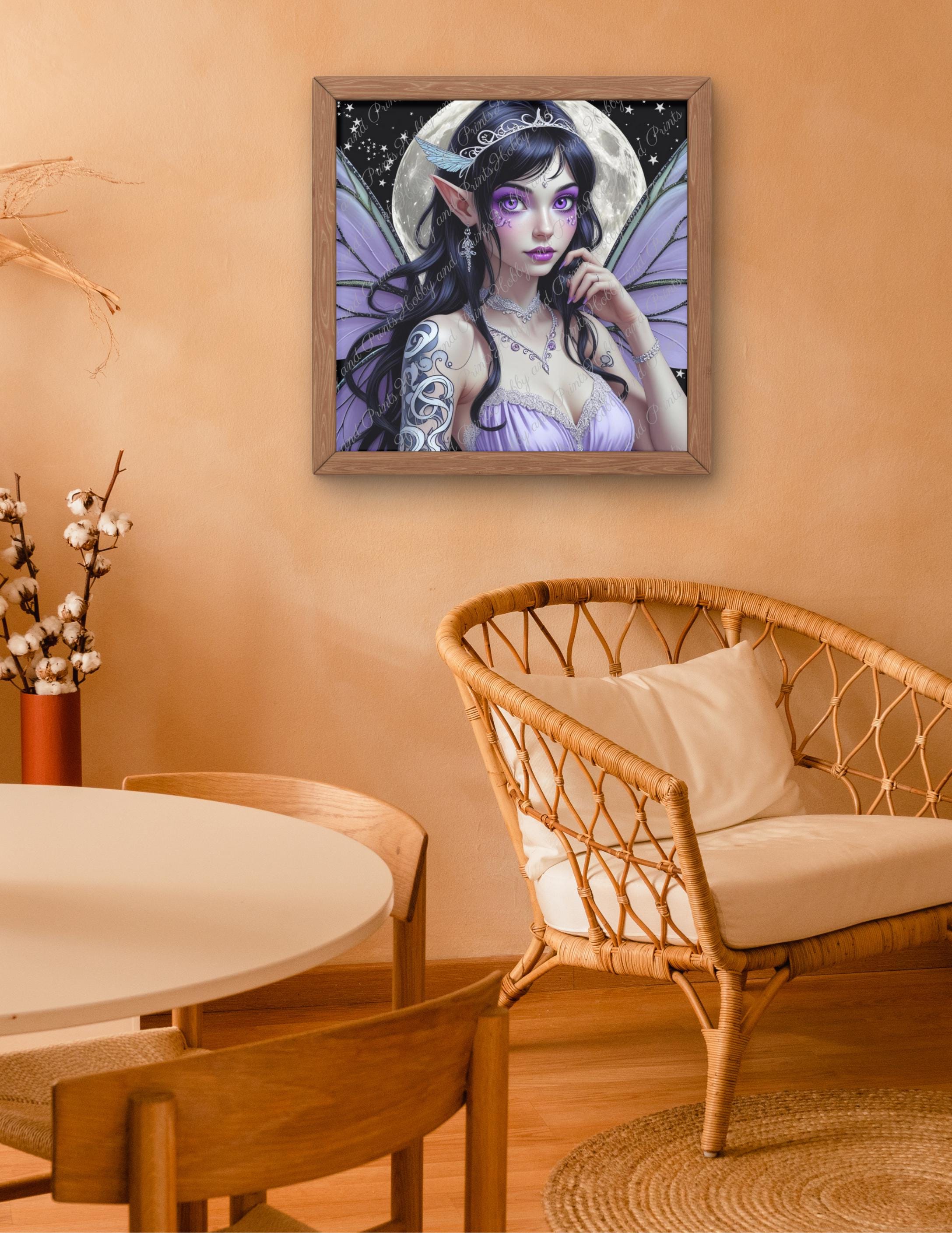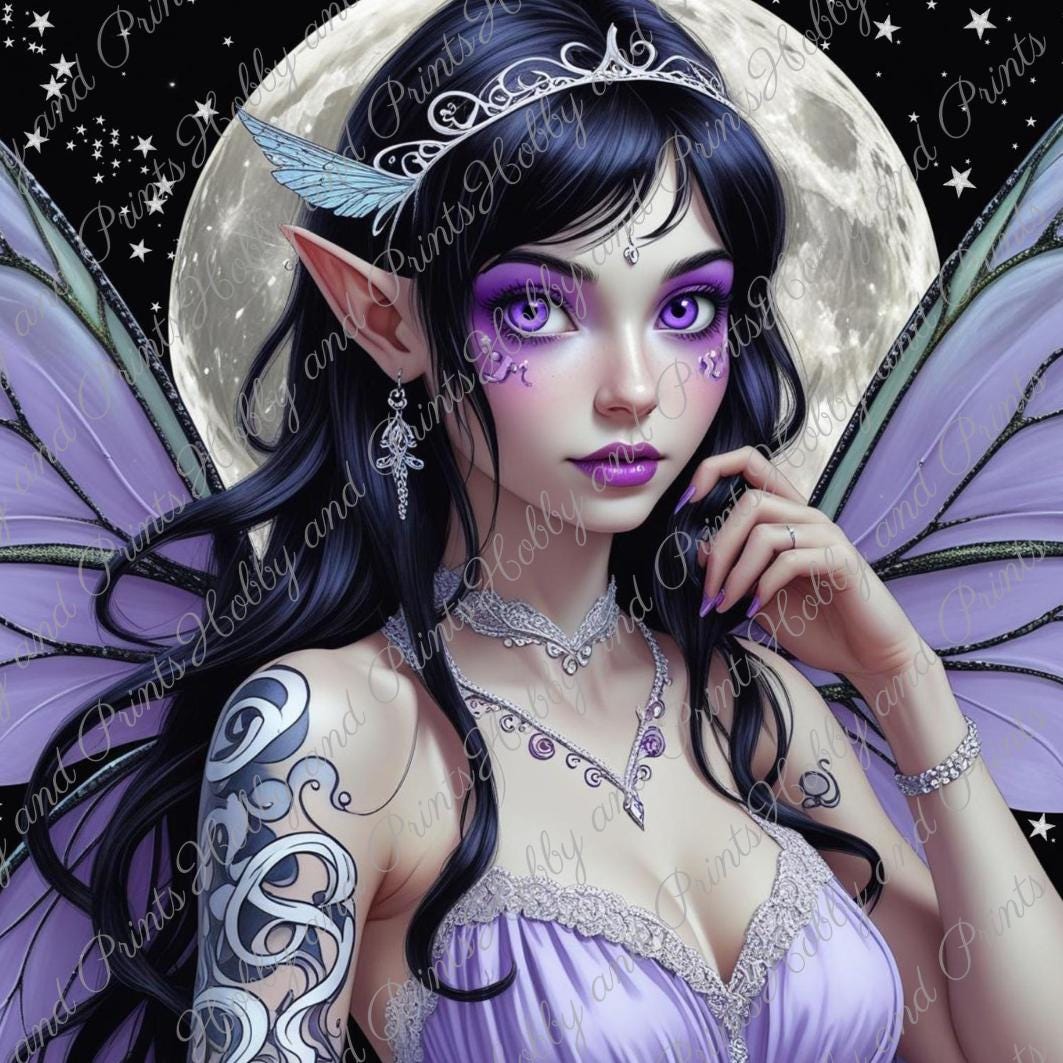This mysterious fairy with jet-black hair, violet eyes, and intricate tattoos sits before a glowing moon β her lilac dress and purple wings appear otherworldly. Stars twinkle in the background, illuminating the entire motif with dreamy magic.