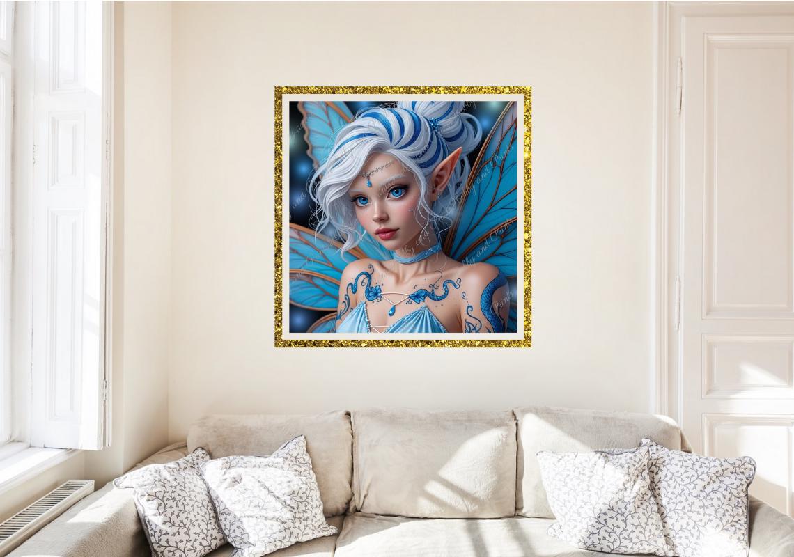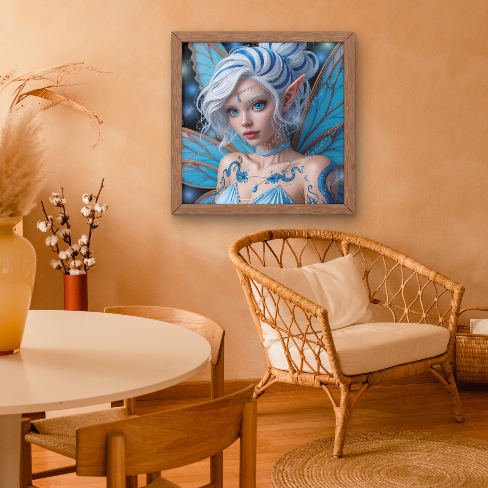 Immerse yourself in a frosty fantasy world with this high-quality diamond painting "Ice Fairy with Blue Wings." This magical fairy with snow-white hair, icy-blue tattoos, and delicate jewelry enchants with her frosty charm and shining eyes.