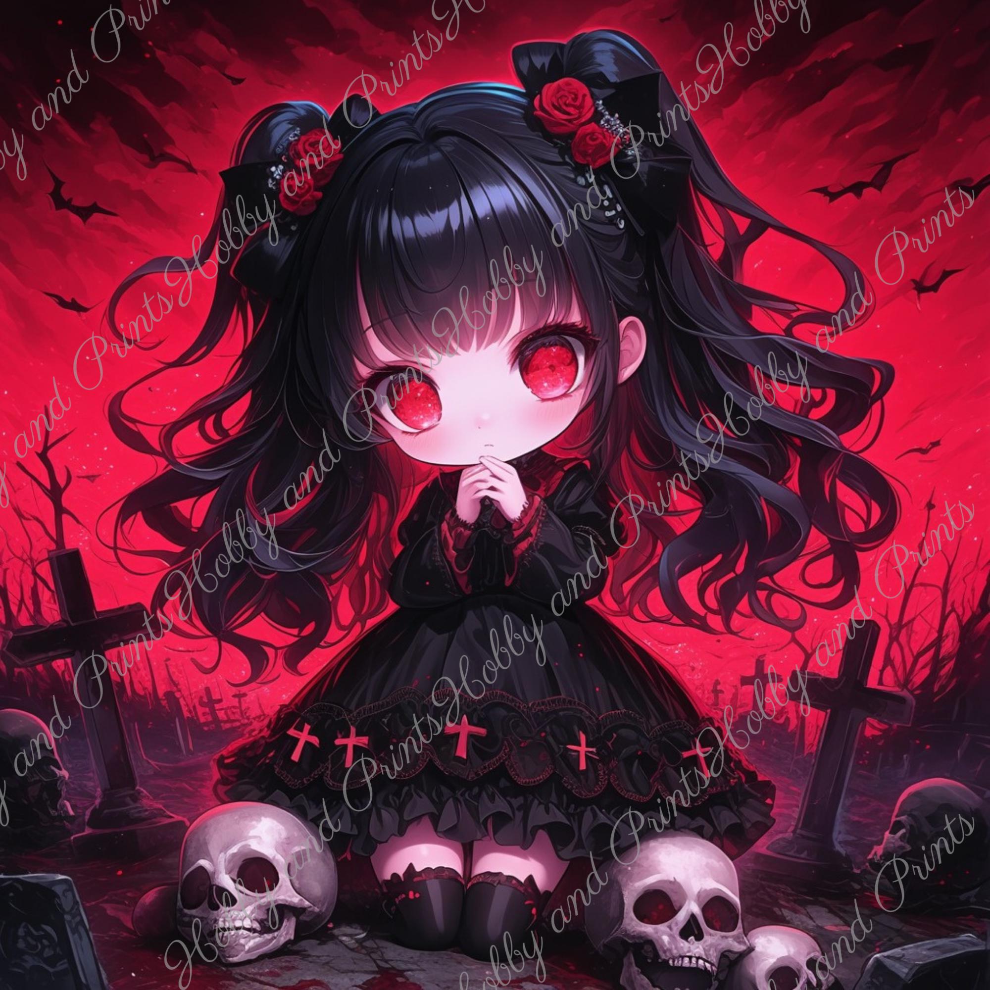 Immerse yourself in the mystical world of dark elegance with this unique Gothic-style diamond painting. The detailed motif depicts a cute chibi girl with long black hair, deep red eyes, and a black dress adorned with crosses – surrounded by skulls and a gloomy cemetery, illuminated by the eerie red sky.