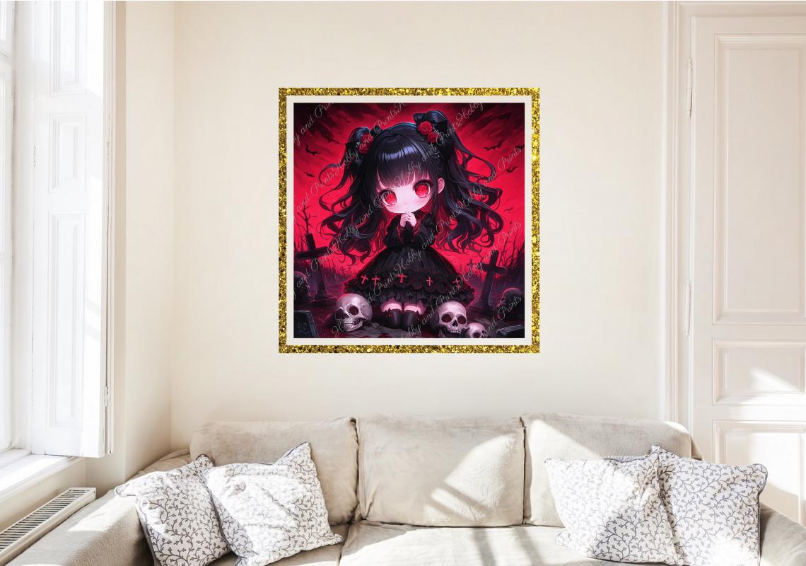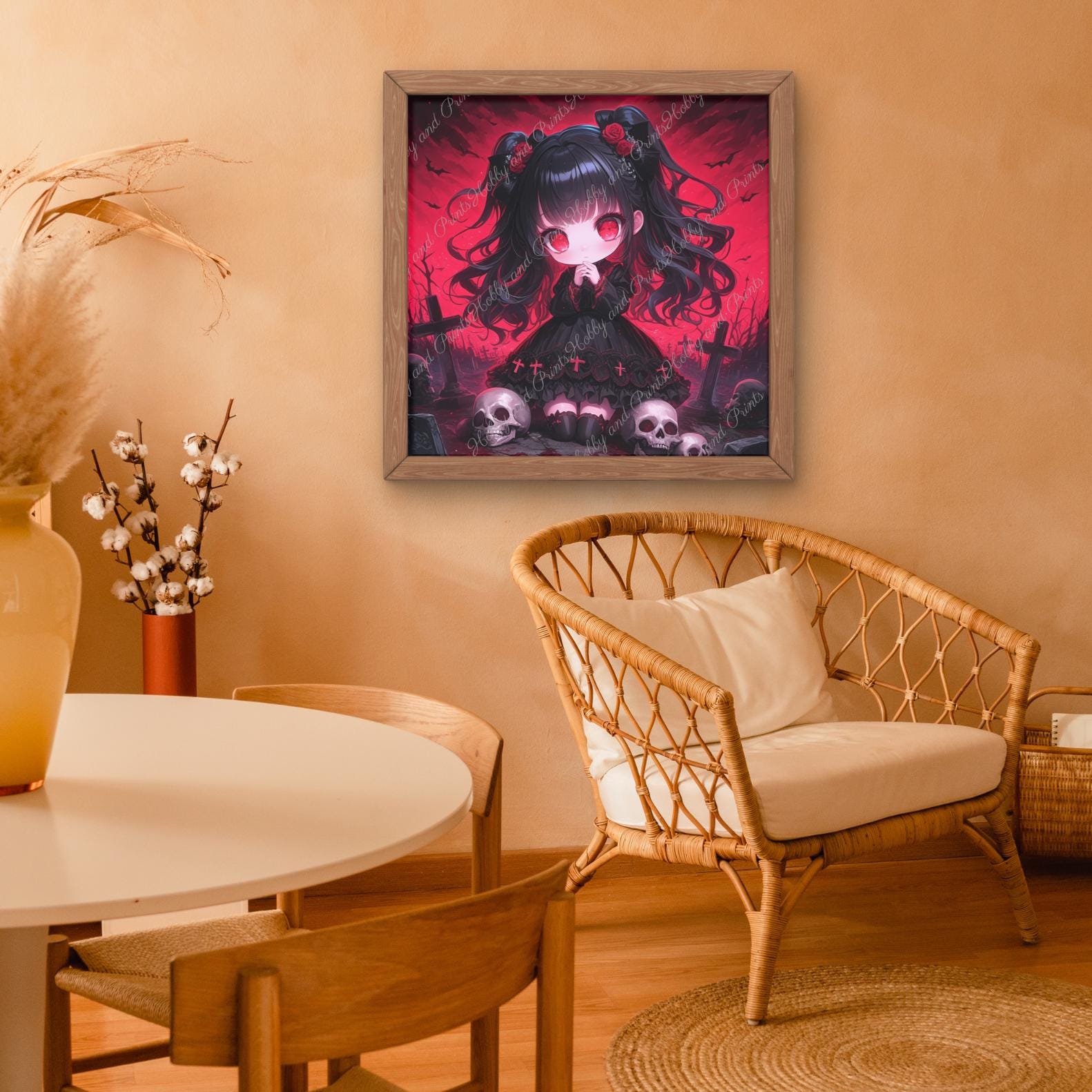 Gothic Chibi Diamond Painting – Dark Girl with Red Eyes, Skulls & Crosses – Horror Anime Artwork | Custom Stones | Canvas Options | Round or Square Stones