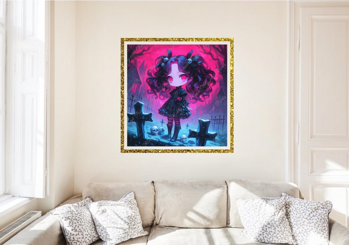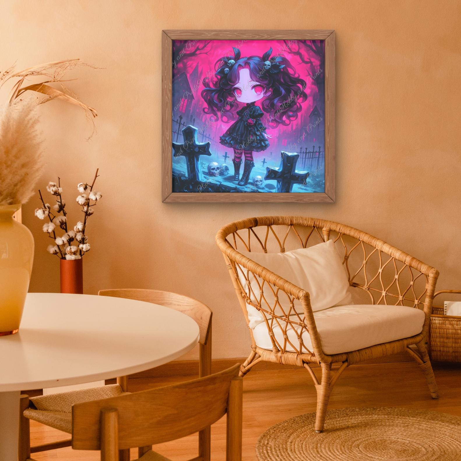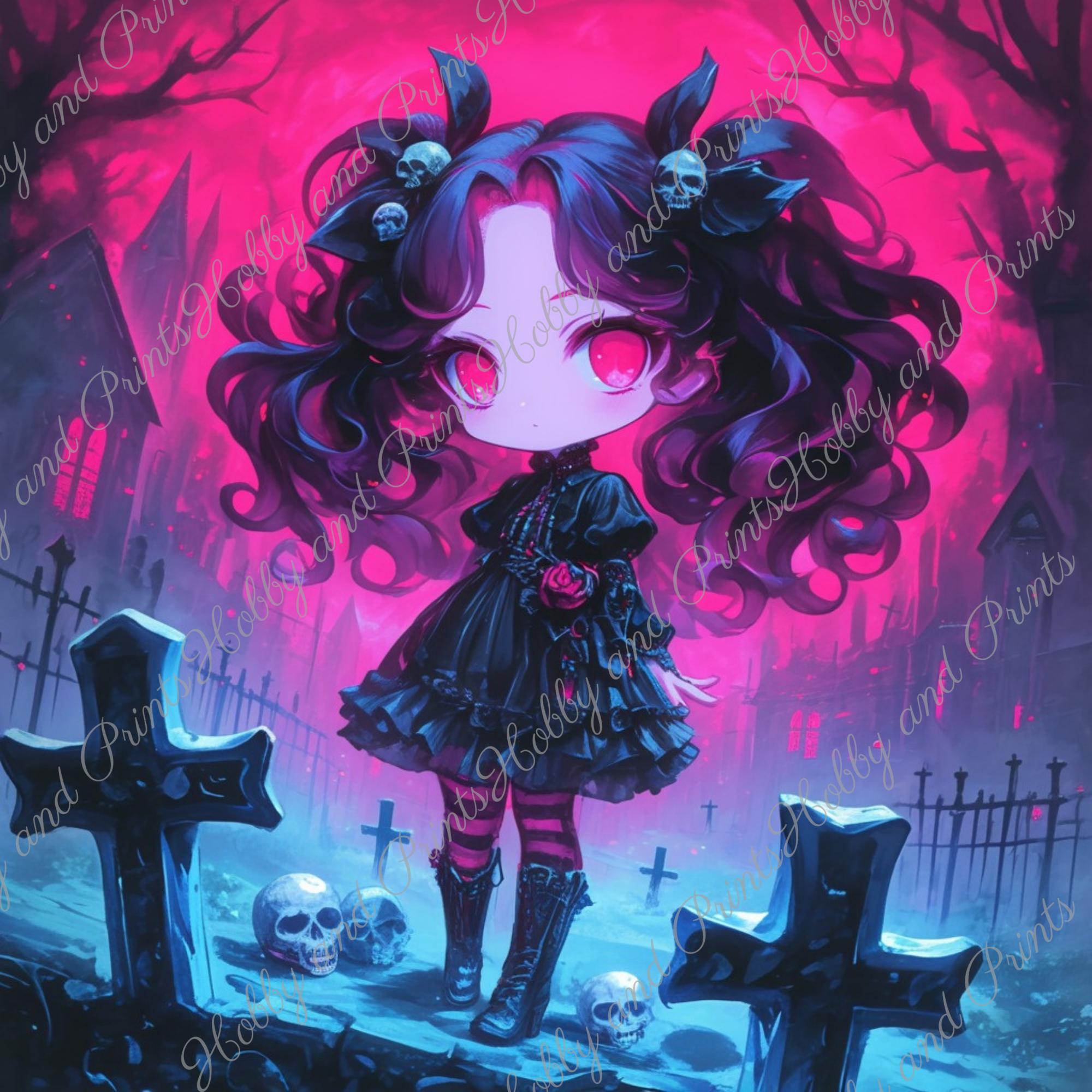 Immerse yourself in the mystical world of dark elegance with this unique Gothic-style diamond painting. The detailed motif features a cute chibi girl with long black hair, deep red eyes, and a black dress, adorned with roses – surrounded by skulls and a gloomy cemetery, illuminated by the eerie red sky.