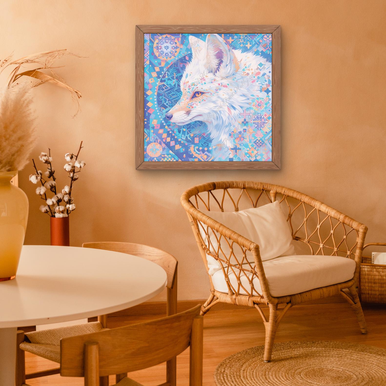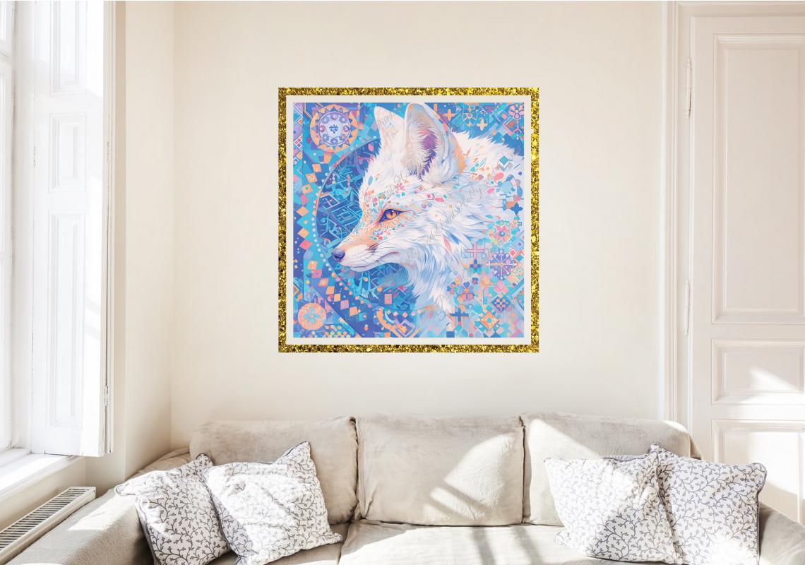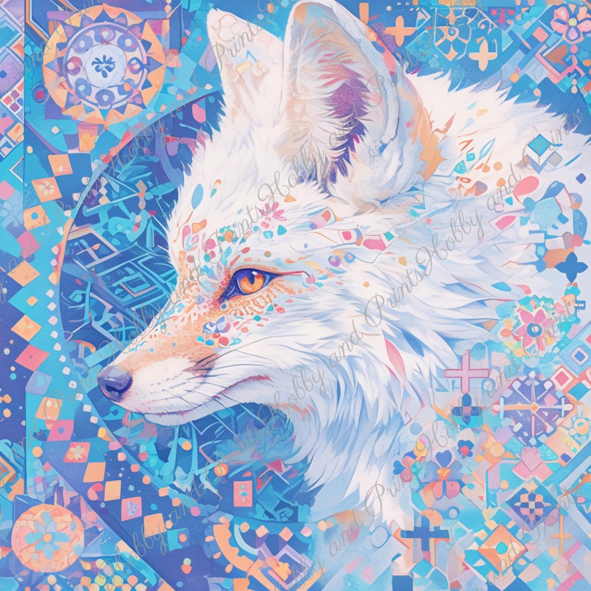 Awaken the magic of nature with this captivating diamond painting of a mystical fox. The artistic motif features the head of a white fox, adorned with colorful patterns in blue, orange, pink, and turquoise, embedded in a richly decorated, geometric, fantastical design. The intense radiance of its orange eyes immediately catches the eye and symbolizes wisdom, intuition, and spiritual power.