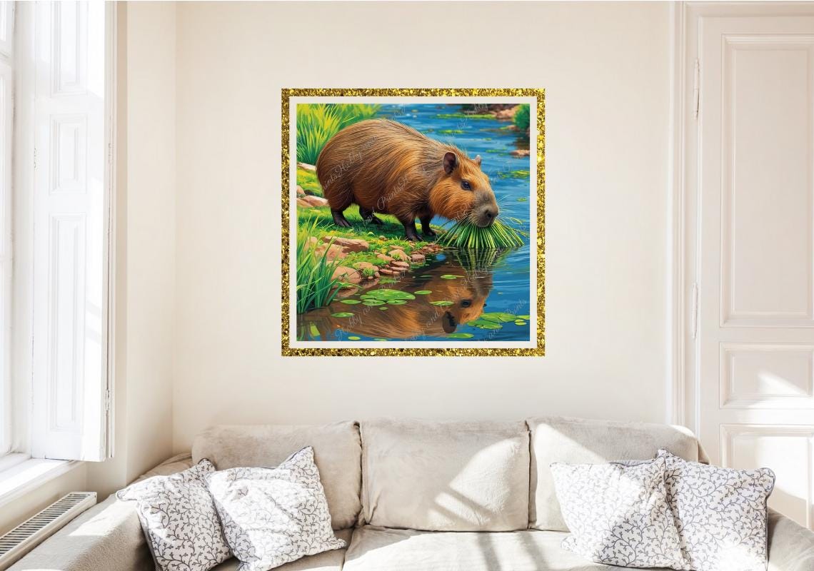 Immerse yourself in the peaceful world of nature with our high-quality Capybara Diamond Painting. The idyllic motif depicts a meticulously crafted capybara grazing on the riverbank – a harmonious scene that exudes peace and serenity.