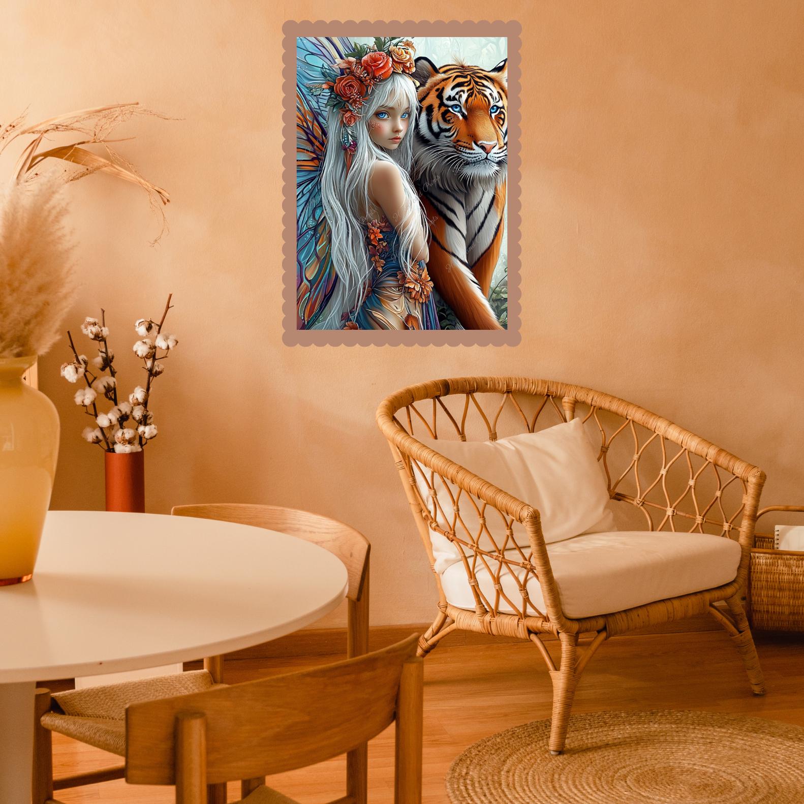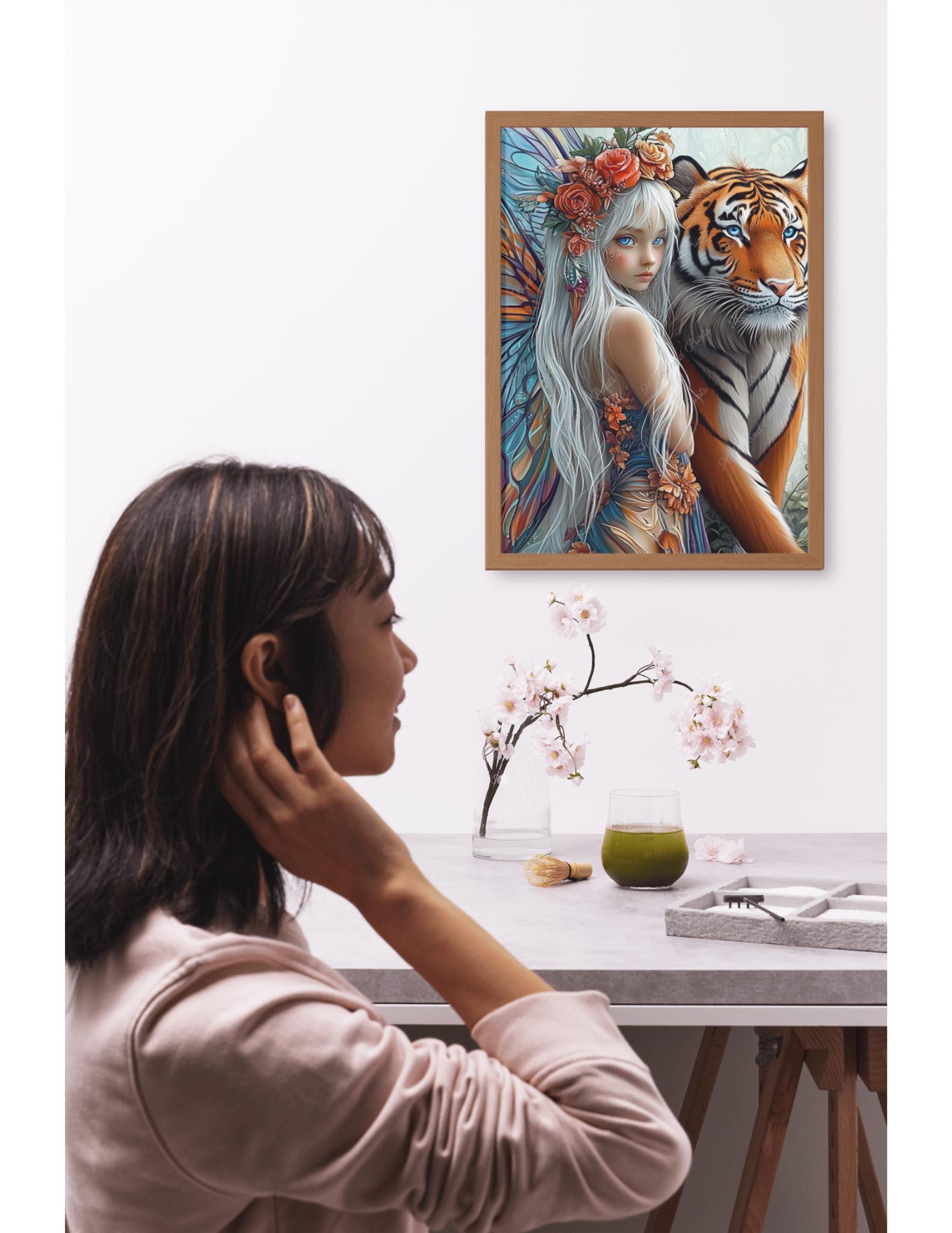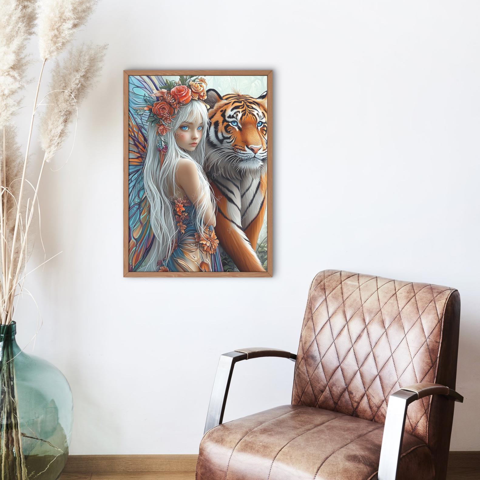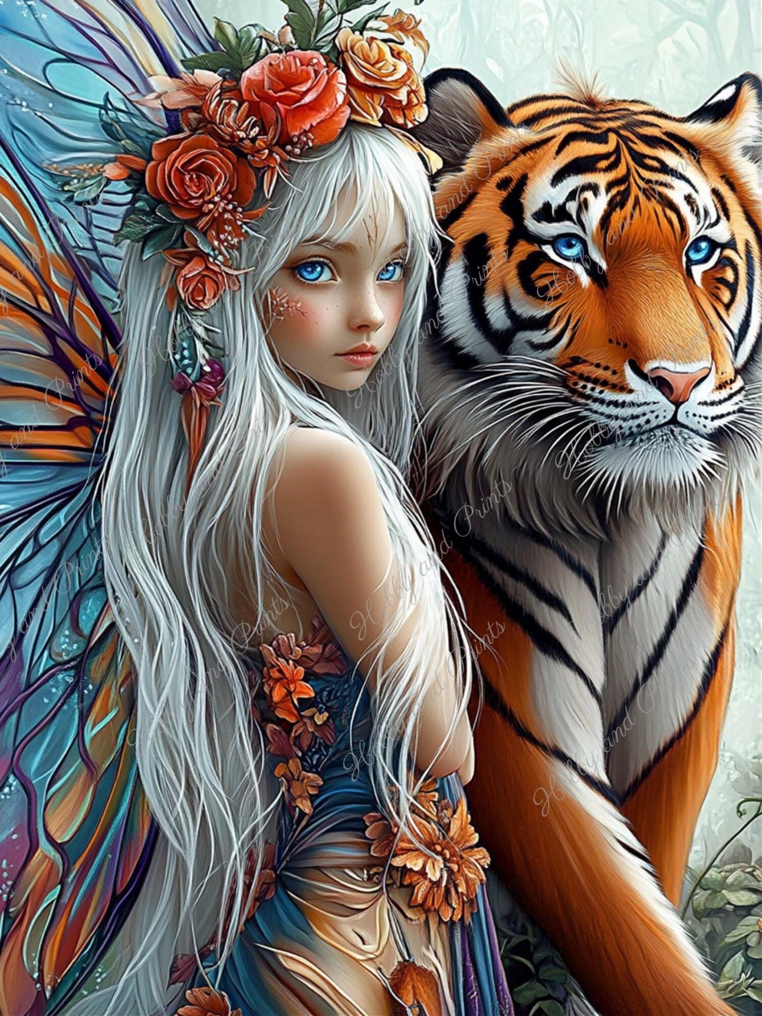 Dieses einzigartige 5D-Diamantbild zeigt eine wunderschöne Fantasy-Elfe mit blauen Augen, verziert mit floralen Elementen, und an ihrer Seite einen majestätischen Tiger mit leuchtendem Blick. Eine perfekte Kombination aus mystischer Schönheit und wilder Stärke, eingebettet in feinste Details.