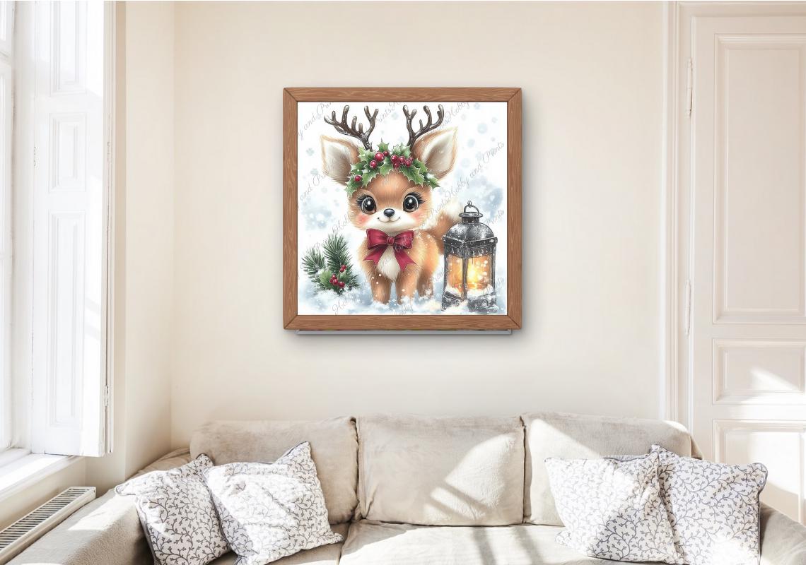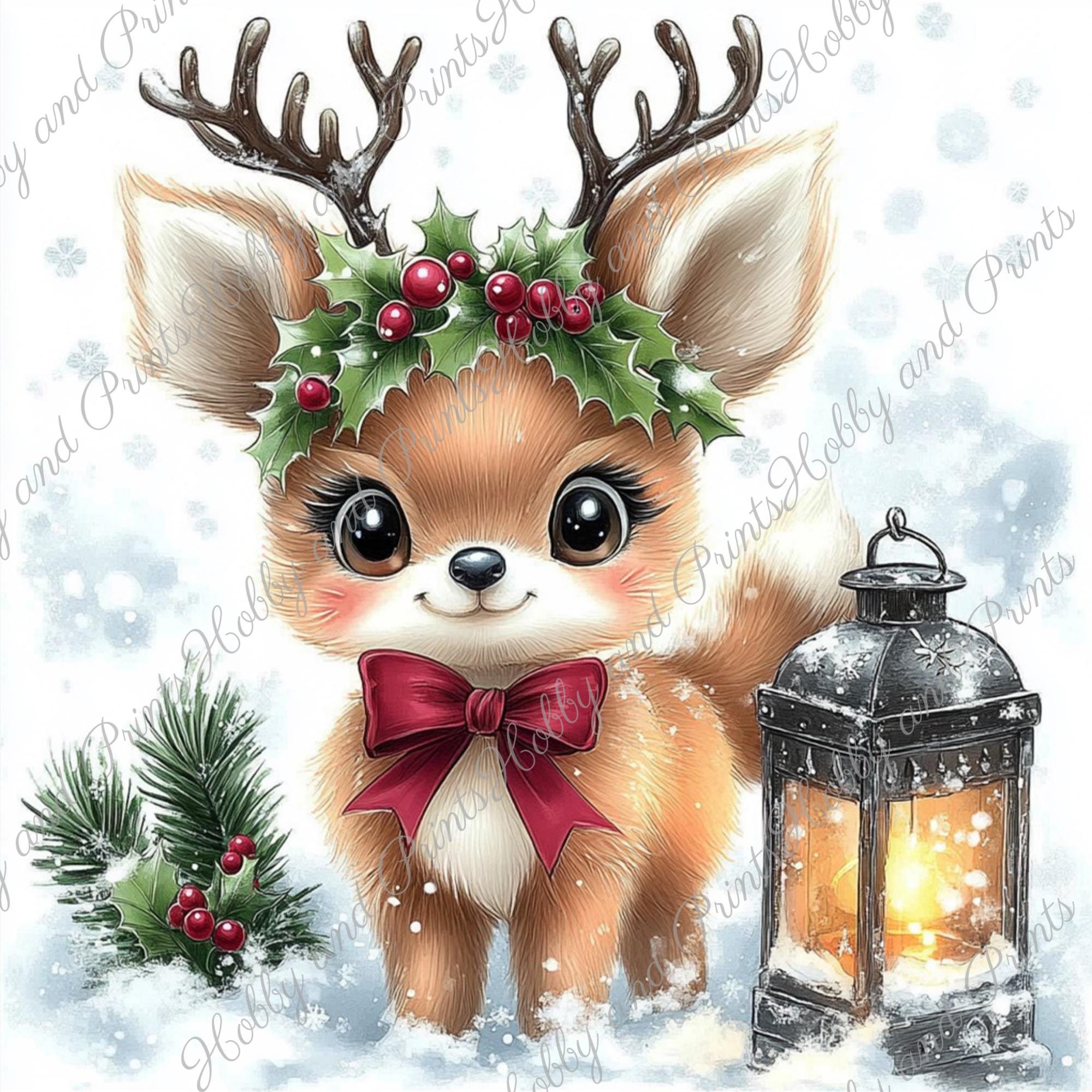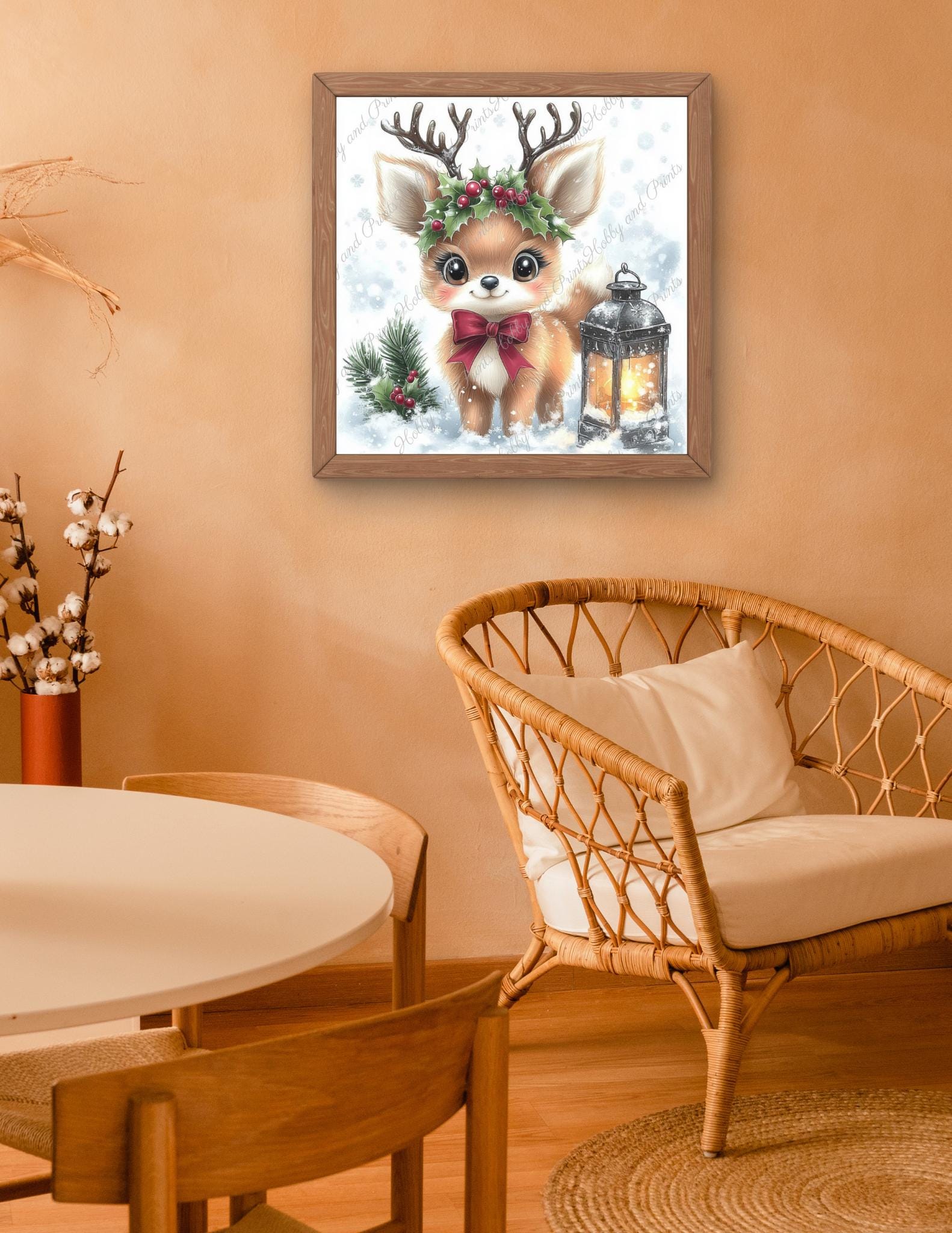 Transform your home into a magical winter wonderland with this sweet diamond painting! The motif features a cute deer in a Christmas look – with rosy cheeks, antlers, a holly wreath, a red bow, and a lantern in a snowstorm. Perfect as a festive decoration or gift idea for the Advent season!