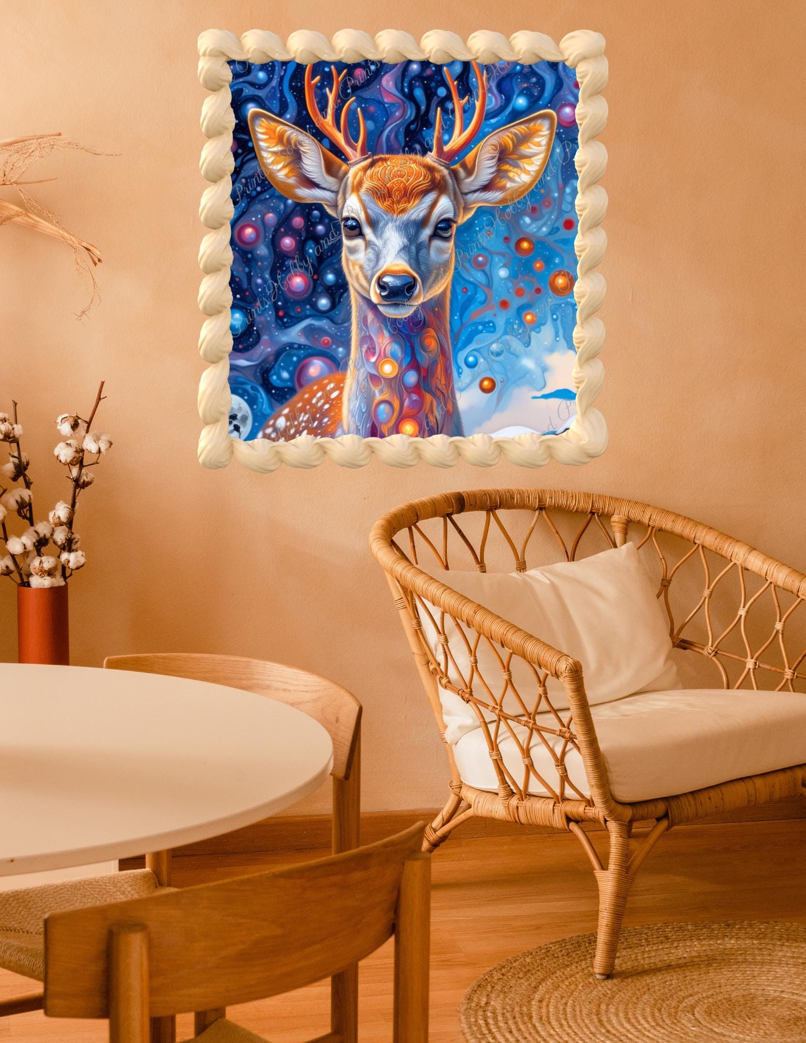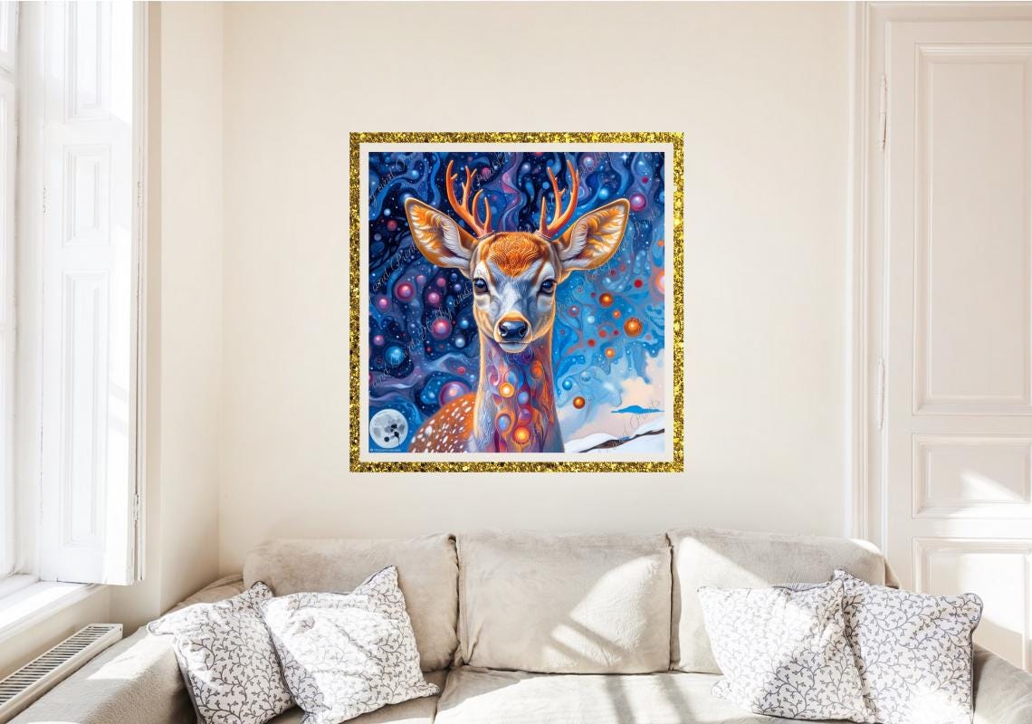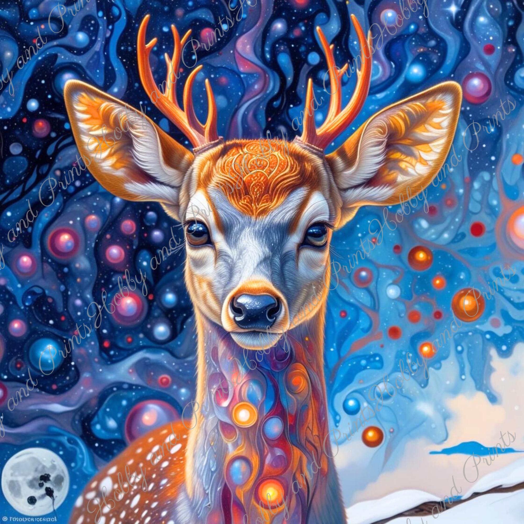 This high-quality diamond painting depicts a noble deer with antlers against a sparkling starry sky. The combination of nature motifs and cosmic colors makes this picture a true highlight for animal and fantasy lovers.