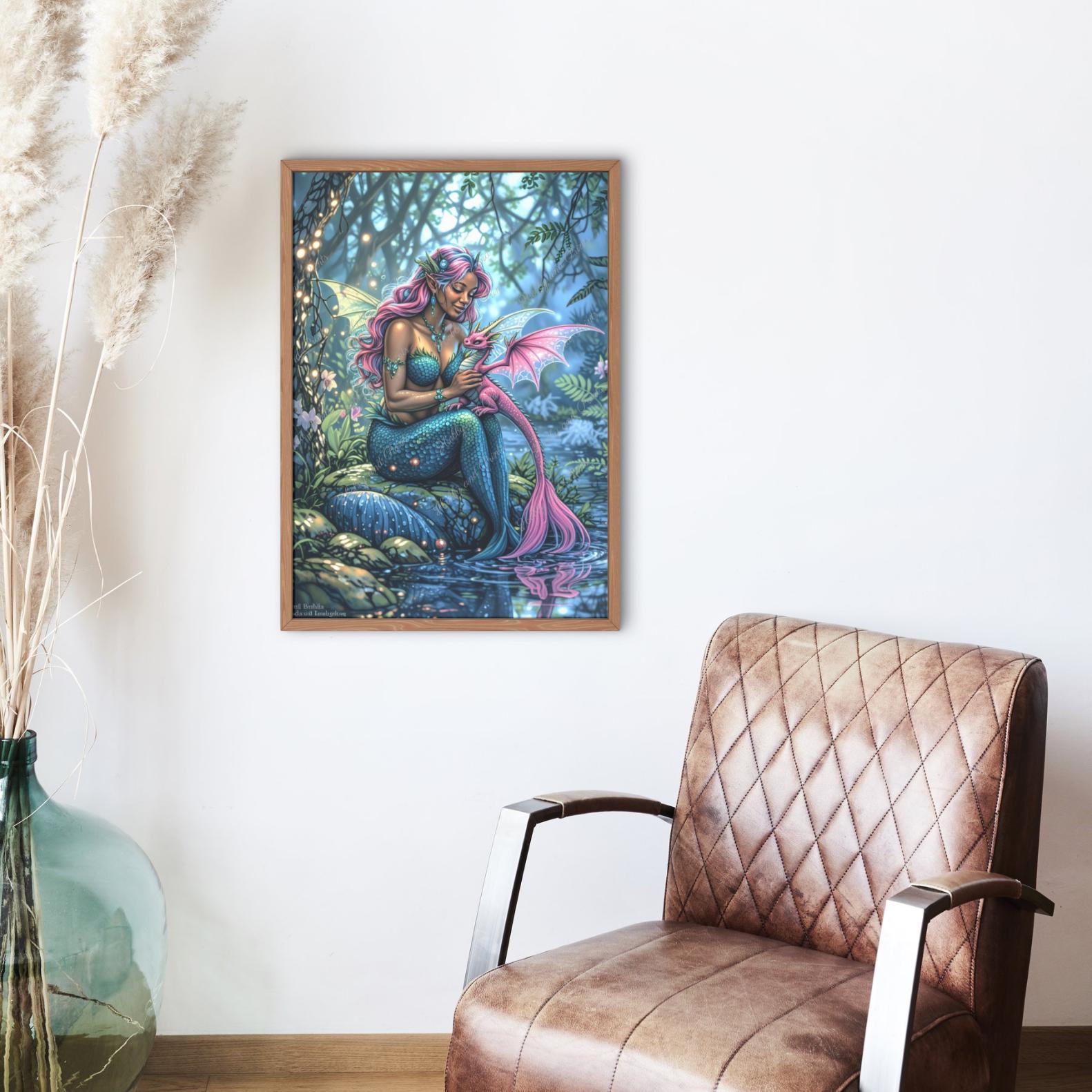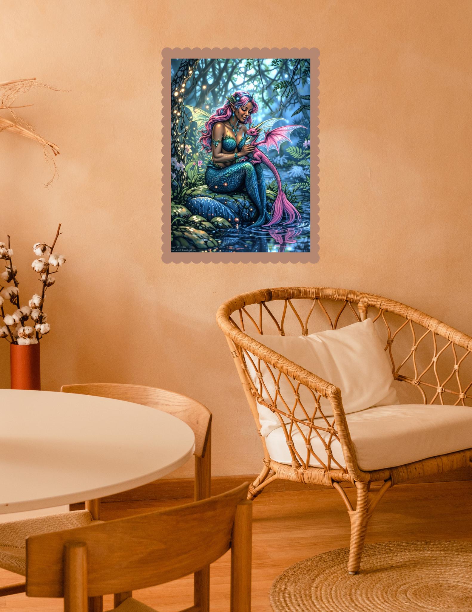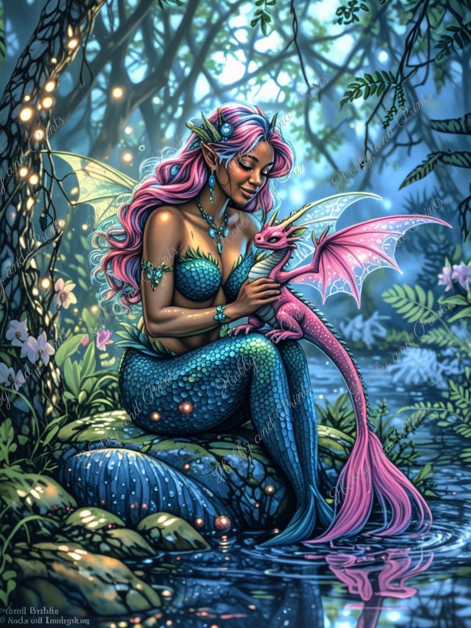 Dieses verträumte Diamantgemälde zeigt eine wunderschöne Meerjungfrau mit funkelnden Schuppen, die liebevoll einen kleinen rosa Drachen in ihren Armen hält. In einem mystischen Wald am Wasser gelegen, verzaubert das detailreiche Motiv mit schillernden Farben, einer märchenhaften Atmosphäre und exquisiten Details.