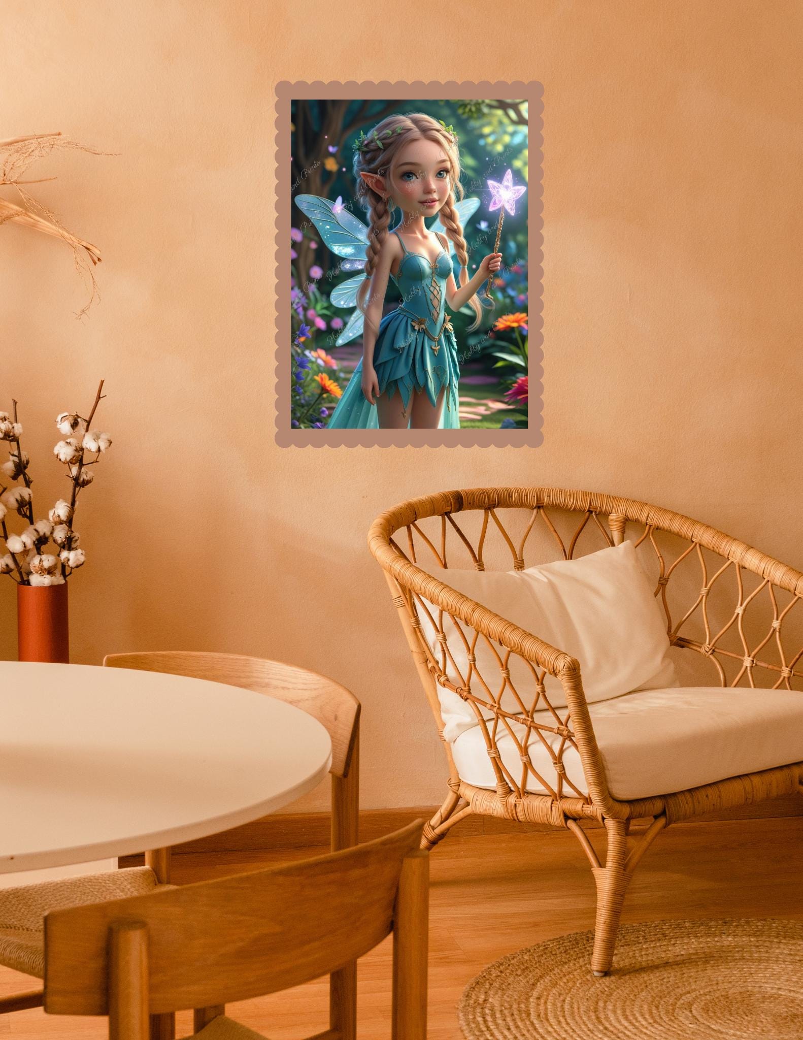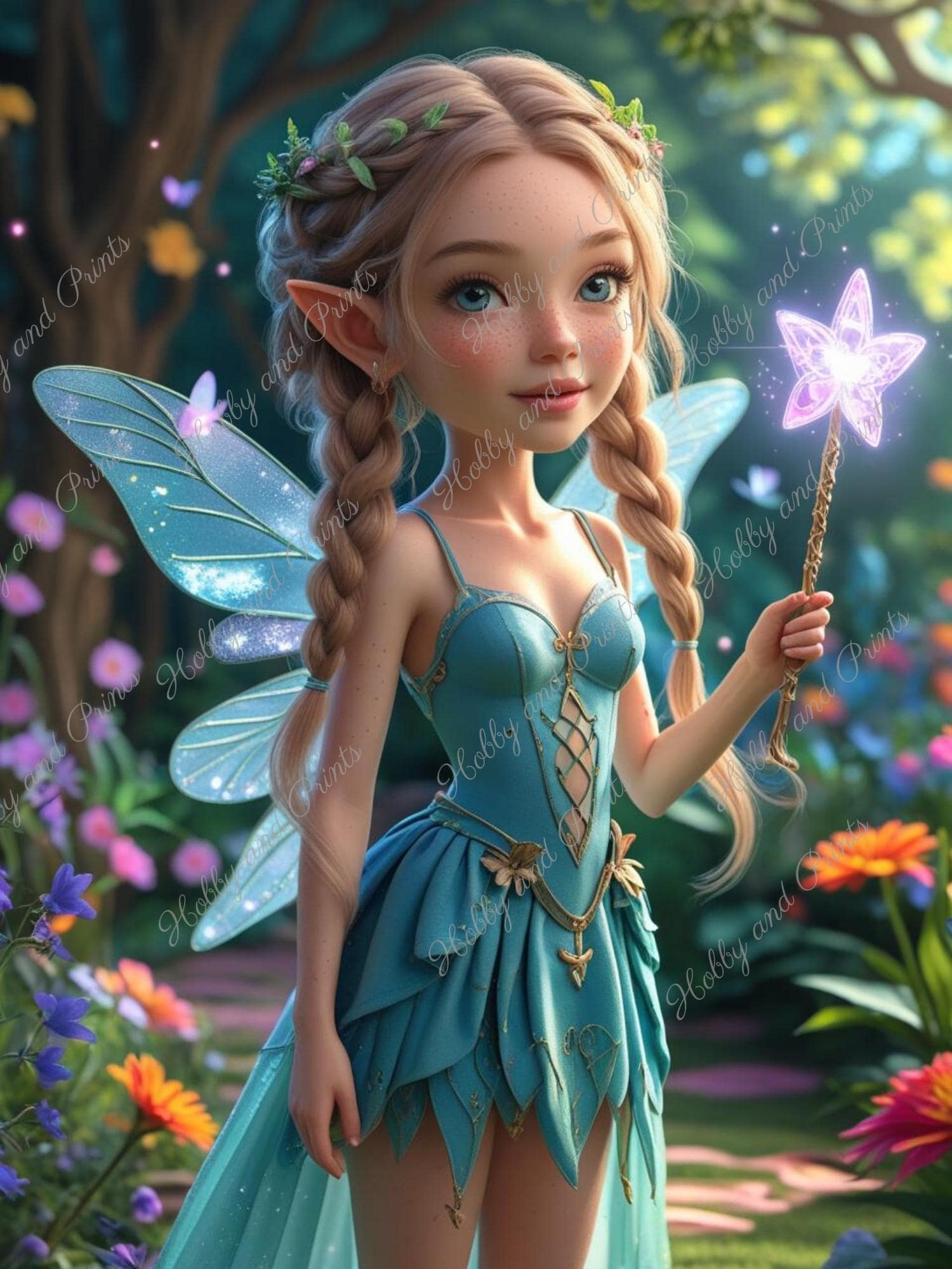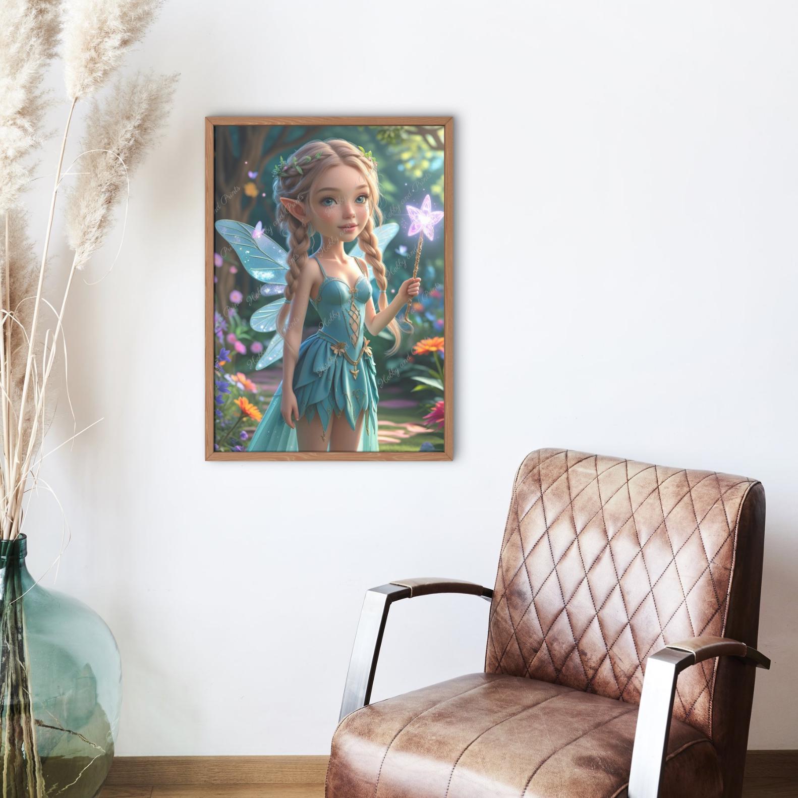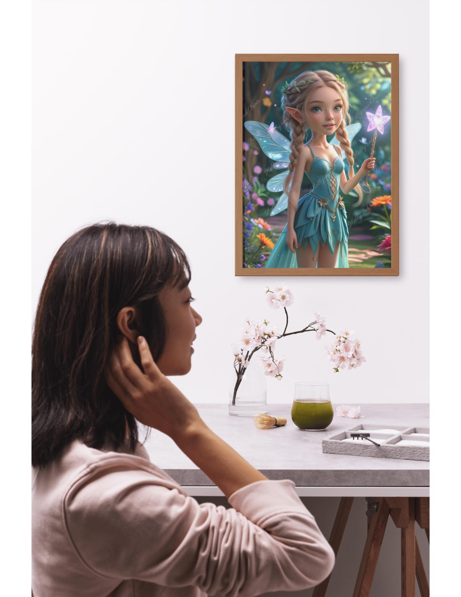 Bring the magic of the forest home with our beautiful diamond painting "Forest Fairy with Magic Wand." The little fairy princess with braided hair, a delicate floral wreath, glittering fairy wings, and a glowing magic wand stands amidst a blooming enchanted garden. This imaginative motif is ideal for fairy lovers, nursery decor, or creative gifts.
