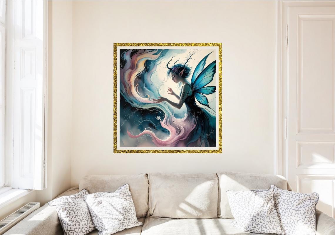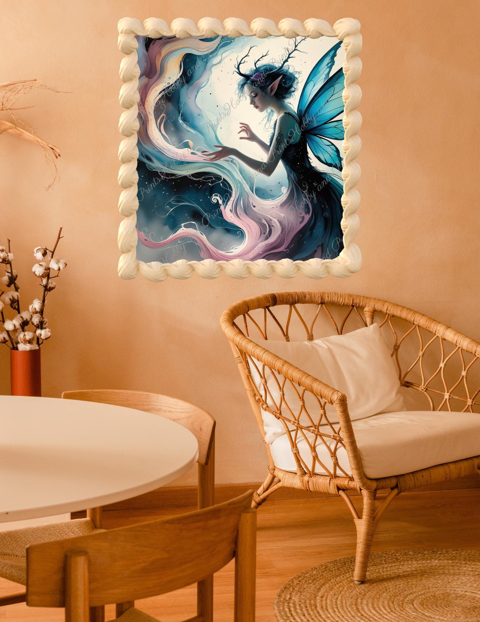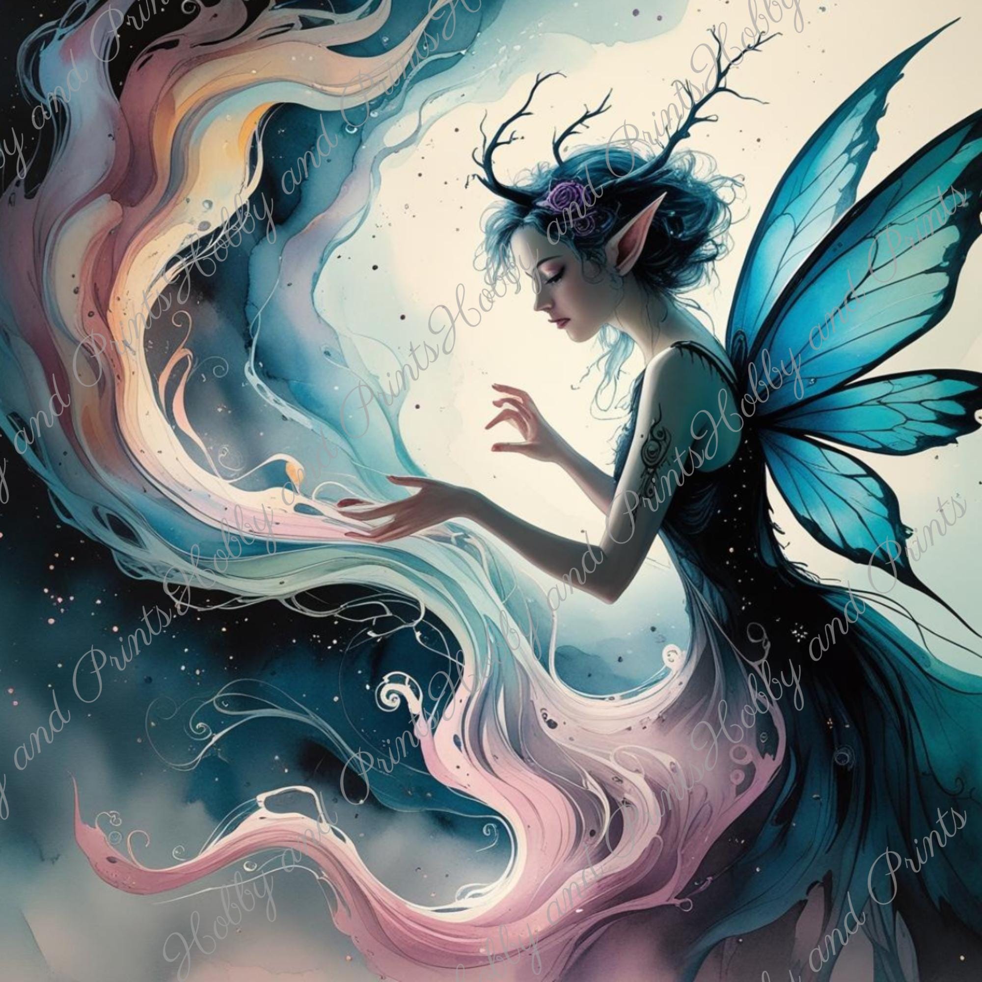 This high-quality diamond painting "Magical Night Fairy" depicts a mysterious forest elf with bright blue wings, delicate horns, and dancing magical swirls of light. The fantasy motif instantly draws you into a dreamy, mystical world.