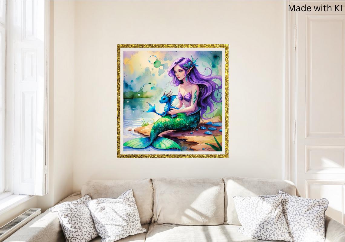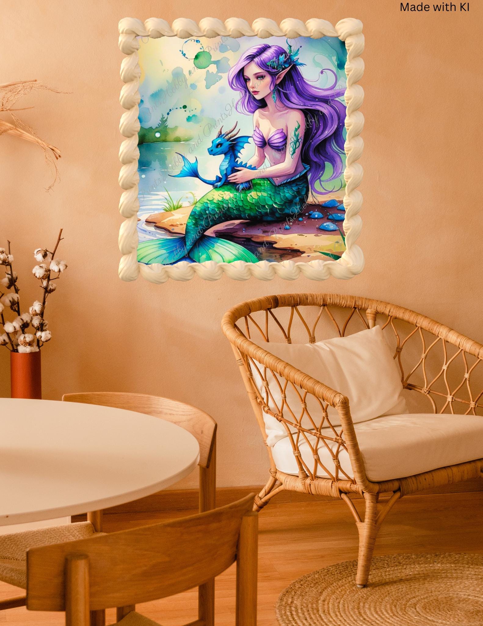 Experience the magic of the sea and fantasy with this unique diamond painting "Mermaid with Baby Dragon"! The mystical mermaid with her vibrant purple hair sits by the water with a cute blue dragon on her lap โ an absolute eye-catcher for all fantasy fans!