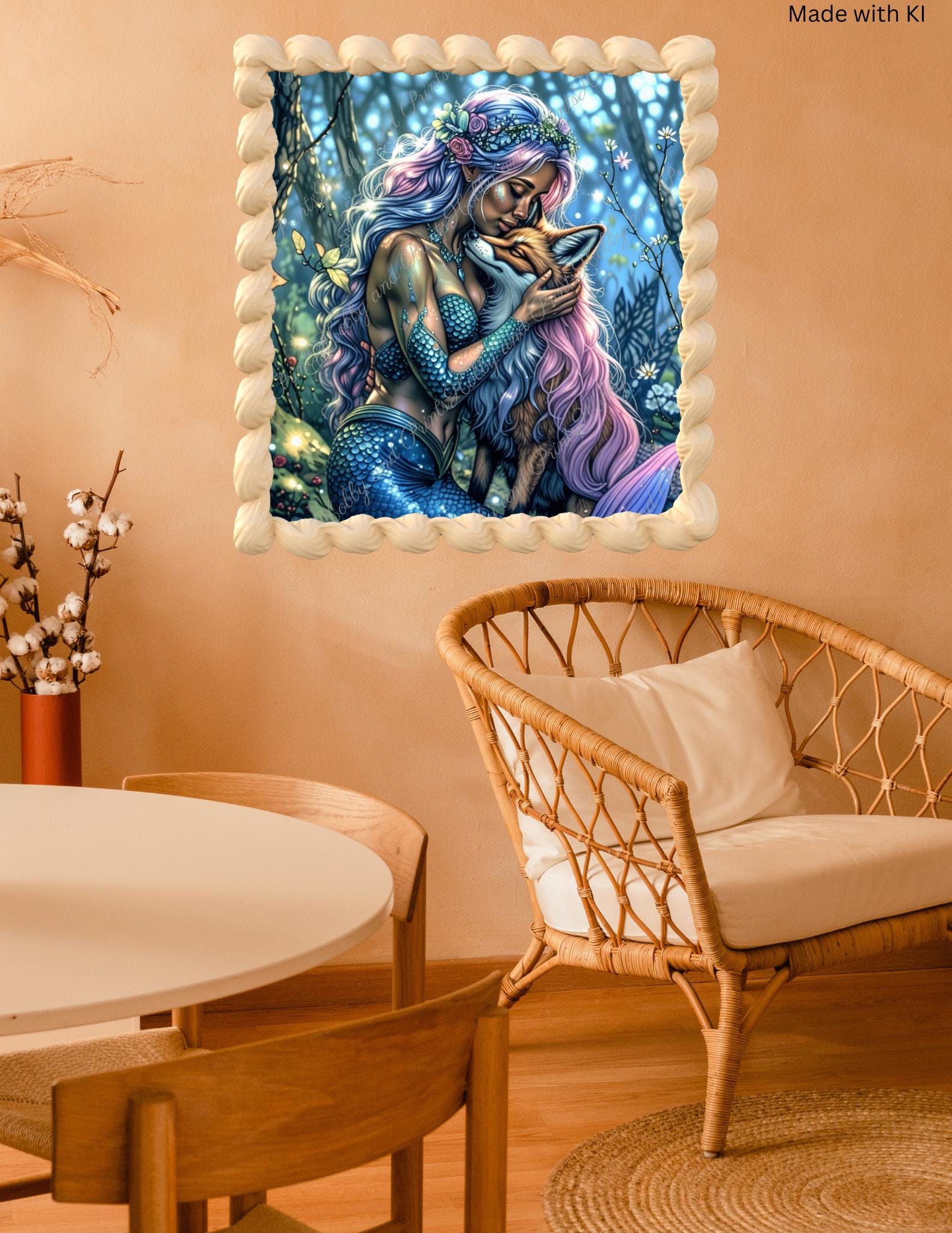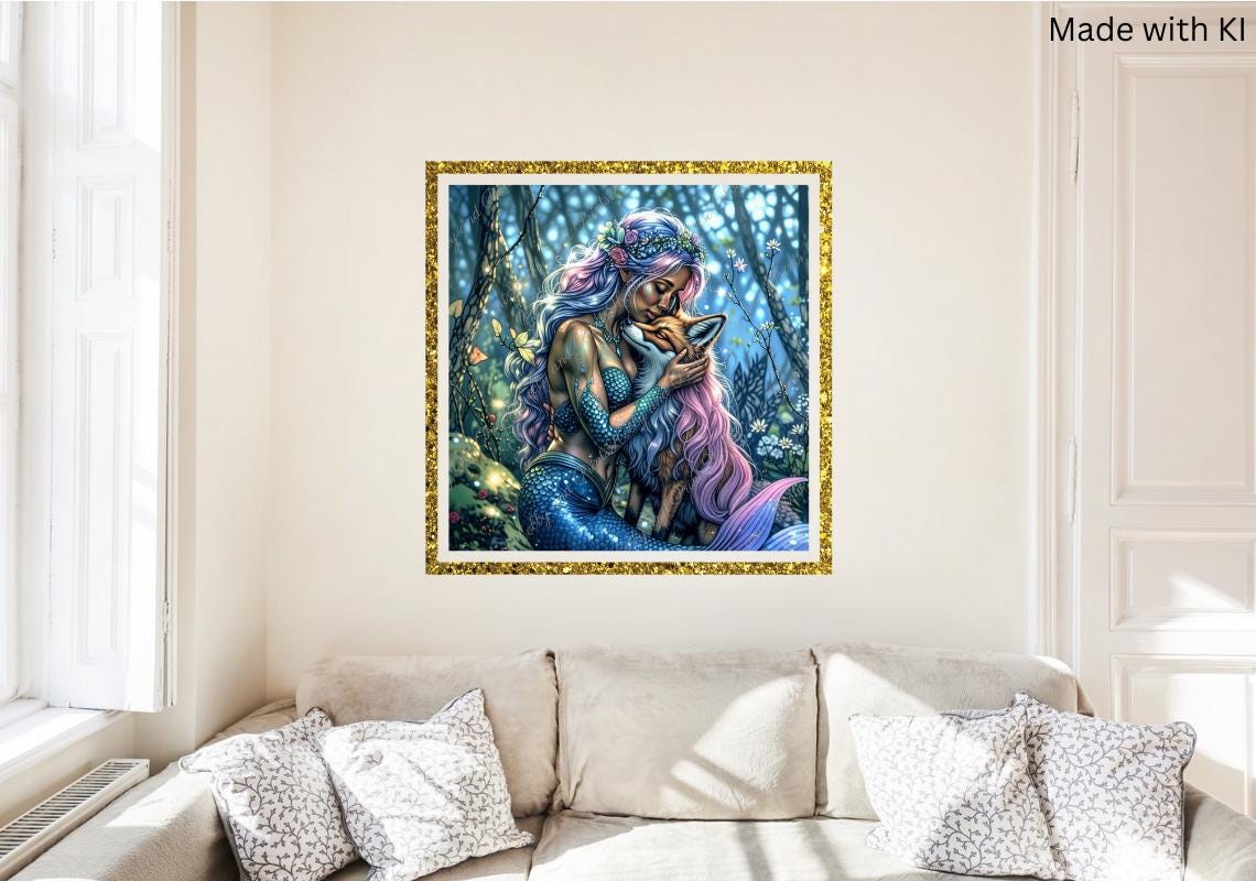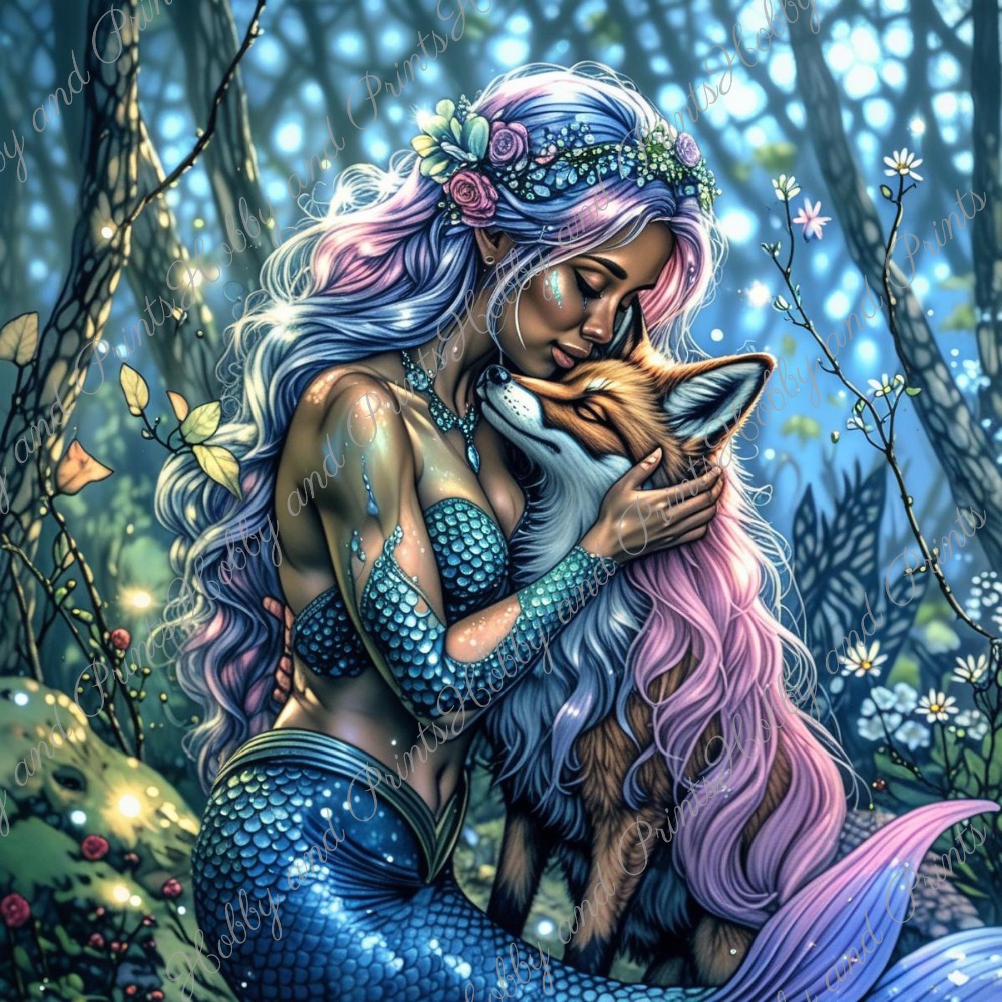 Immerse yourself in a world of fantasy with this high-quality diamond painting "Mermaid with Fox." The motif depicts a tender moment in an enchanted forest: a mermaid with shimmering scales lovingly embracing her animal companion. A symbol of harmony, trust, and magic.