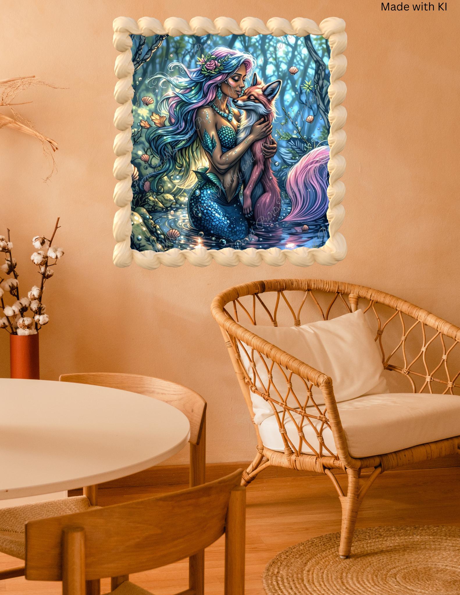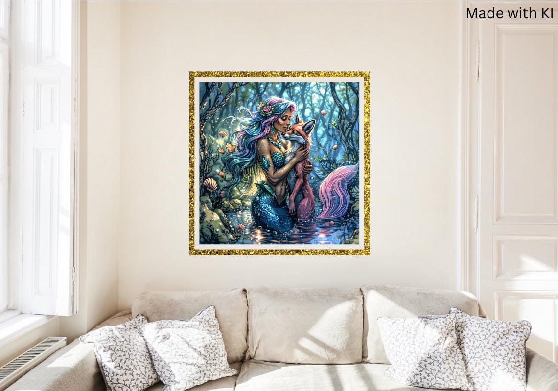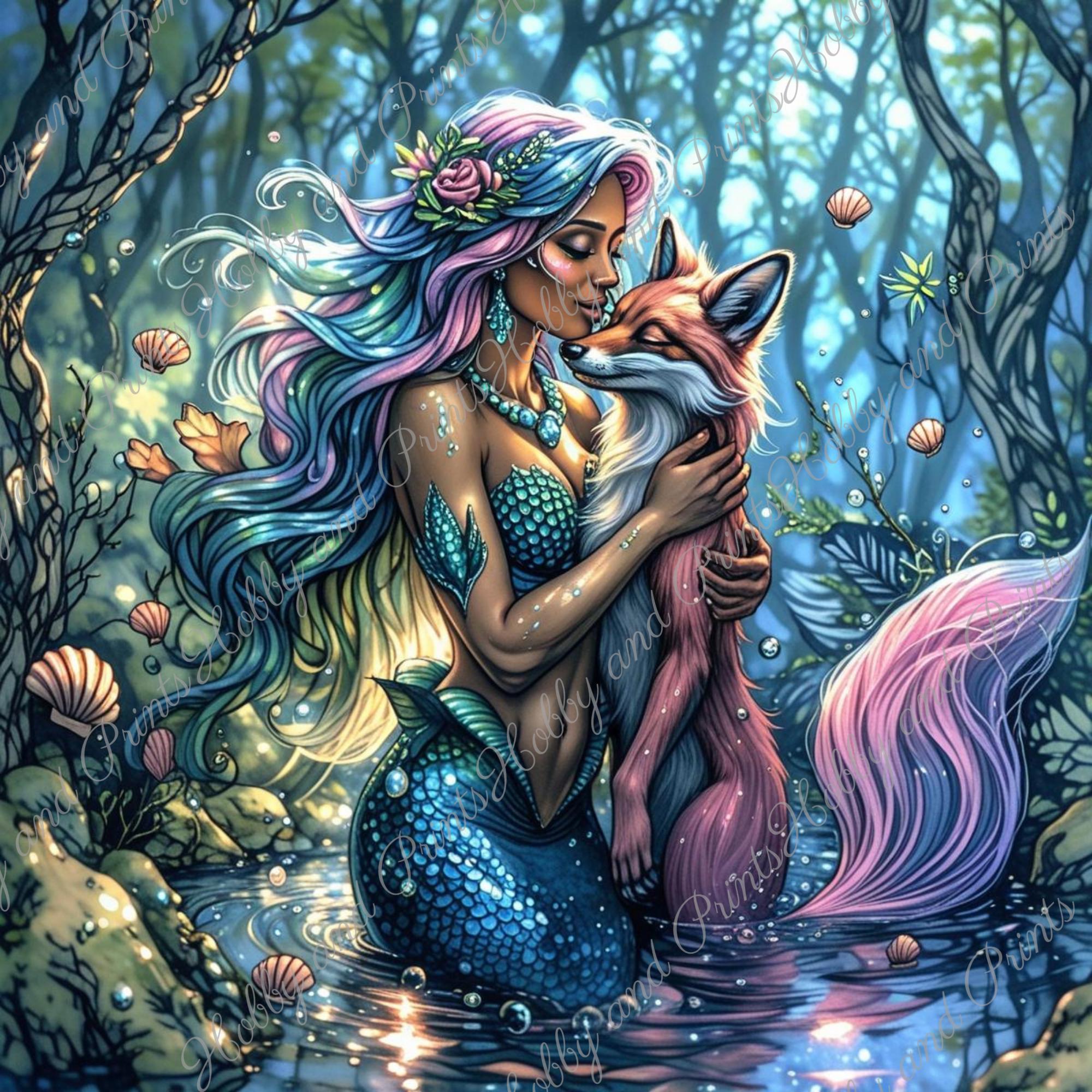 This meticulously detailed diamond painting "Mermaid with Fox in the Water" is a highlight for all fantasy and nature lovers. In the midst of a fairytale forest, a graceful mermaid embraces her faithful companion β an elegant fox with a glowing tail. A scene full of harmony, light, and magic.