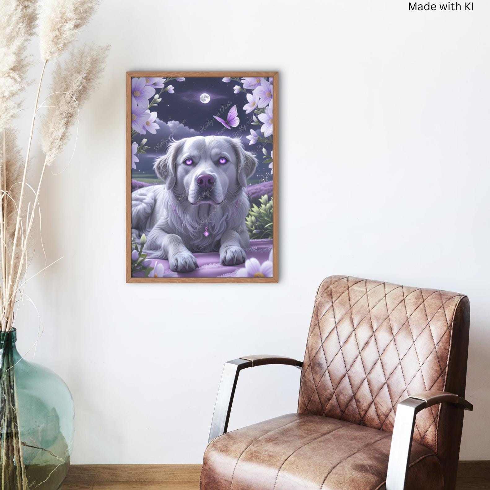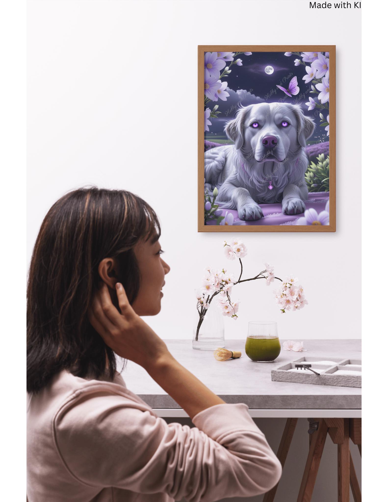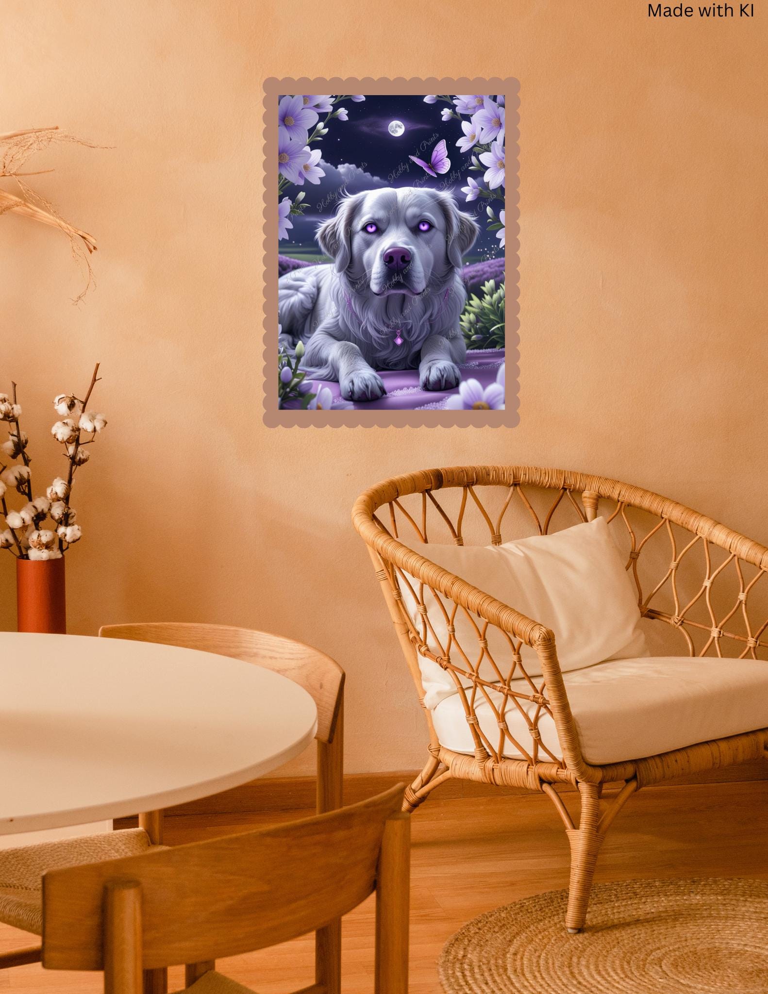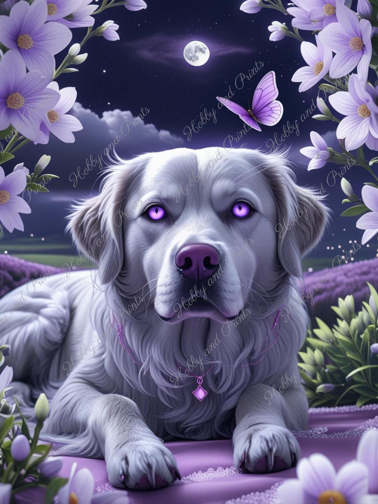 Immerse yourself in the magic of the night with this enchanting diamond painting! The motif depicts an elegant white dog with bright violet eyes, surrounded by delicate flowers and a dreamy night sky. A gentle butterfly dances in the moonlight β a scene full of tranquility, magic, and elegance.