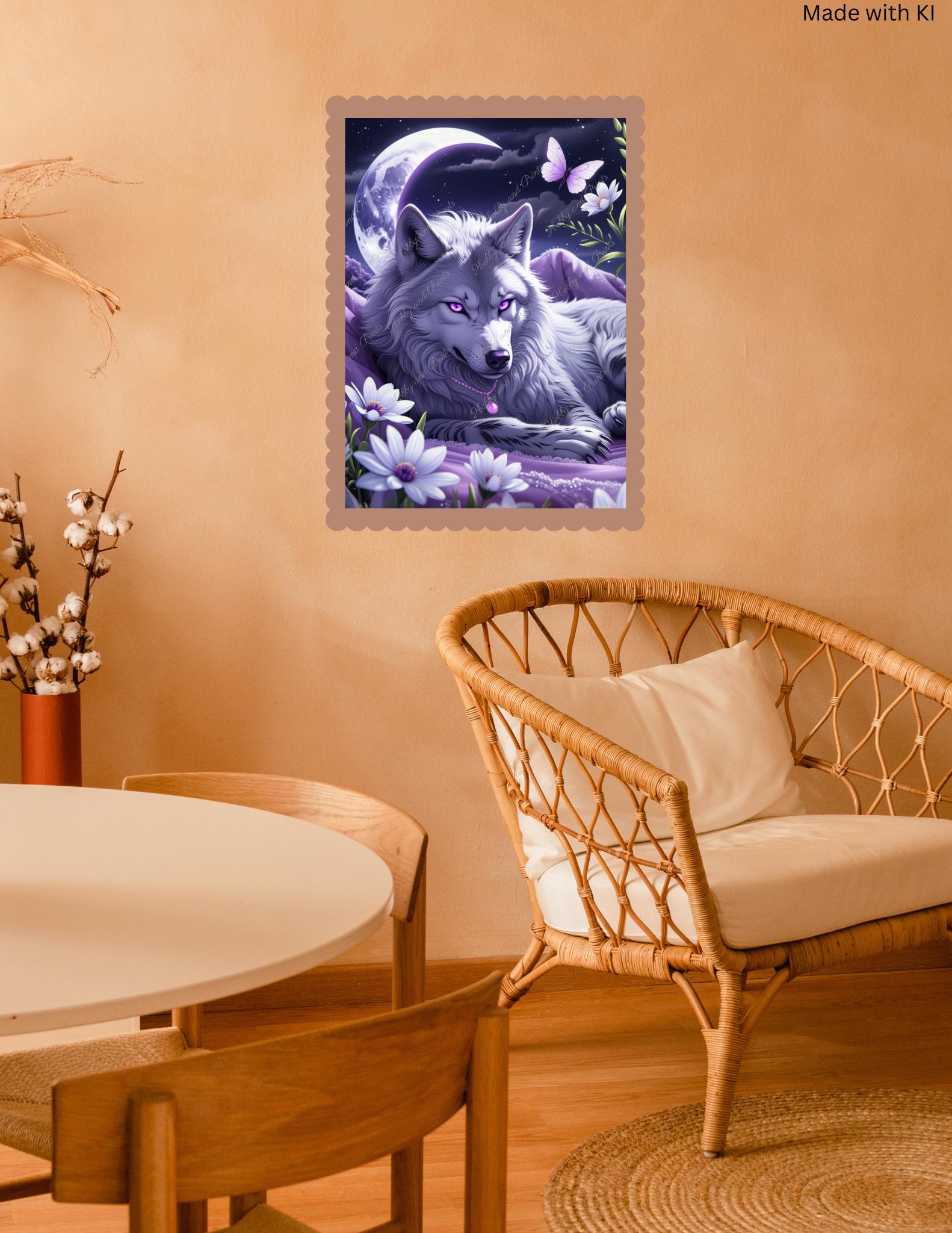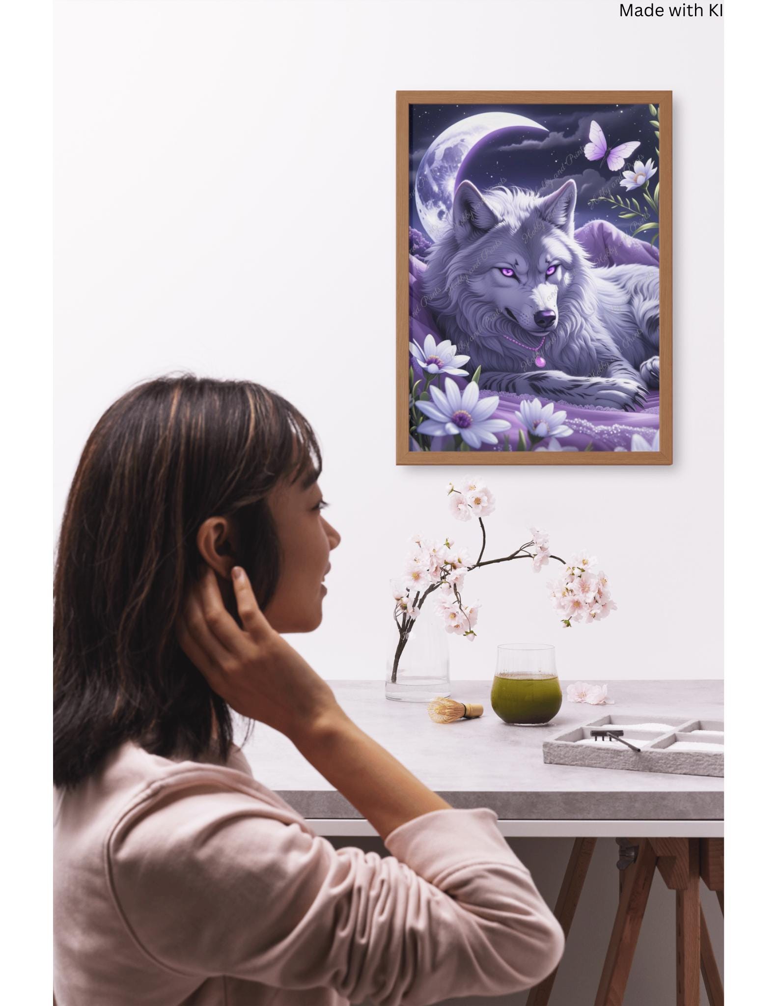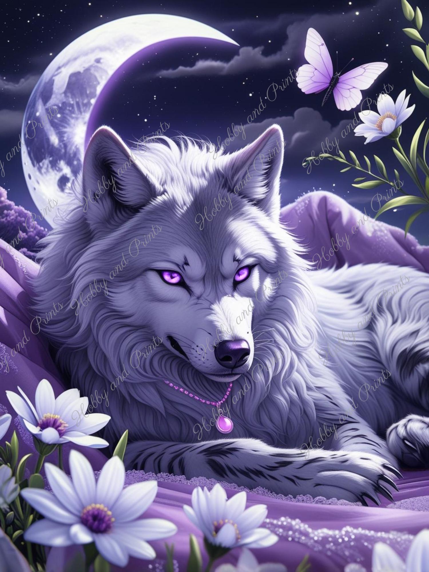 This stunning diamond painting depicts a resting white wolf with intensely vibrant violet eyes, nestled on purple fabric beneath a dreamy night sky with a crescent moon and butterfly.