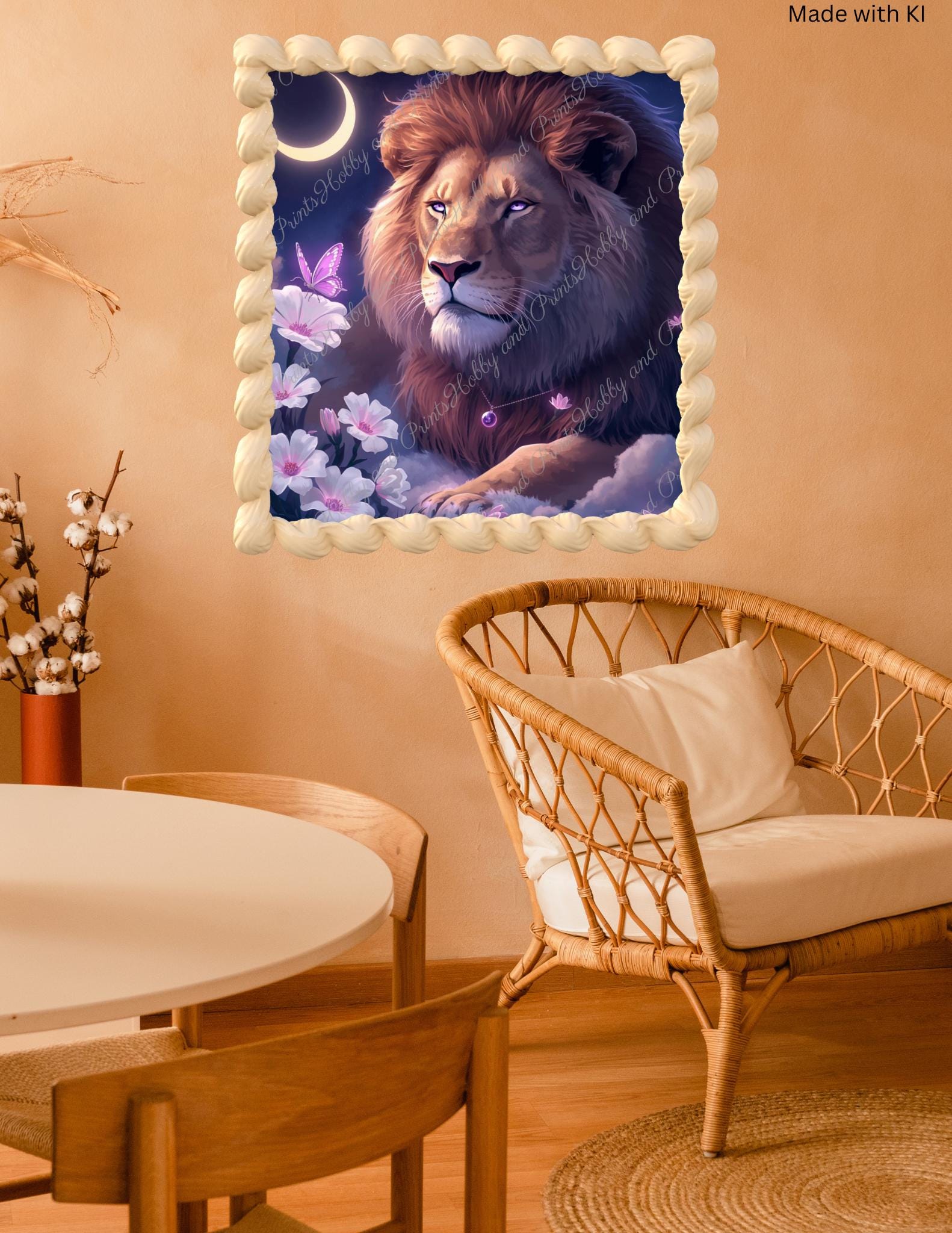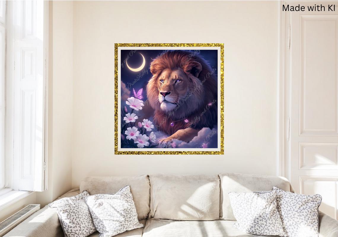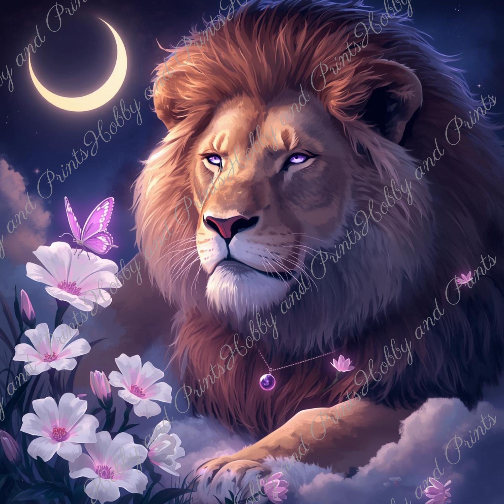 Give your walls a mystical aura with this exclusive diamond painting! The motif features a majestic lion with softly glowing violet eyes, accompanied by a purple butterfly, white flowers, and a golden crescent moon in the night sky. This image combines strength and tranquility, nature and magic β perfect for any creative soul!