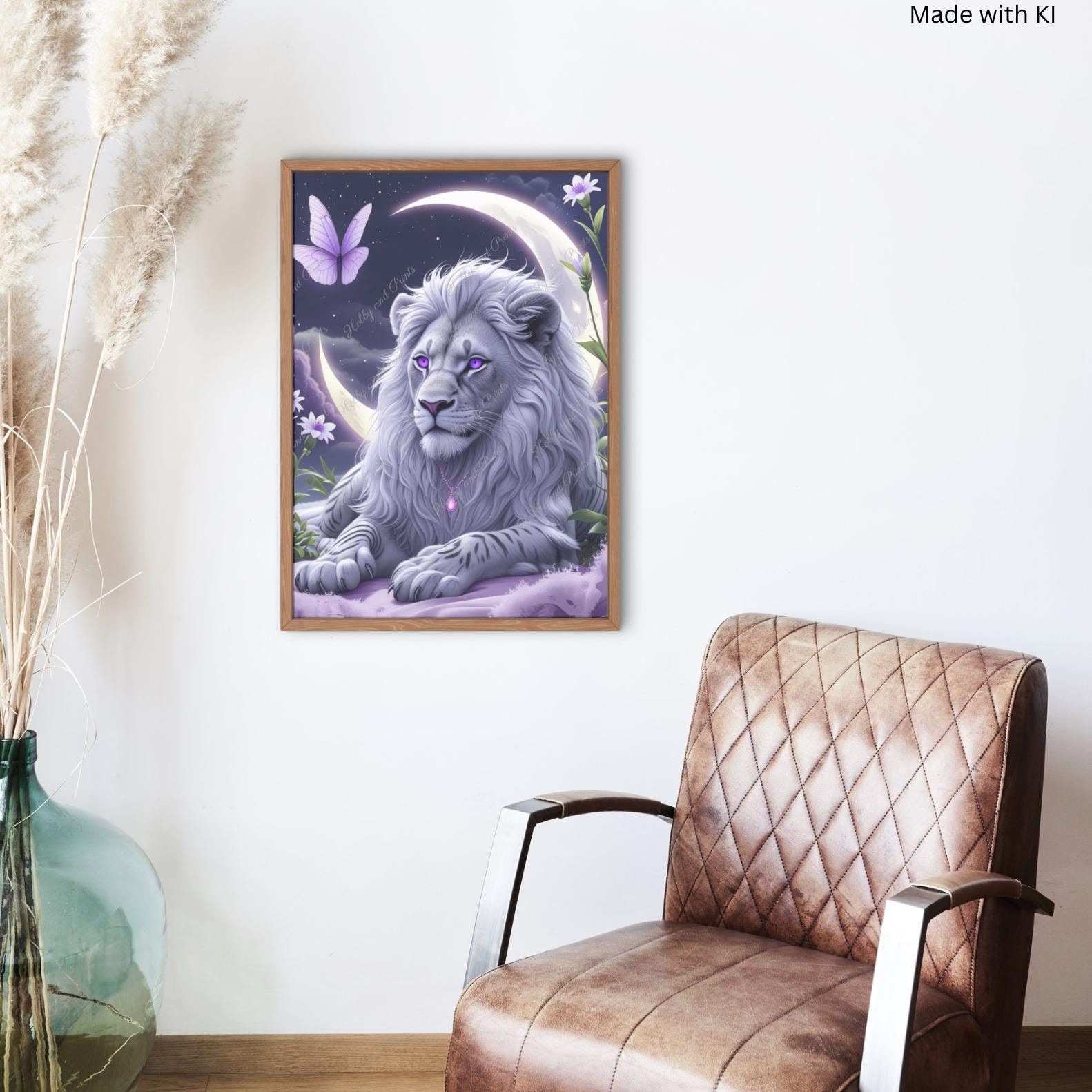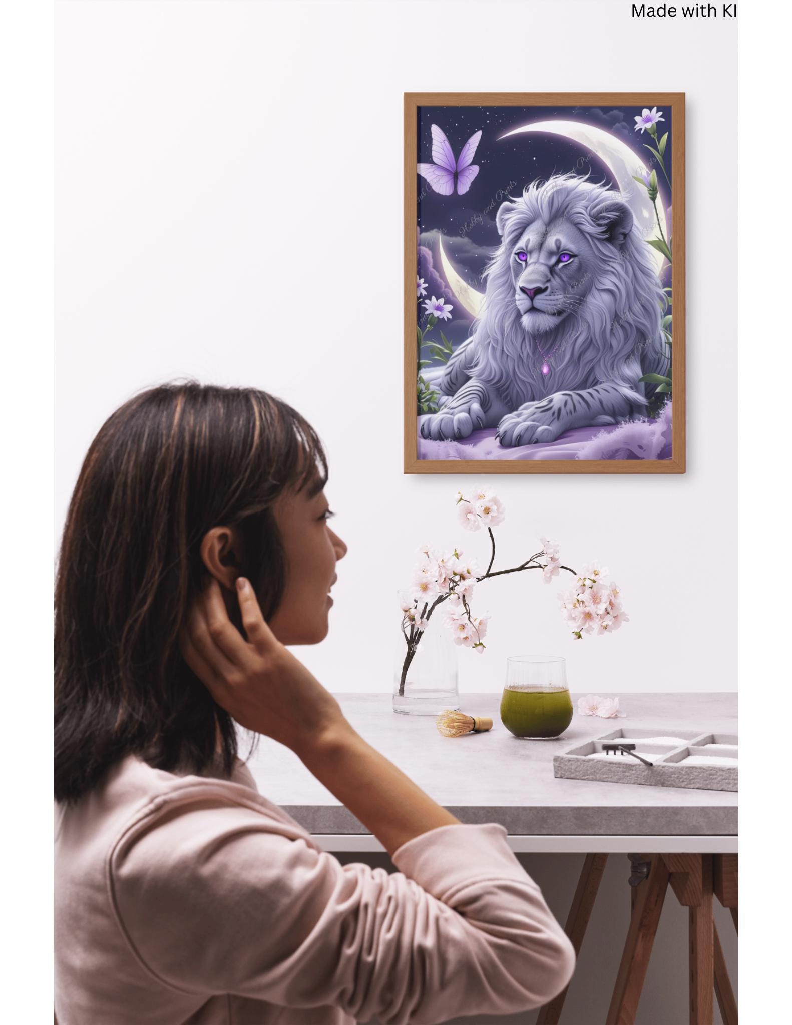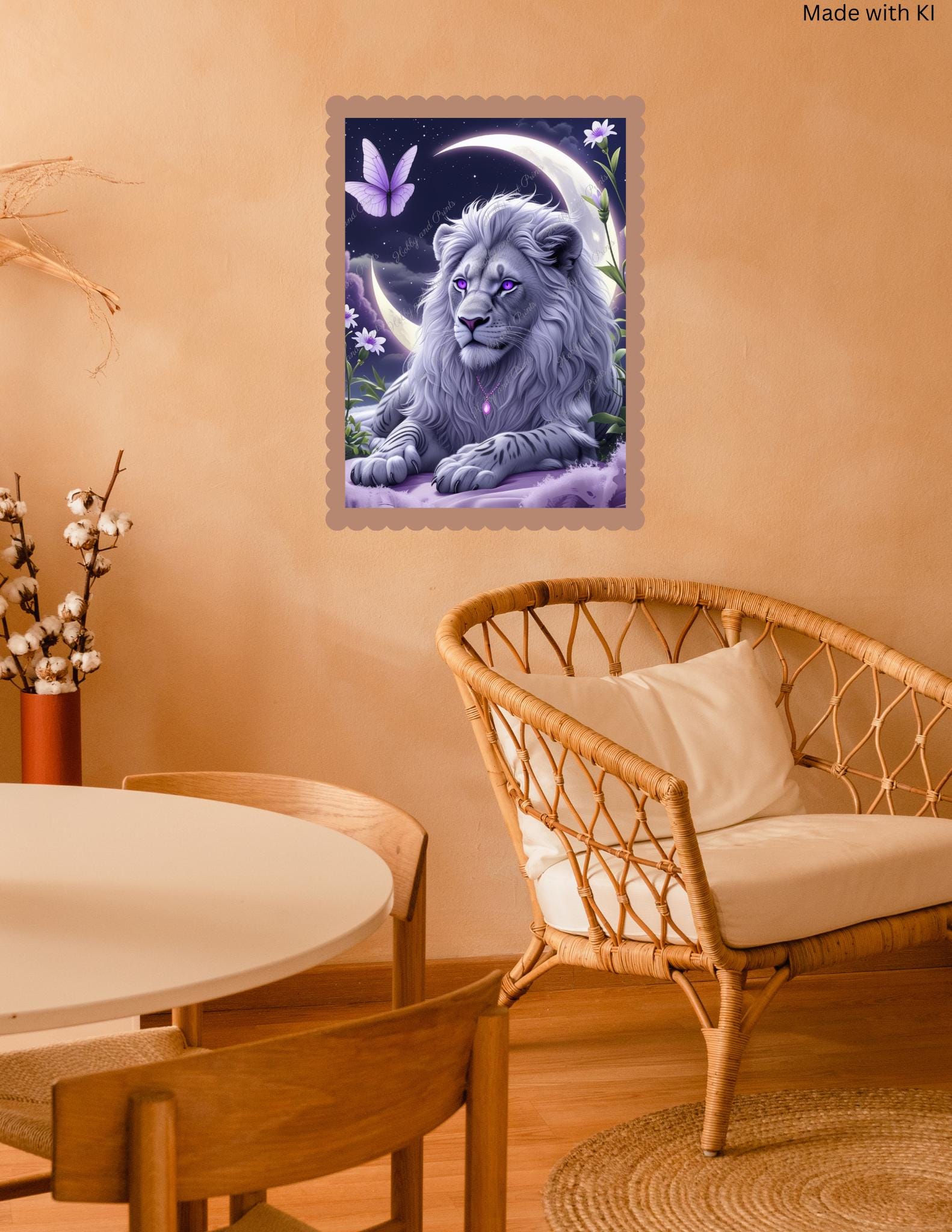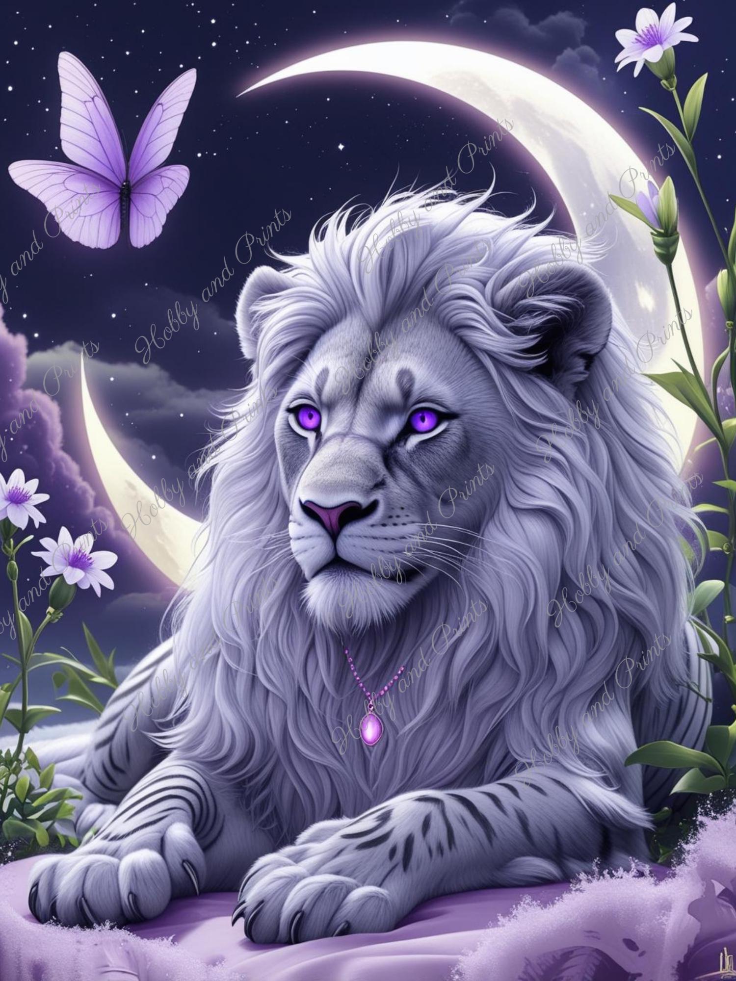 Immerse yourself in the fascinating world of diamond painting with this unique motif: a majestic white lion with brilliant violet eyes rests beneath a luminous moon, while a butterfly dances in the moonlight. This design combines elegance, mysticism, and powerful symbolism—perfect for anyone who loves exceptional artwork.