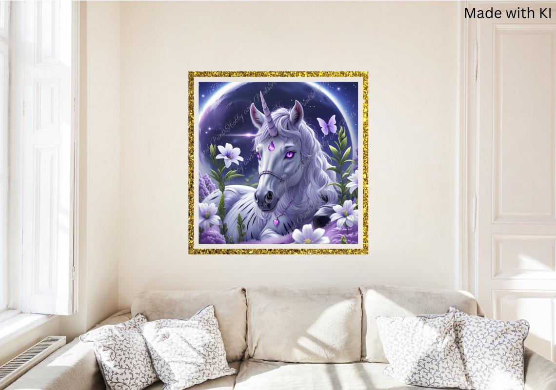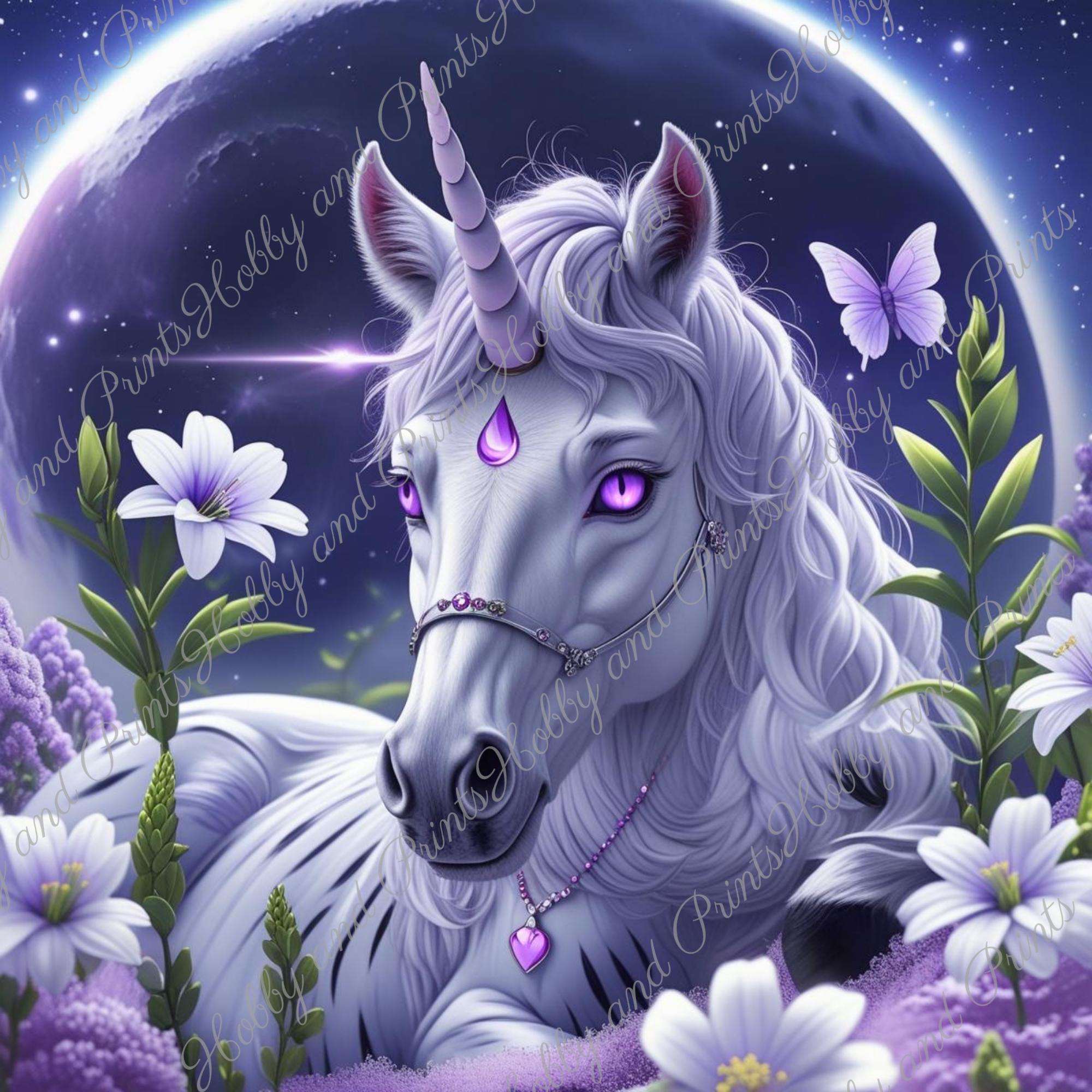 This mesmerizing diamond painting depicts a noble unicorn resting in a field of white and purple flowers. With its bright purple eyes, sparkling jewelry, and the glowing crystal on its forehead, it appears mysterious and majestic. In the background, an enchanting night sky with a moon and butterflies shines β a dream for all fantasy fans.