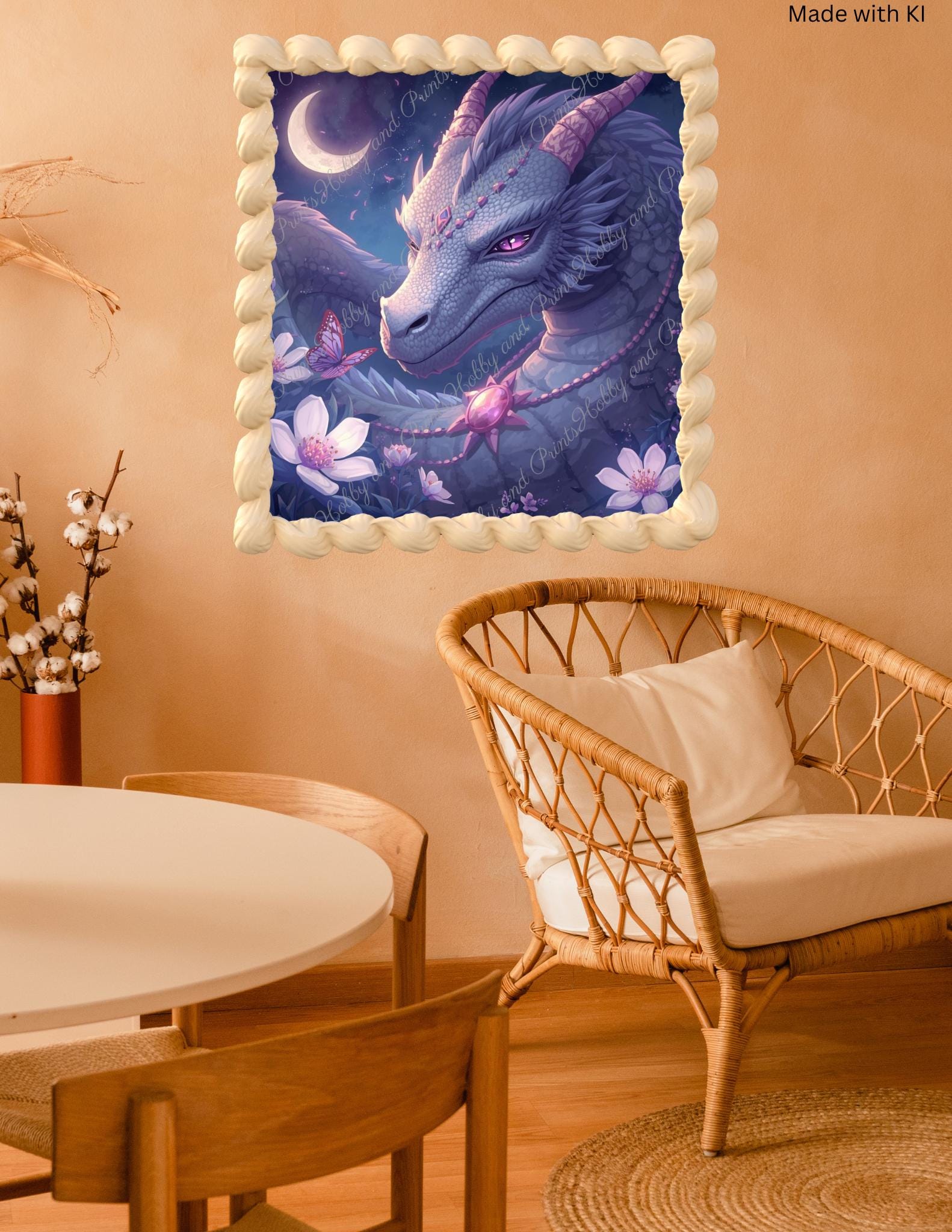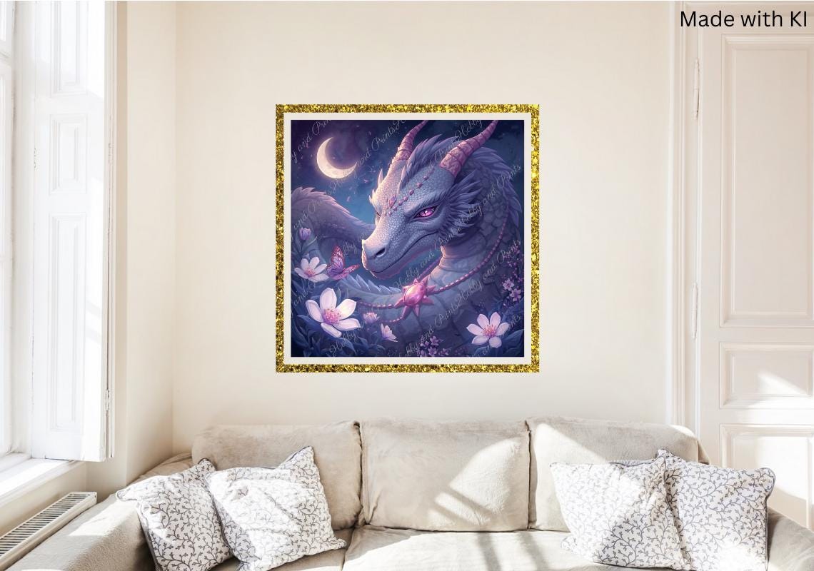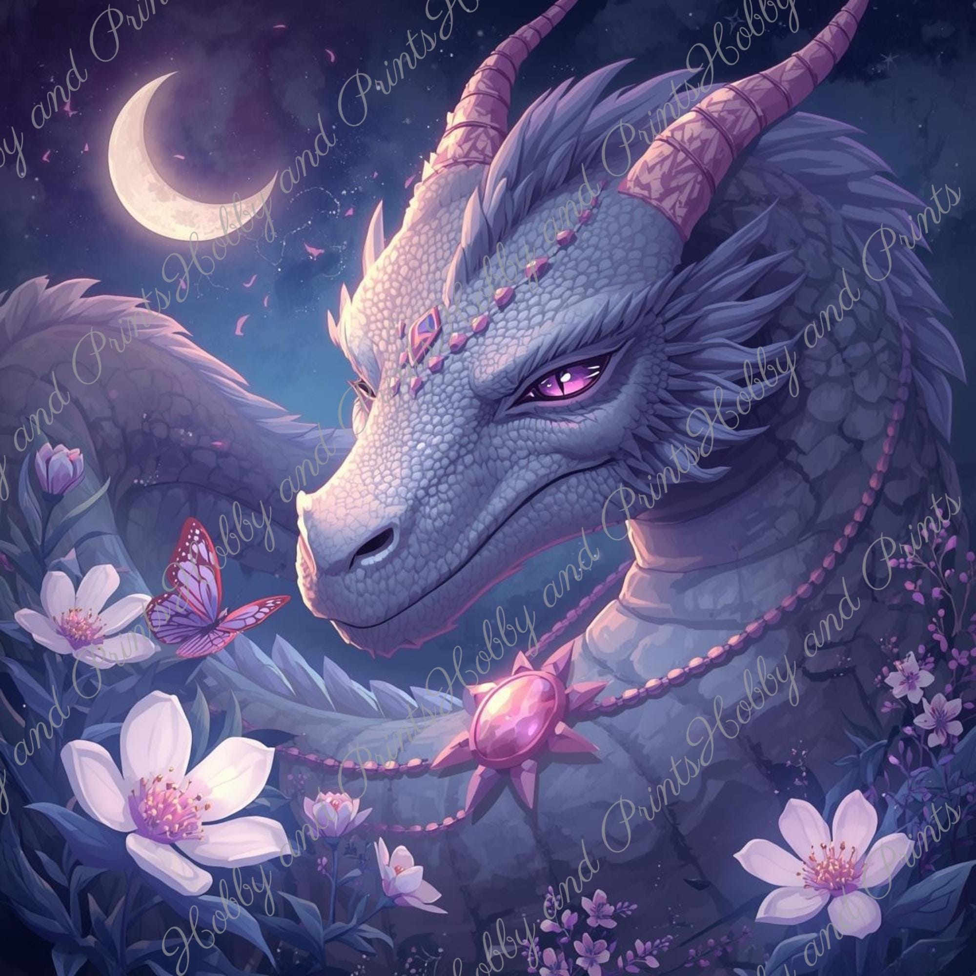 Discover the magic of imagination with this unique diamond painting "Dragon Magic in the Moonlight"! The breathtaking motif depicts a majestic, purple-grey dragon with a sparkling gaze, surrounded by delicate blossoms, a gentle crescent moon, and a butterfly β a true eye-catcher for any wall.