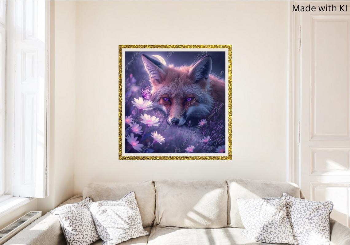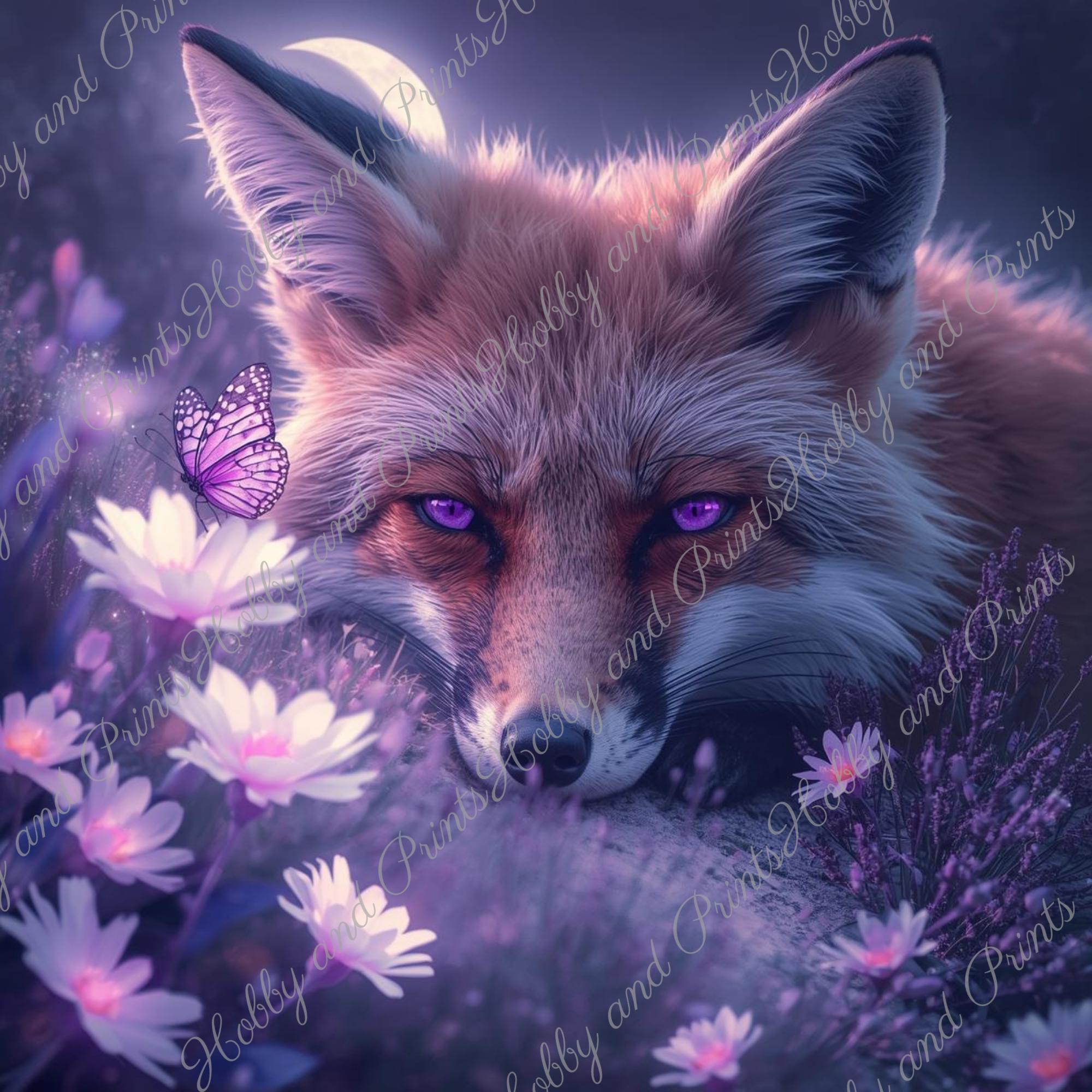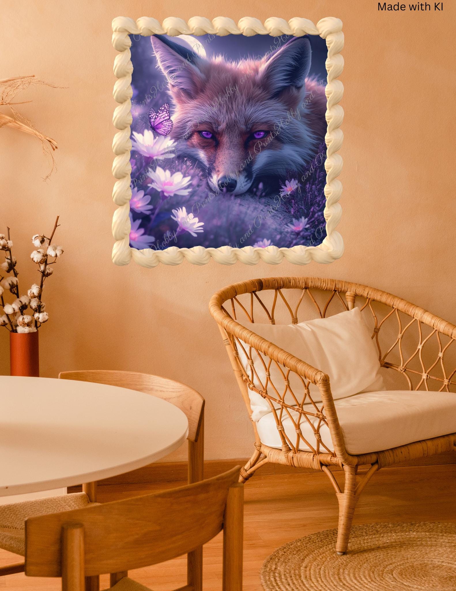 Add a touch of magic to your home with this enchanting "Fox in the Moonlight" diamond painting. The detailed motif depicts a mysterious fox with bright violet eyes, resting among blooming flowers. A delicate butterfly and the gentle moonlit atmosphere make this work a real eye-catcher.