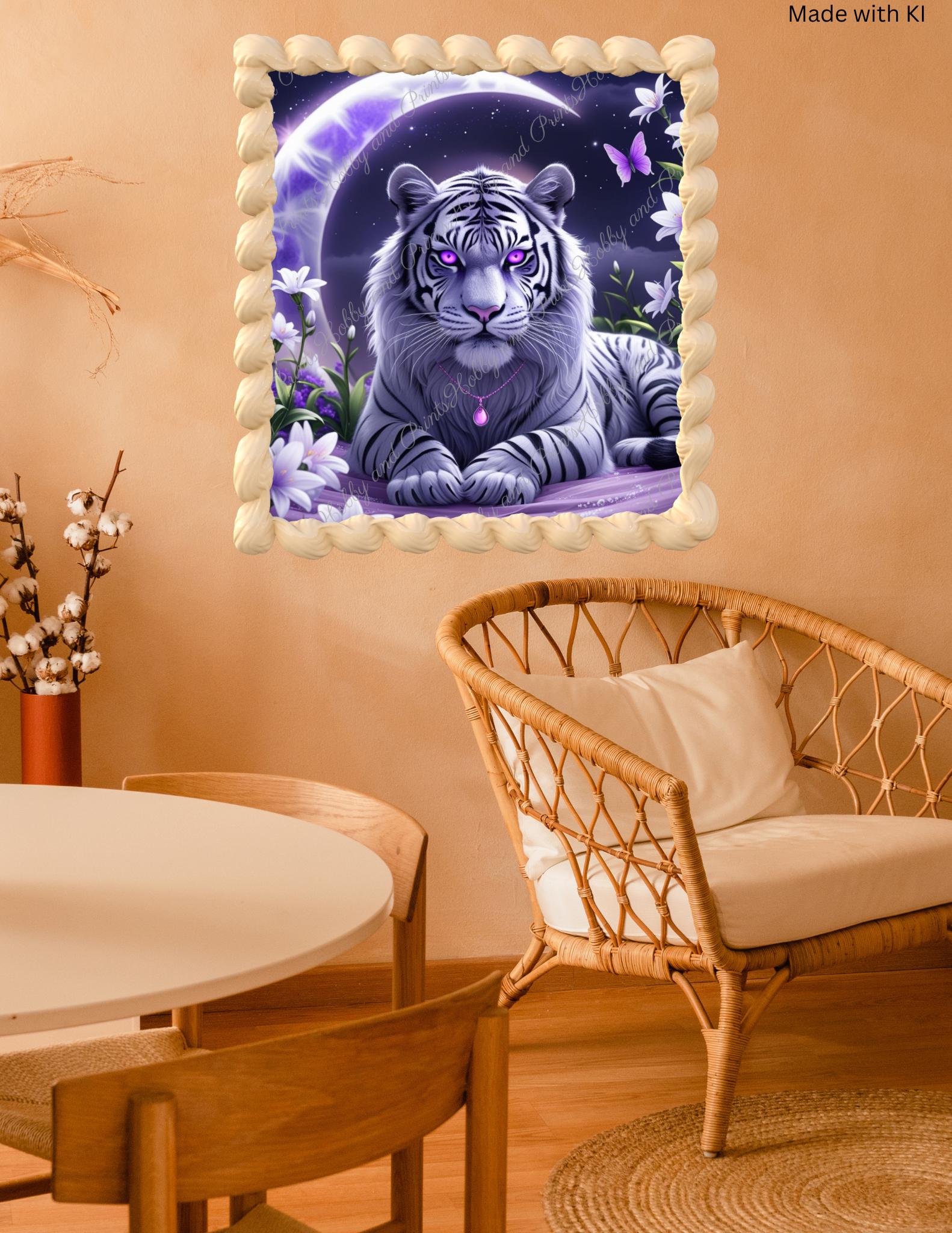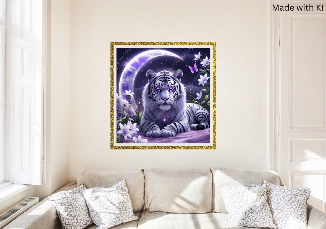 Bring pure magic home with the mesmerizing "White Tiger in the Moonlight" diamond painting! This high-quality DIY kit depicts a proud white tiger with glowing purple eyes resting beneath a mystical crescent moon. Surrounded by delicate flowers and butterflies, it creates a dreamy fantasy motif.