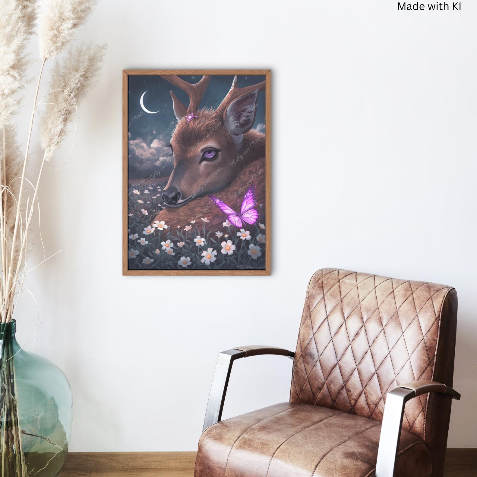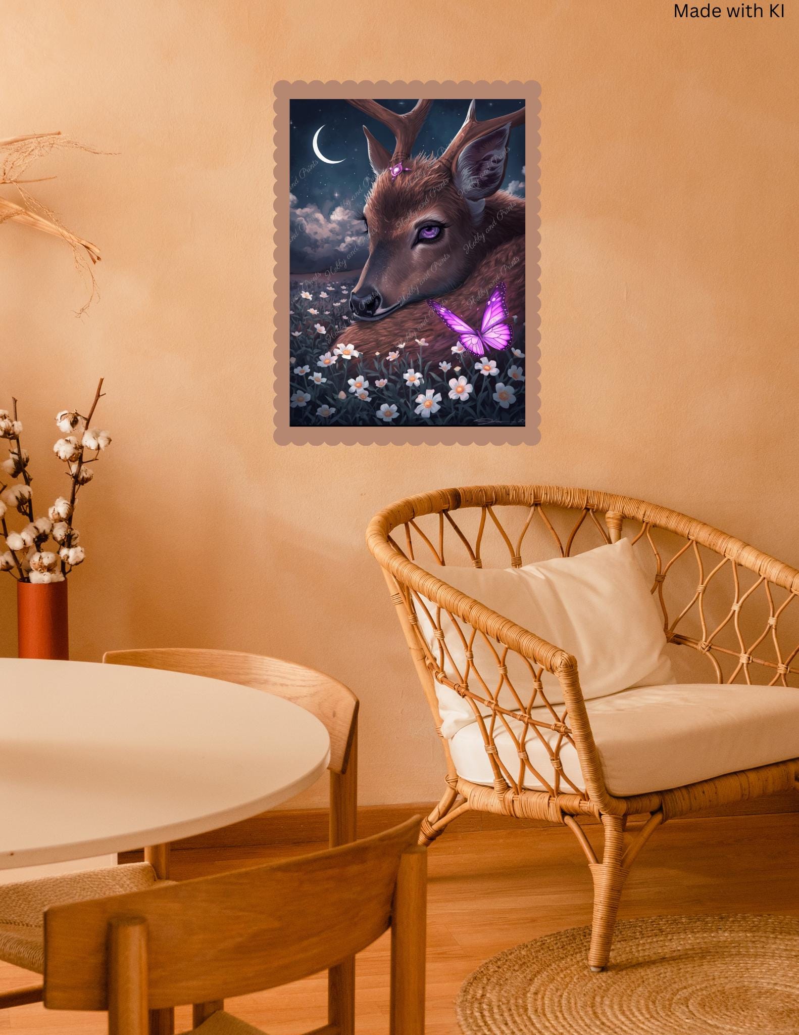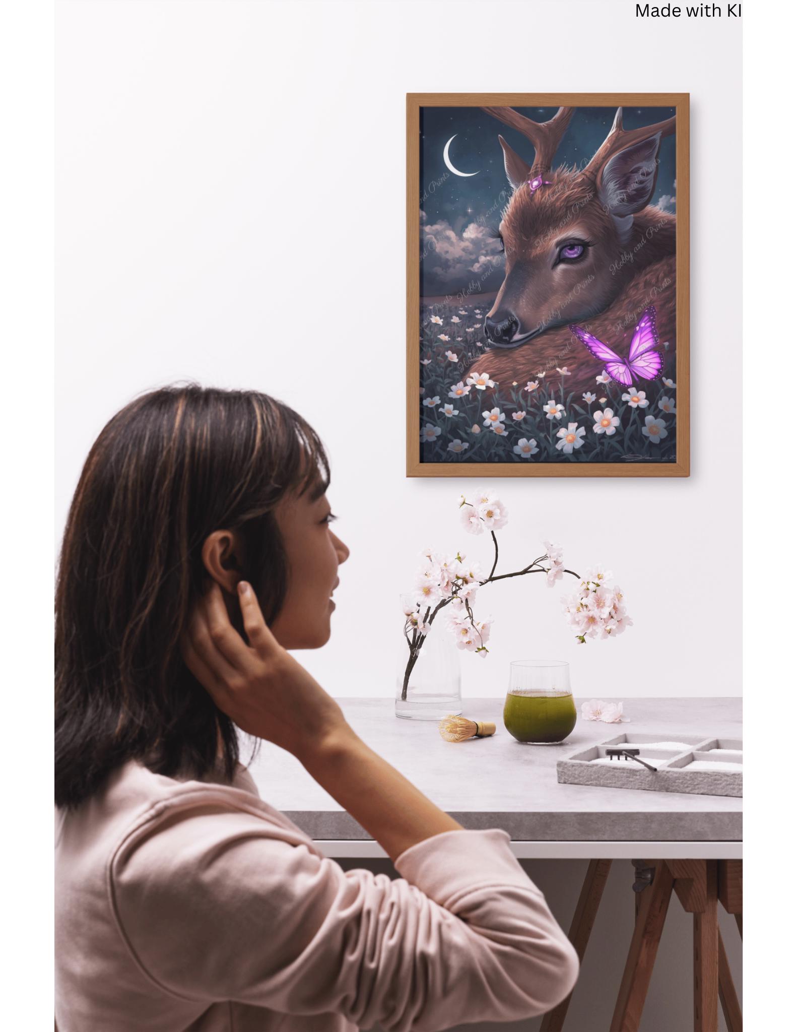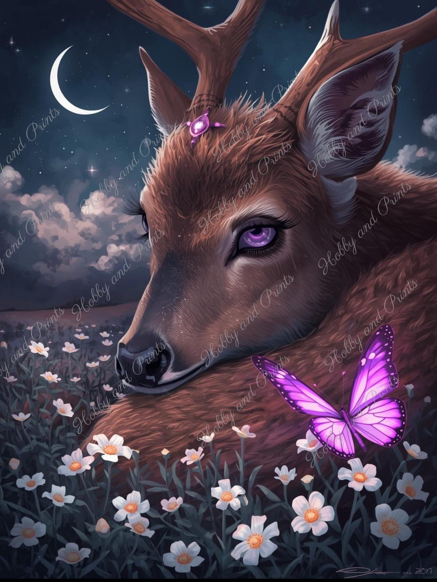 Bring magic and tranquility into your home with this dreamy diamond painting featuring a deer. The peaceful animal lies surrounded by a sea of โโwhite blossoms under a sparkling night sky with a crescent moon. A purple butterfly and a luminous gemstone on its antlers add enchanting accents.