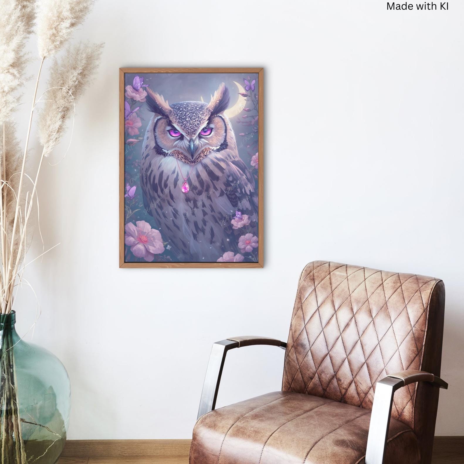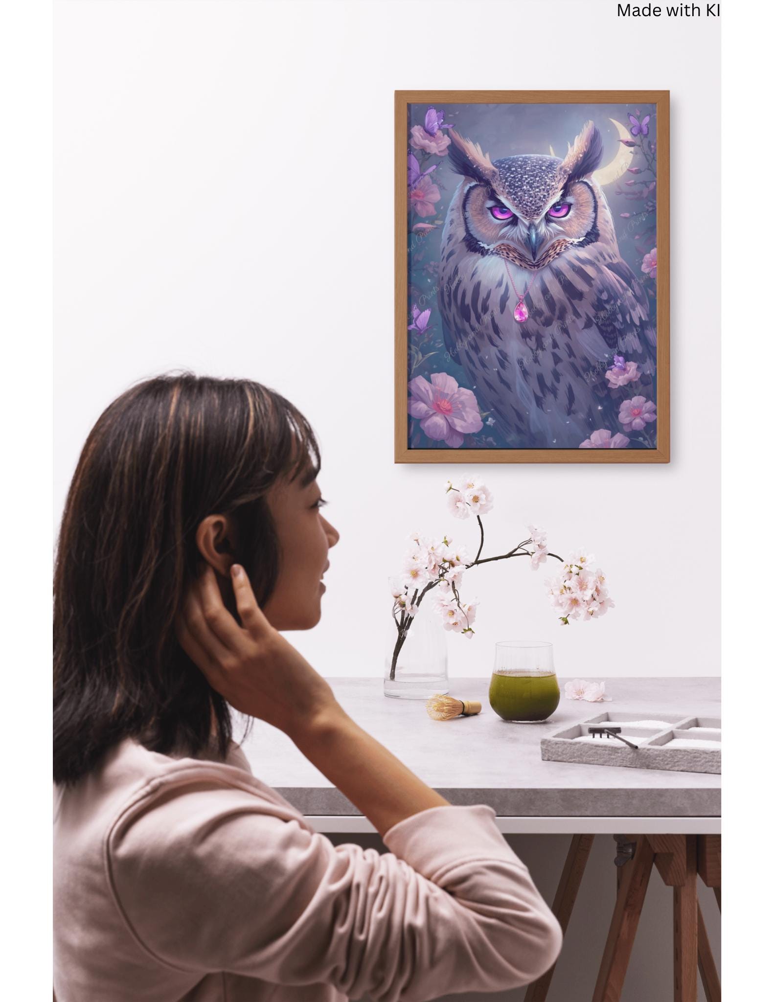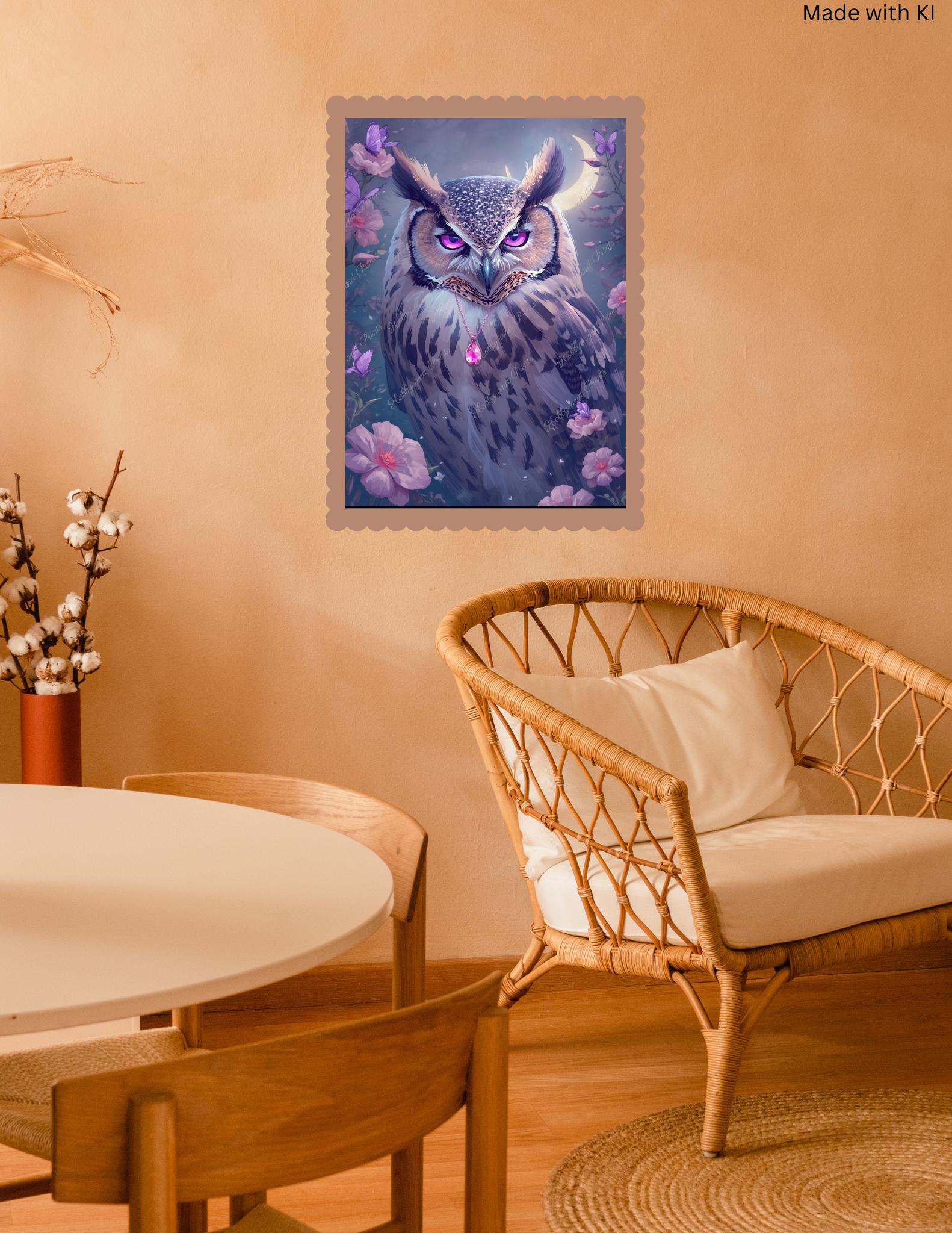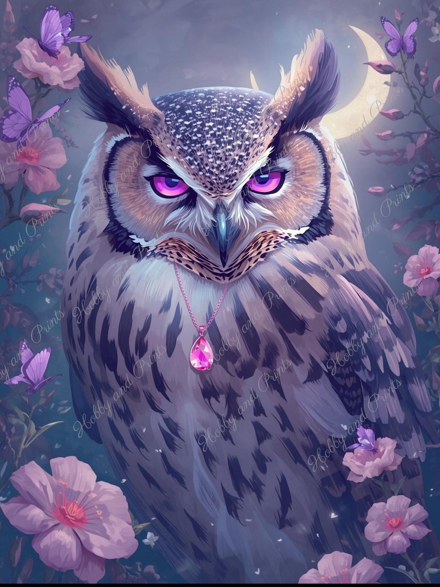 Discover the mesmerizing world of the night with this high-quality diamond painting set β Mystical Owl with Pink Gemstone. The striking owl with intense violet-pink eyes gazes directly at you β surrounded by delicate butterflies, blooming flowers, and a glowing crescent moon in the background.