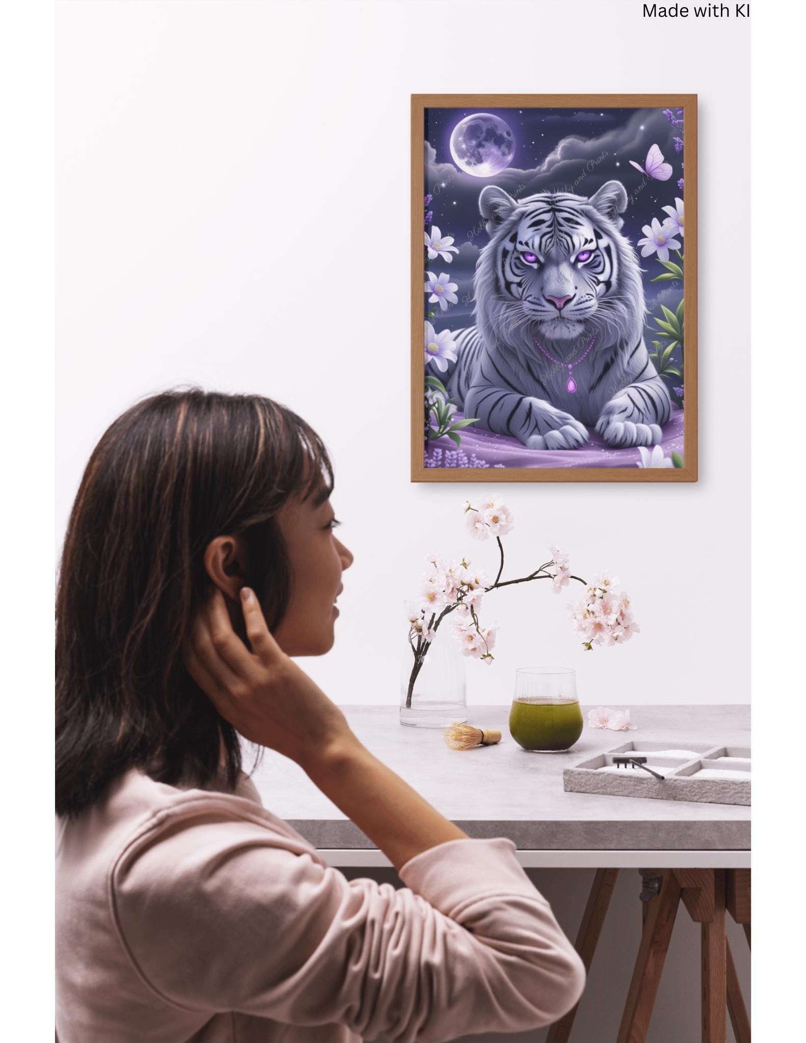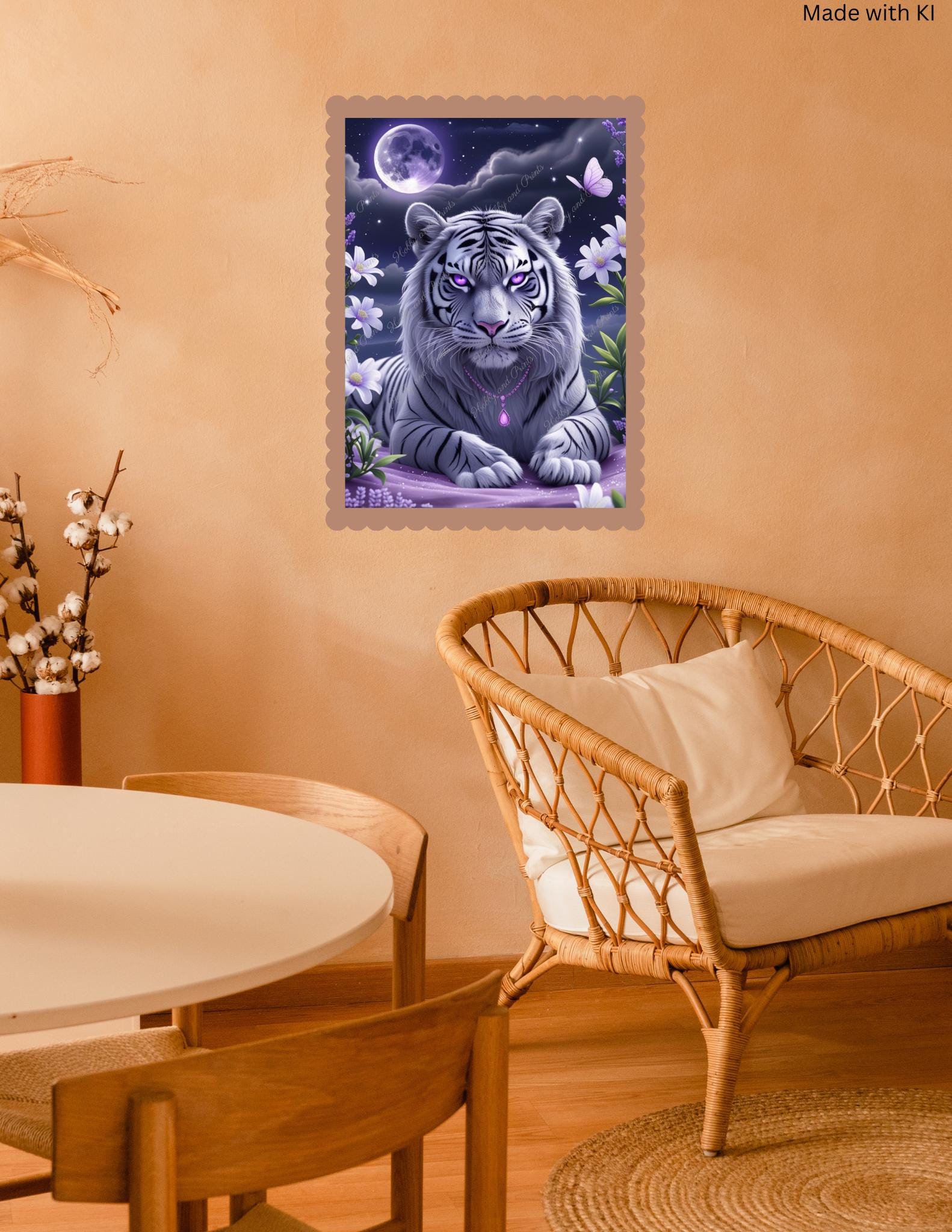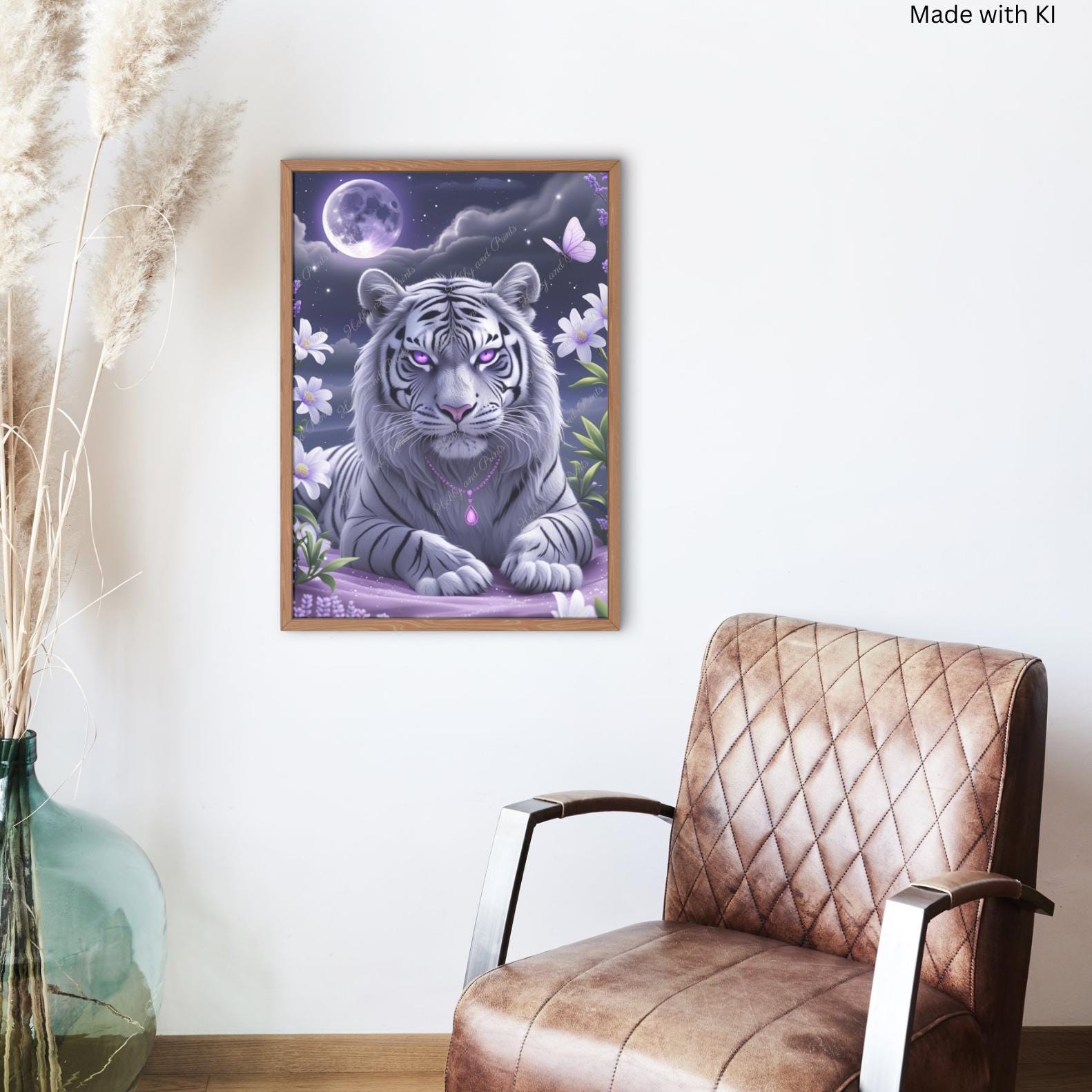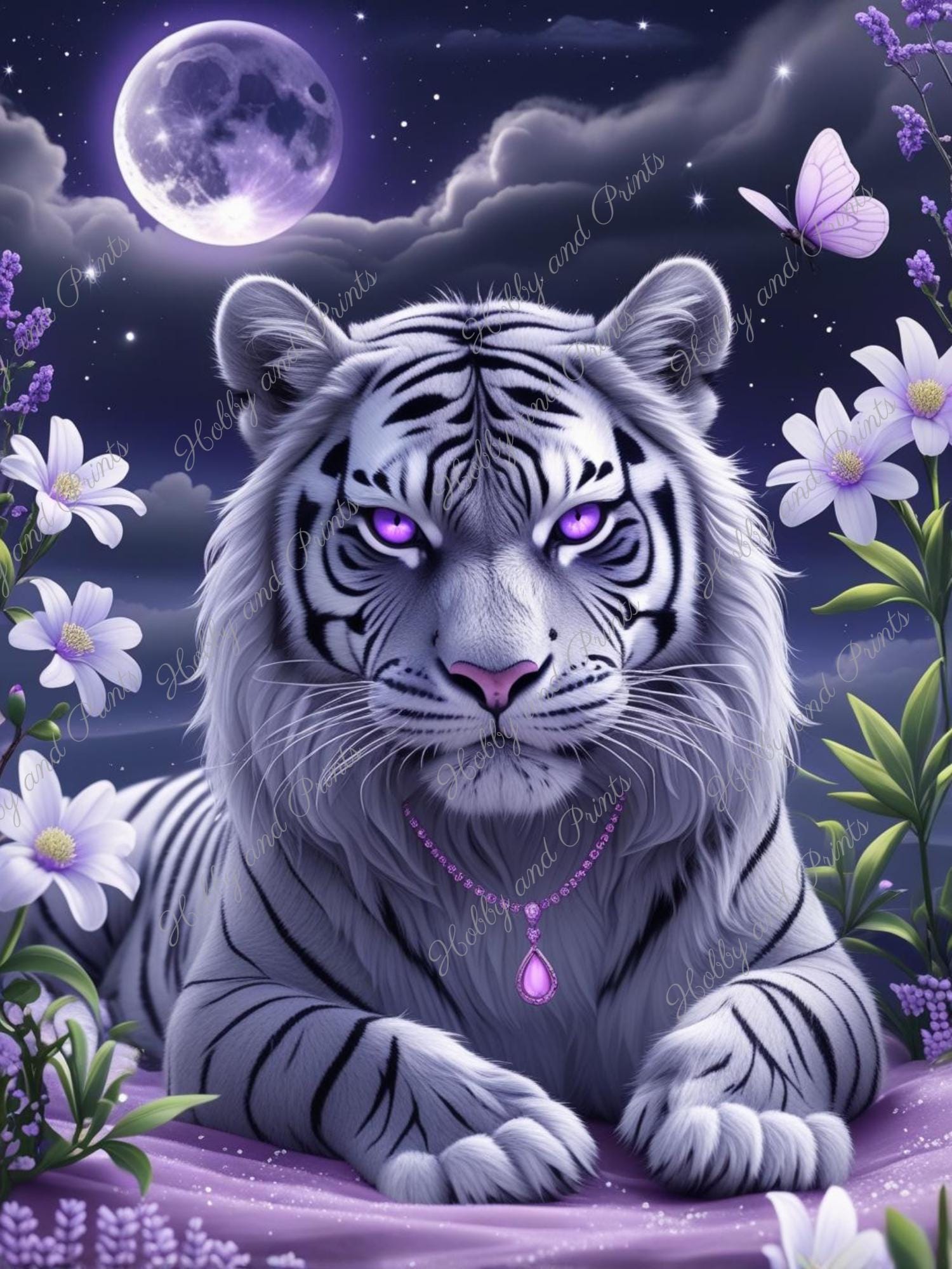 Immerse yourself in the enchanting world of fantasy with this unique 5D diamond painting! The motif depicts a graceful tiger with glowing purple eyes, resting peacefully among blooming flowers under the moonlight. A sparkling crystal pendant and a butterfly lend the image a magical aura.